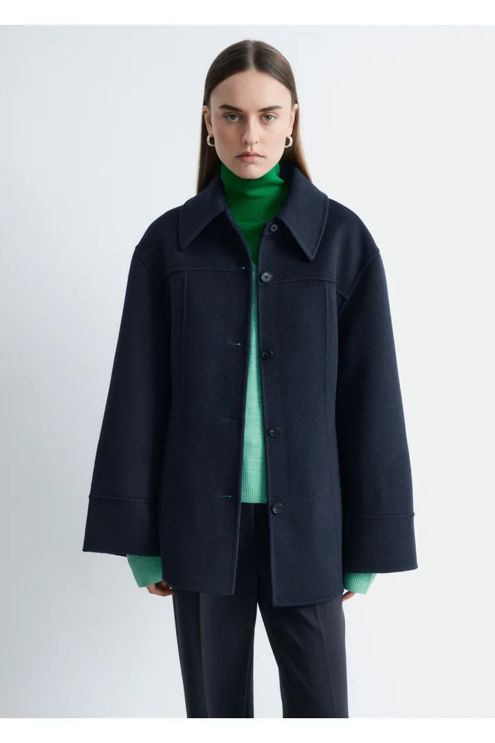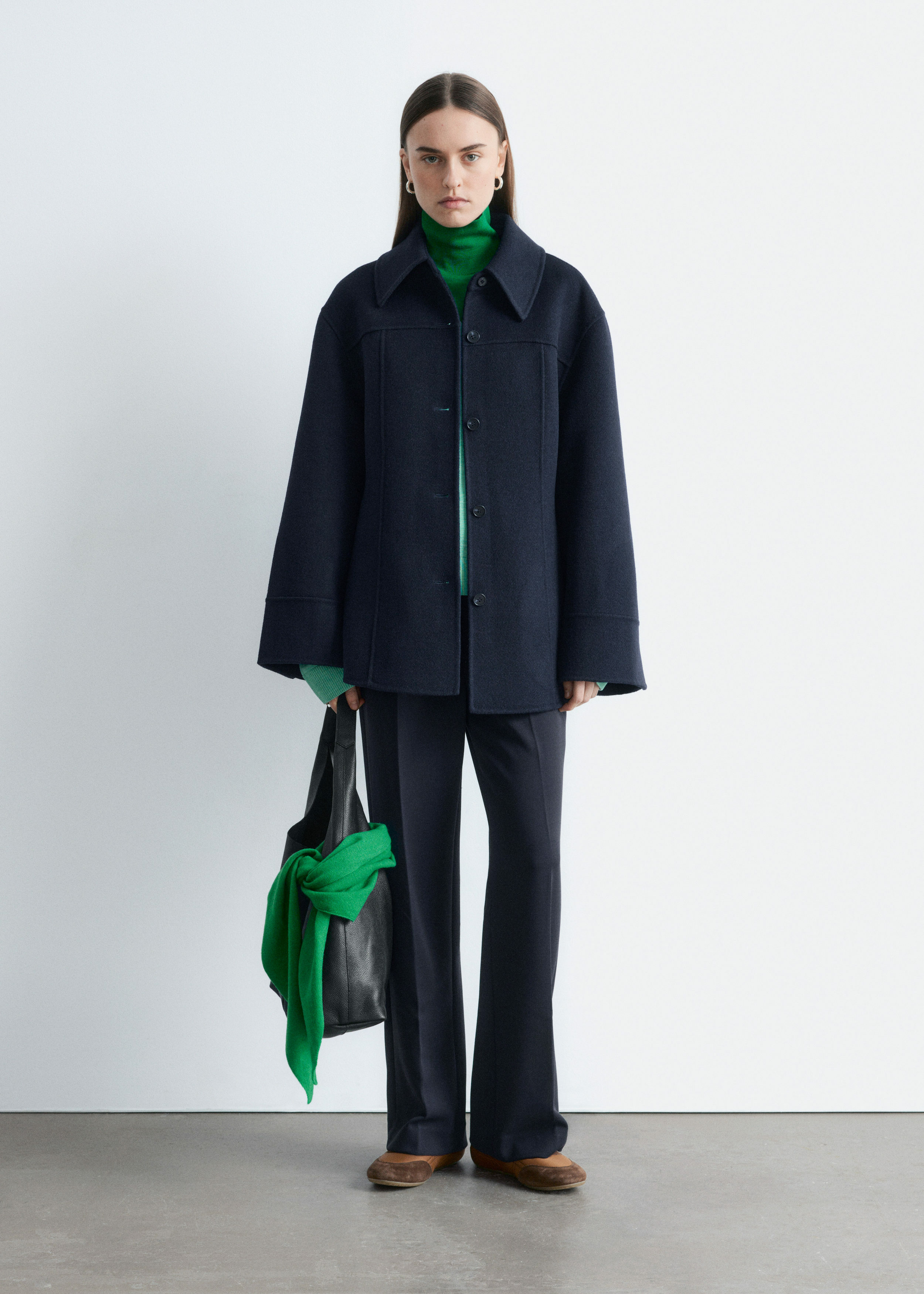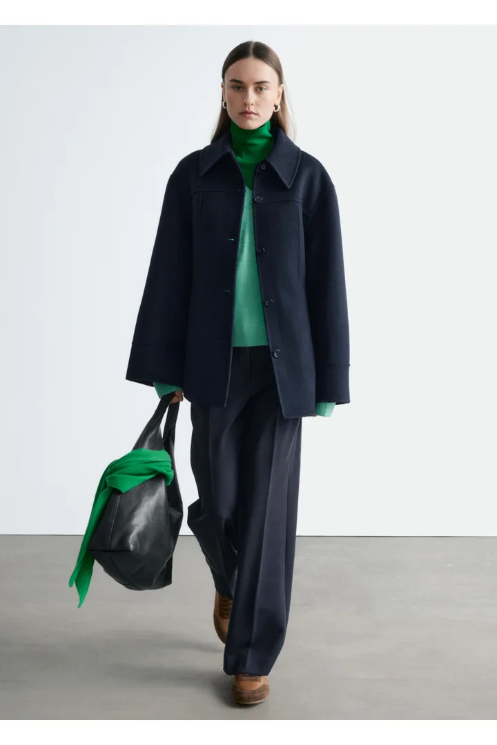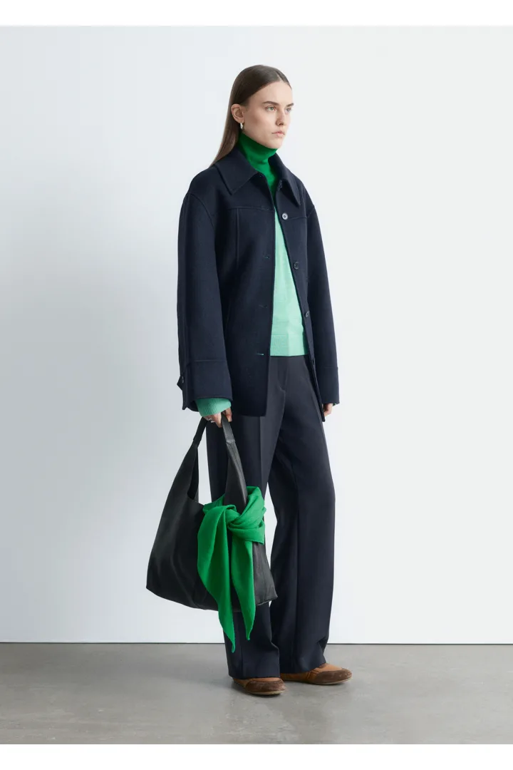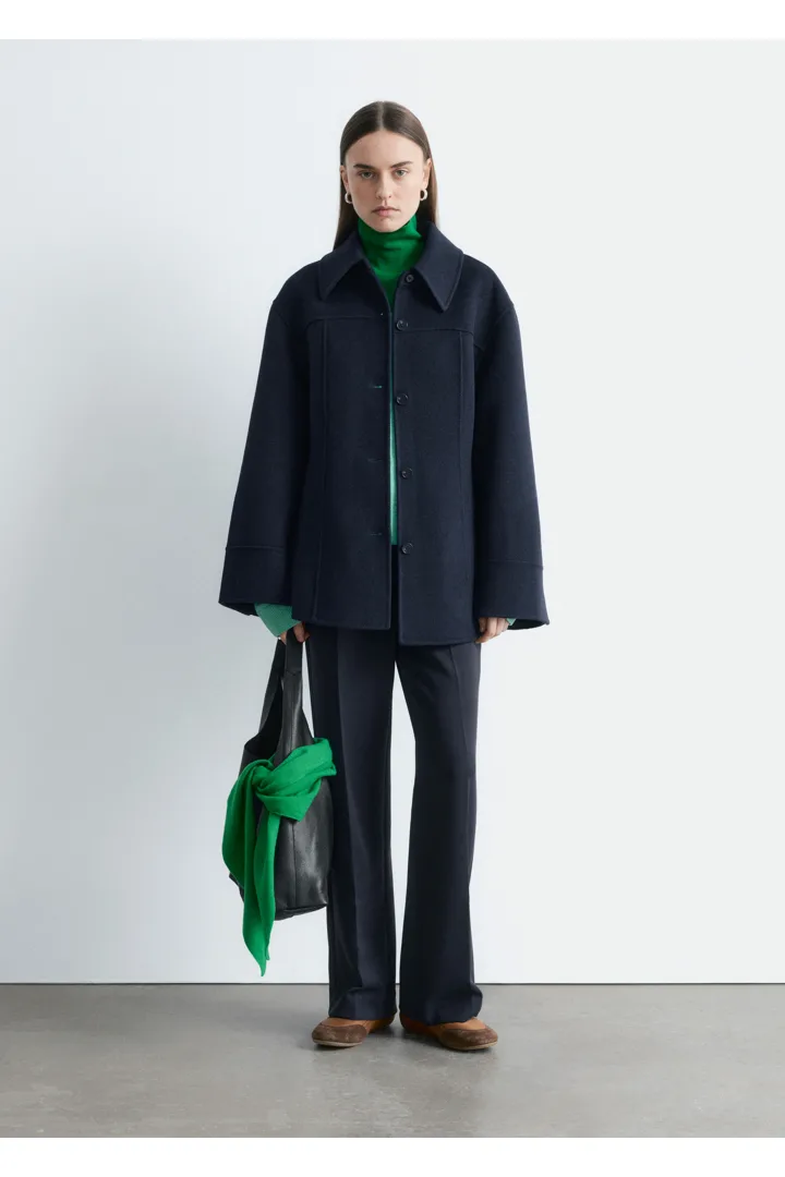 브러시드 울 혼방 트윌 소재의 자켓이에요. 큼직한 포인트 카라, 앞면의 단추, 측면 솔기의 깔끔한 포켓, 버튼 커프스가 자리해 있으며, 앞면과 뒷면의 요크와 노출형 솔기가 특징이랍니다.