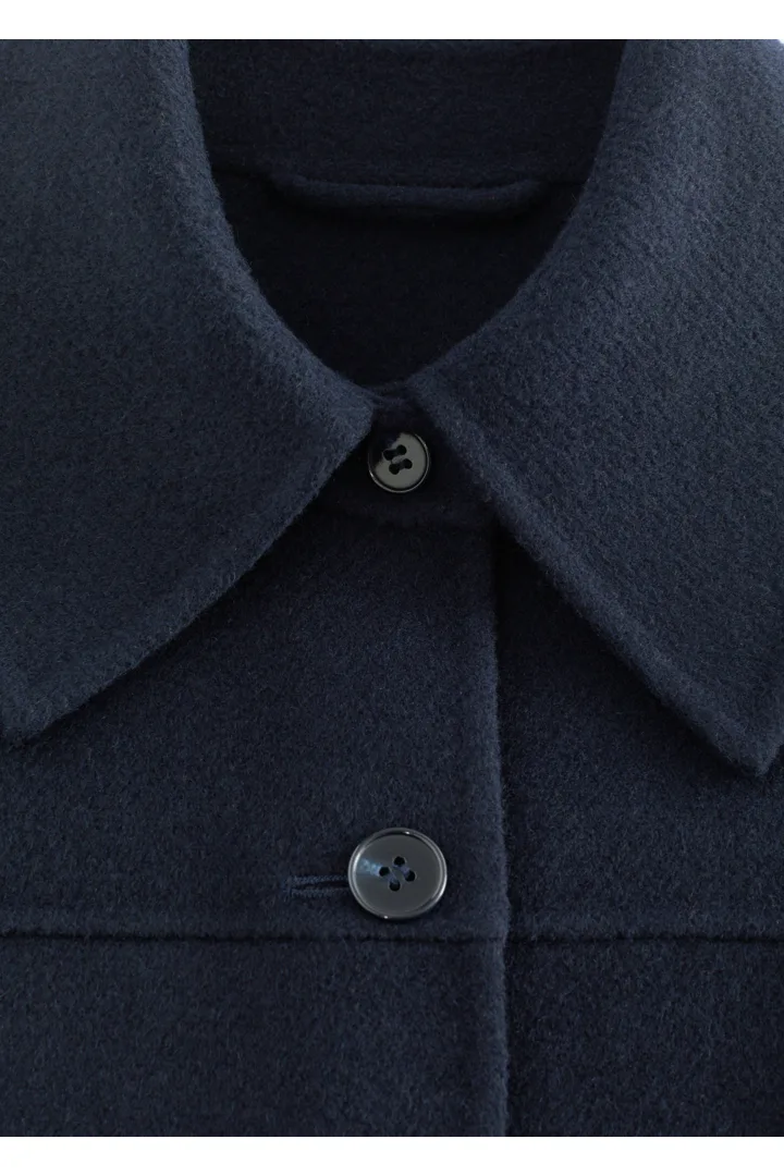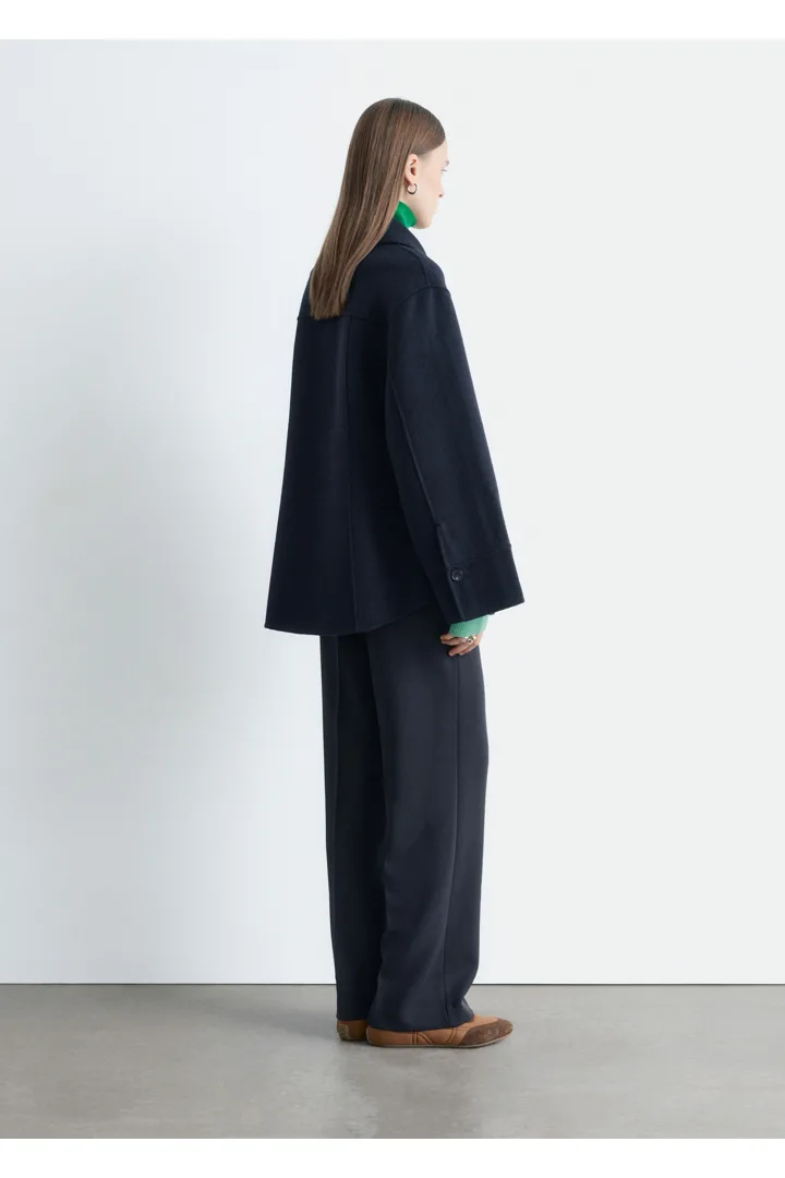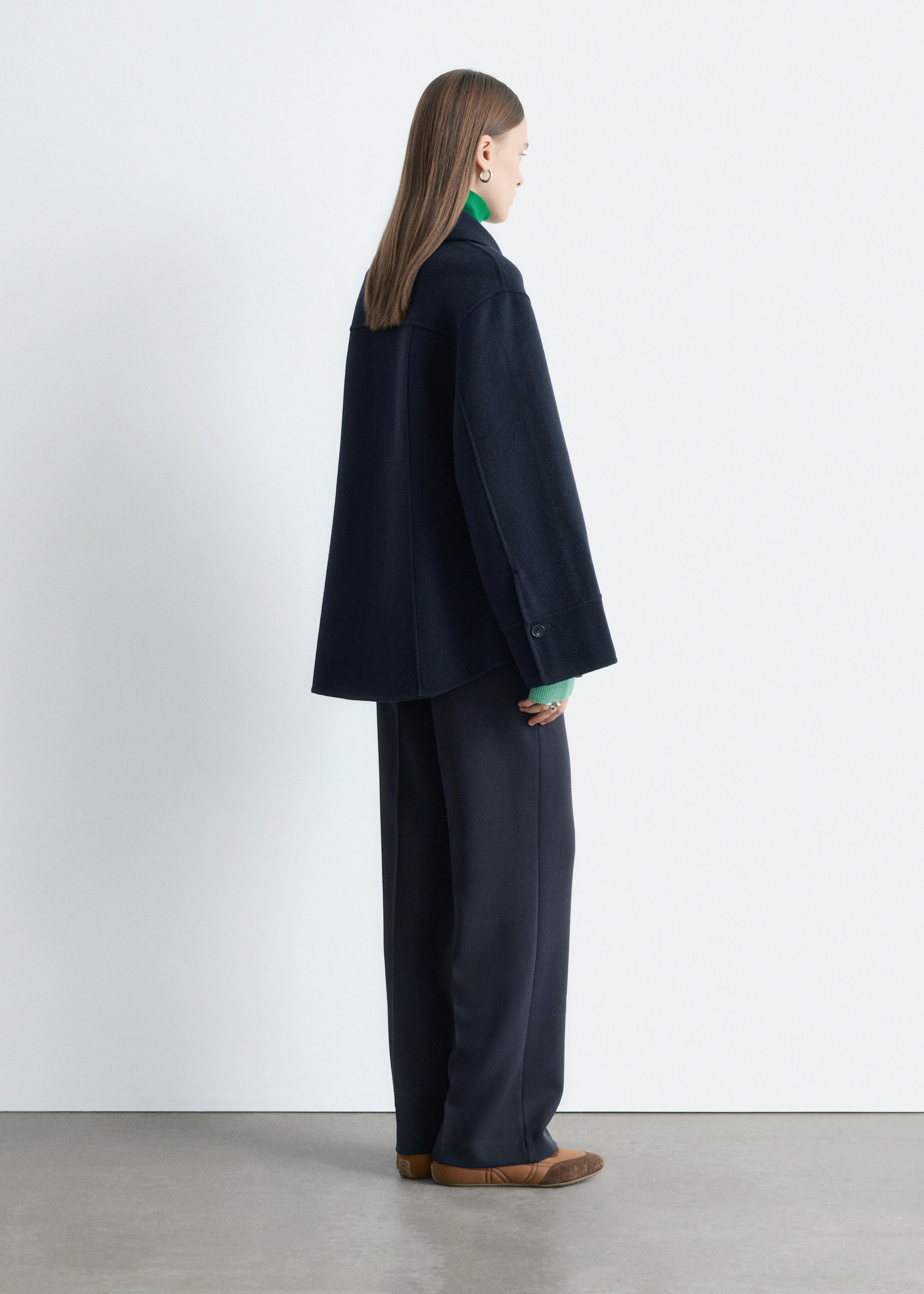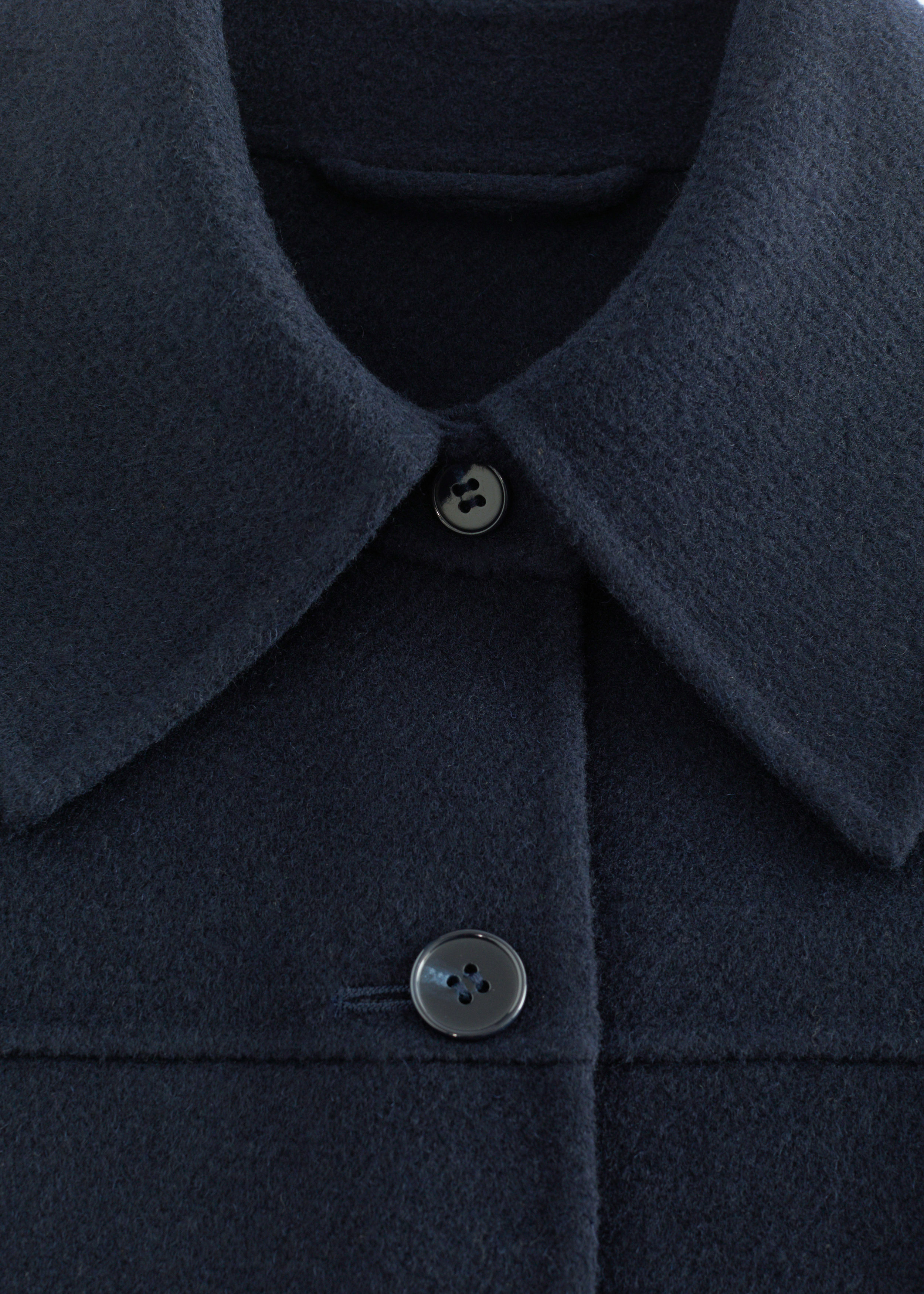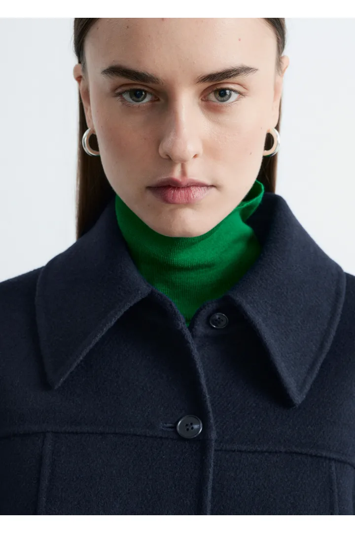 브러시드 울 혼방 트윌 소재의 자켓이에요. 큼직한 포인트 카라, 앞면의 단추, 측면 솔기의 깔끔한 포켓, 버튼 커프스가 자리해 있으며, 앞면과 뒷면의 요크와 노출형 솔기가 특징이랍니다.