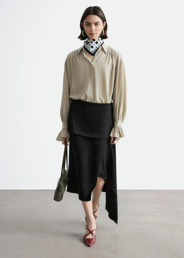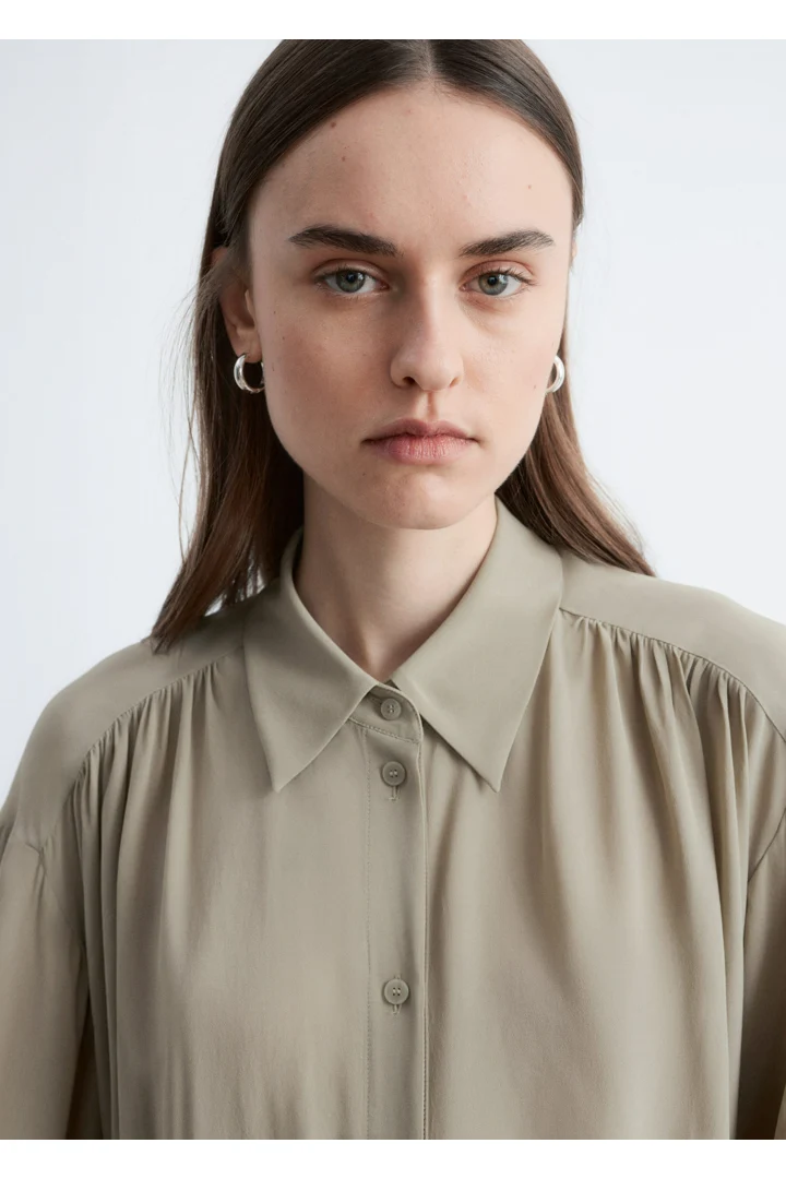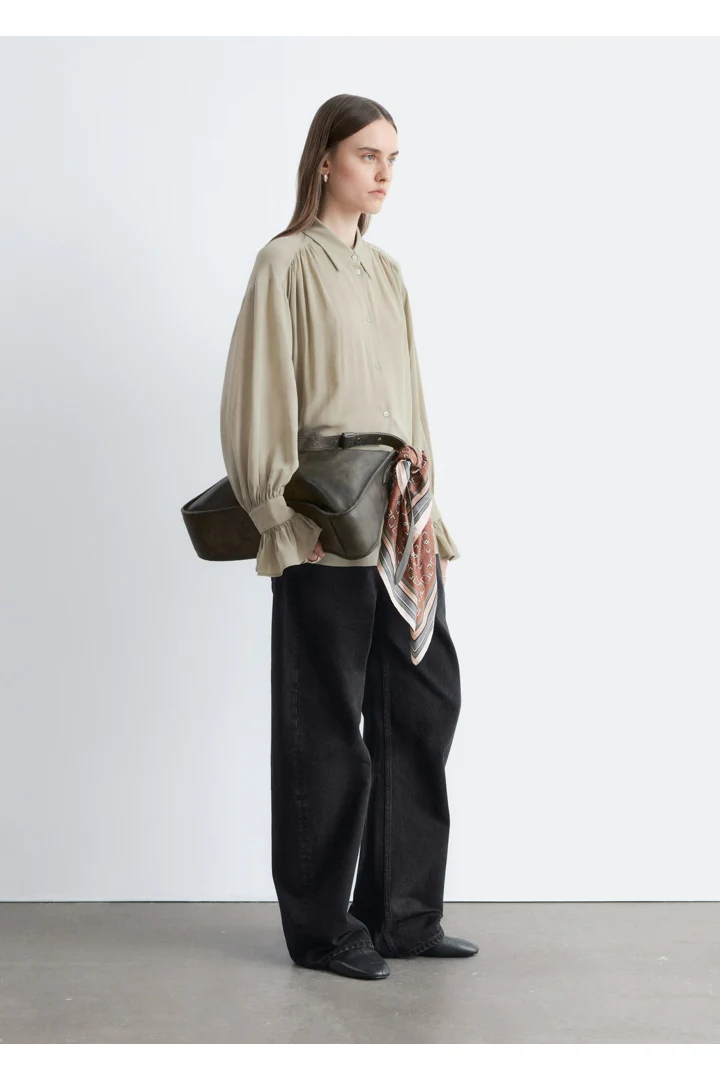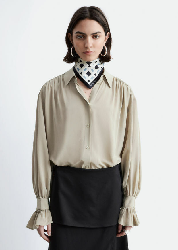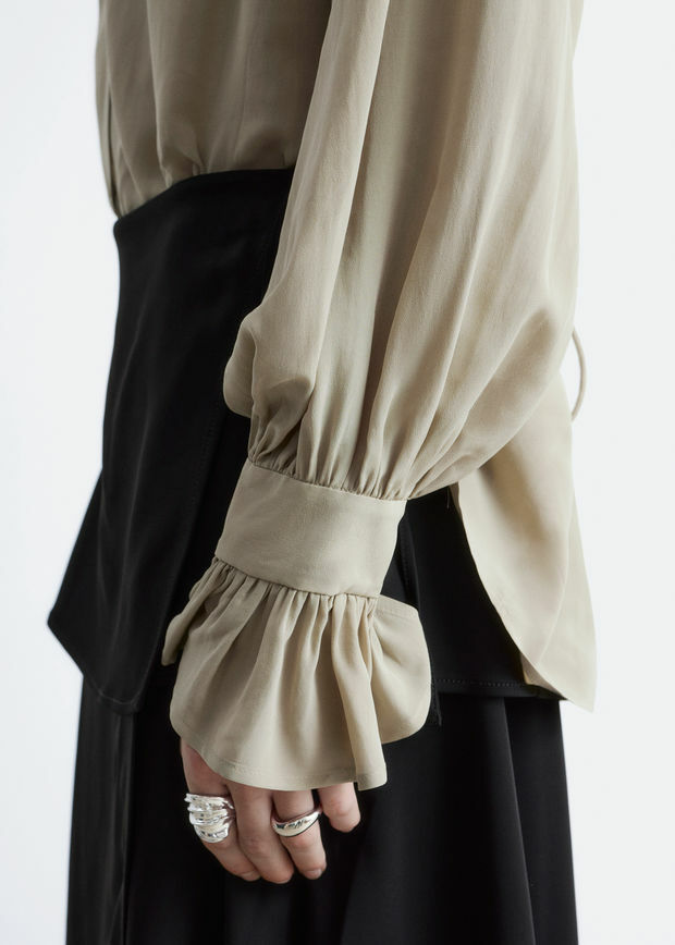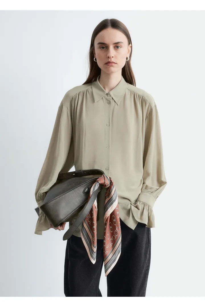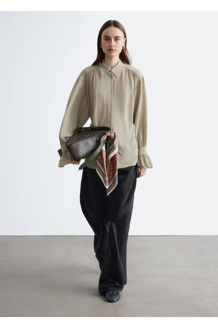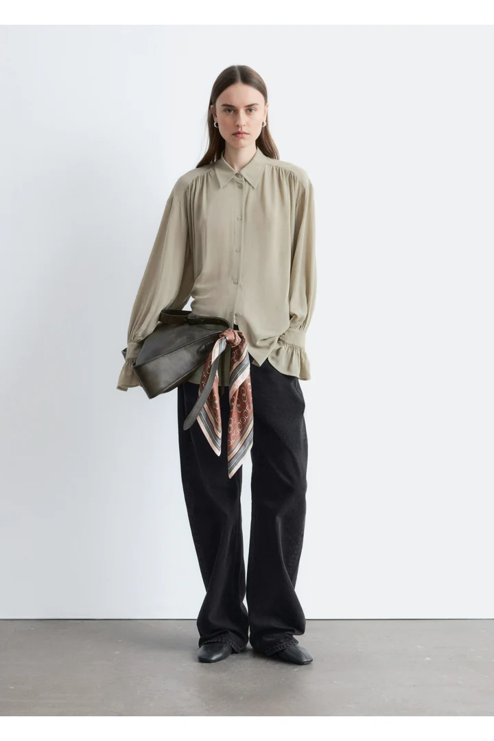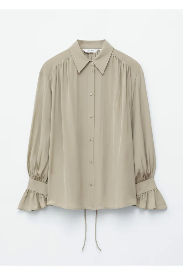 유려하게 흐르는 실루엣의 블라우스예요. 클래식 카라, 부드러운 개더링 주름, 볼륨감 있는 슬리브, 조임형 페플럼 커프스가 매력적이며, 뒷면의 슬림한 타이 클로저로 허리라인을 강조할 수 있답니다. 앞면에는 토널 단추가 자리해 있어요.