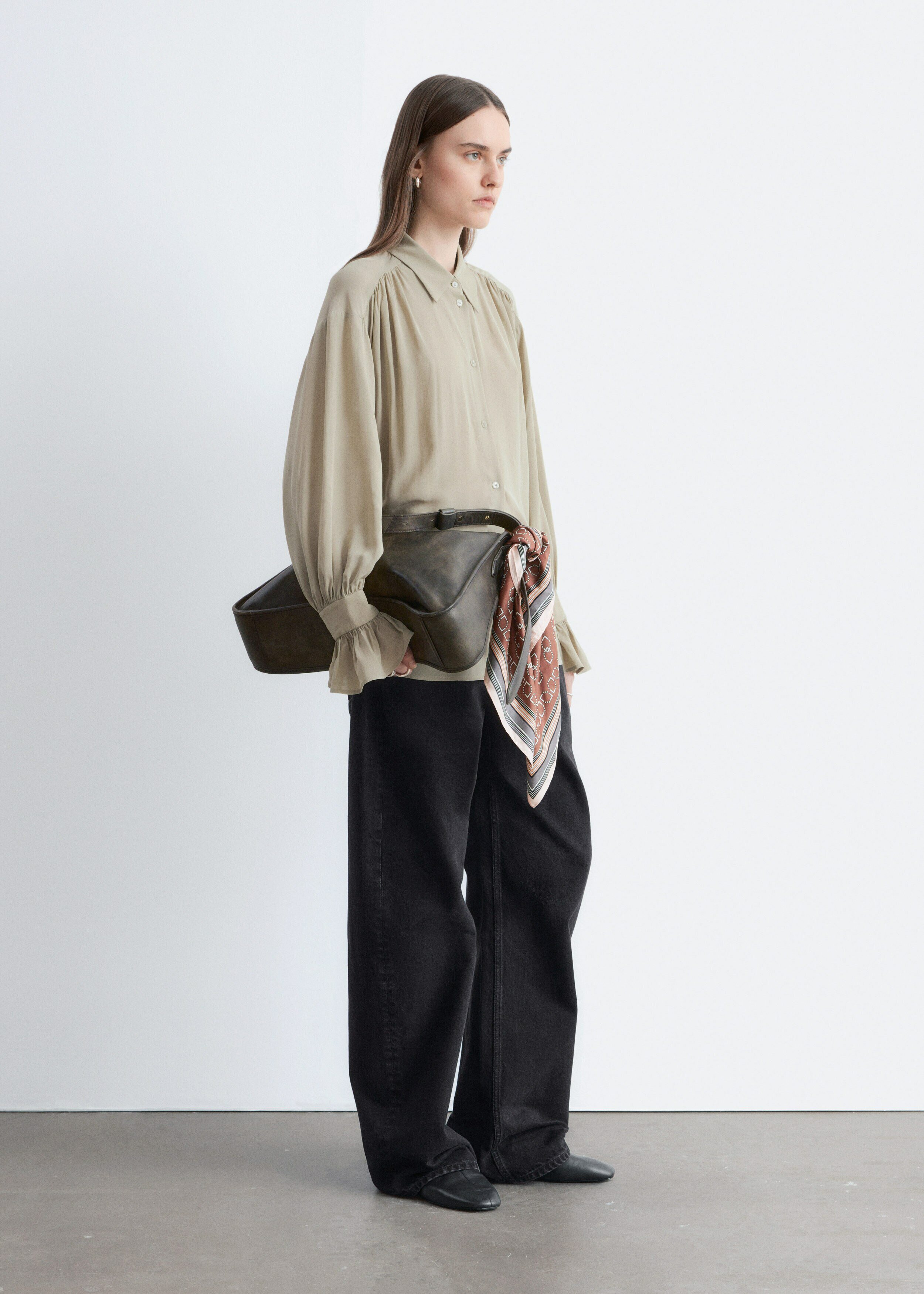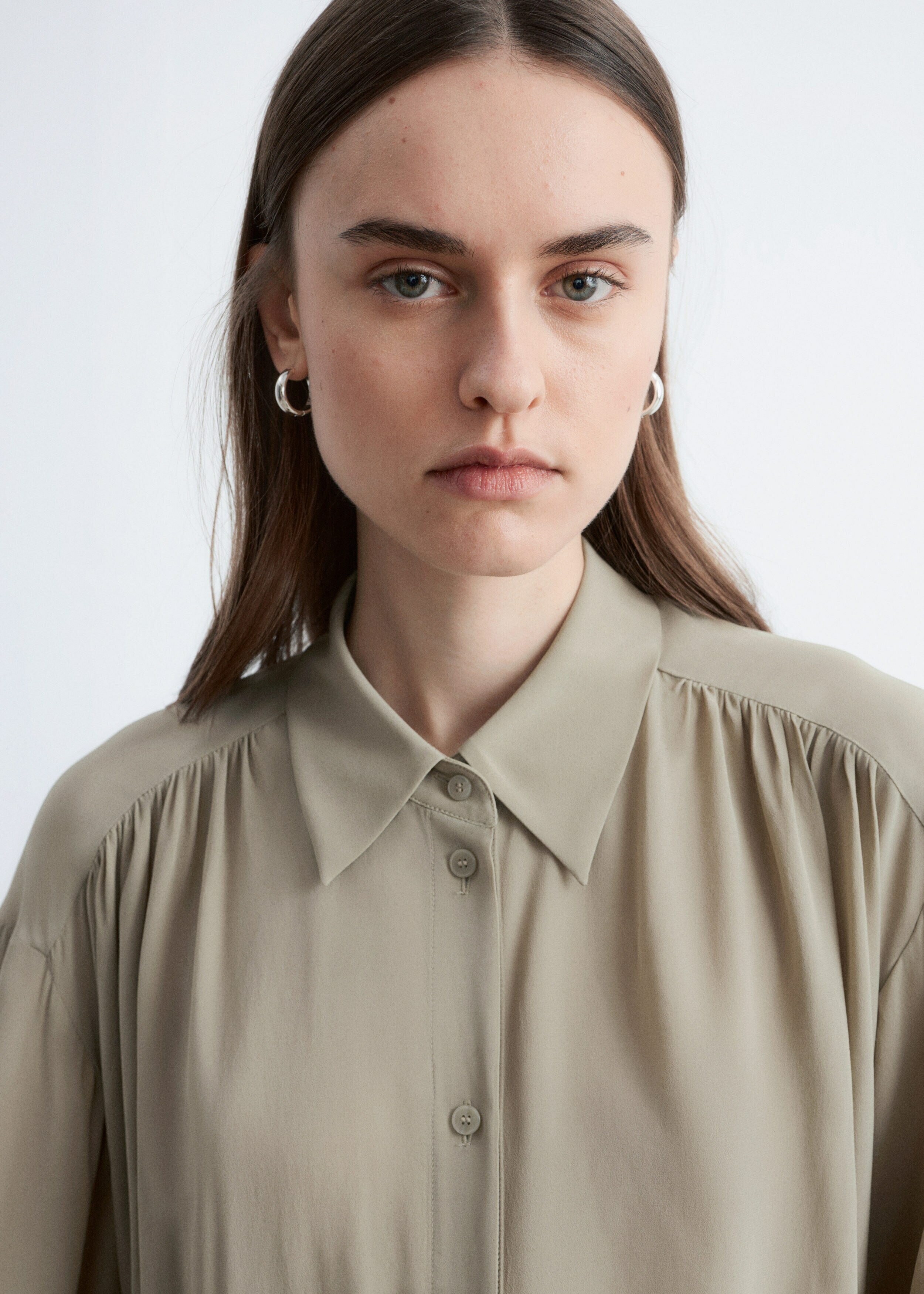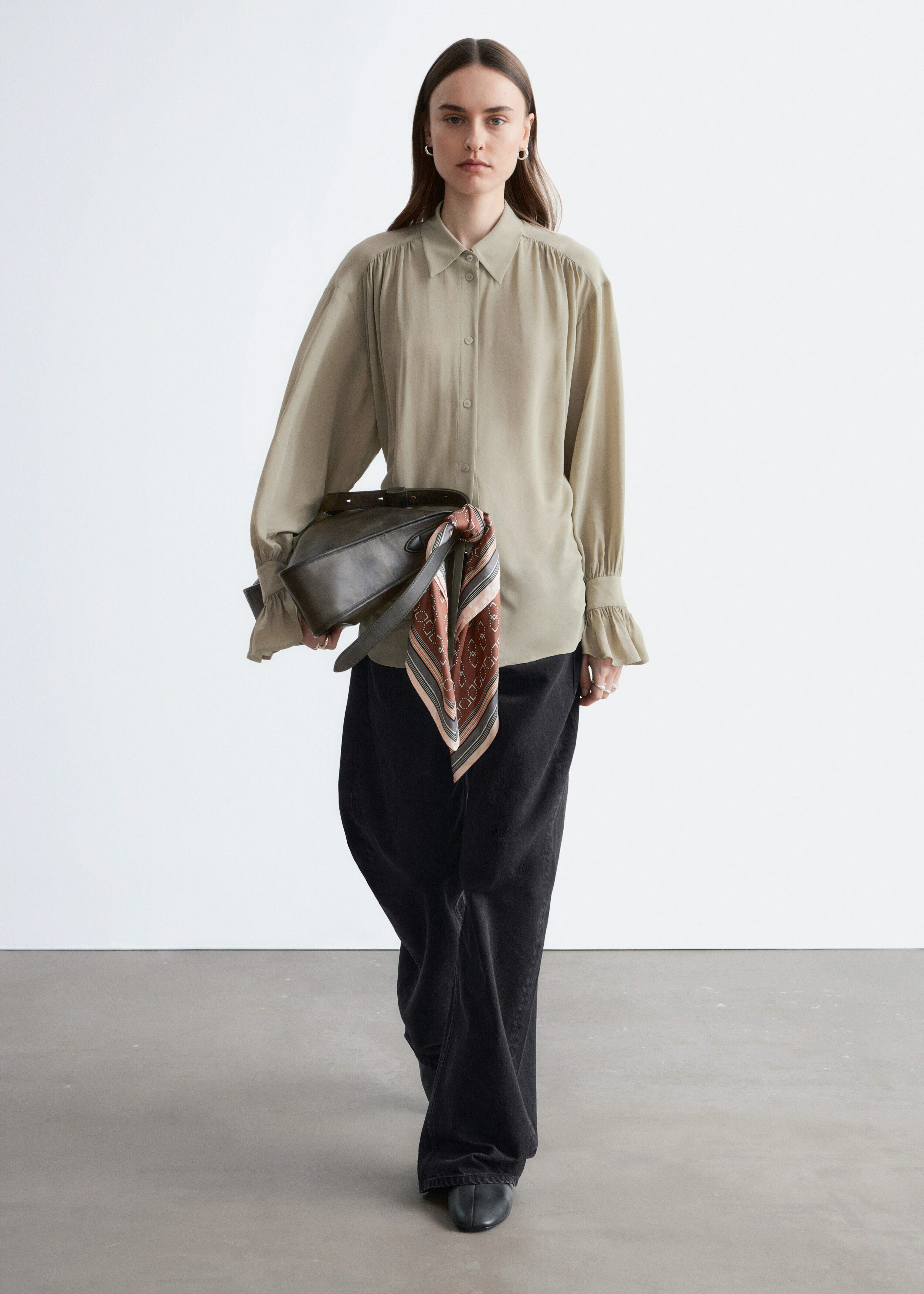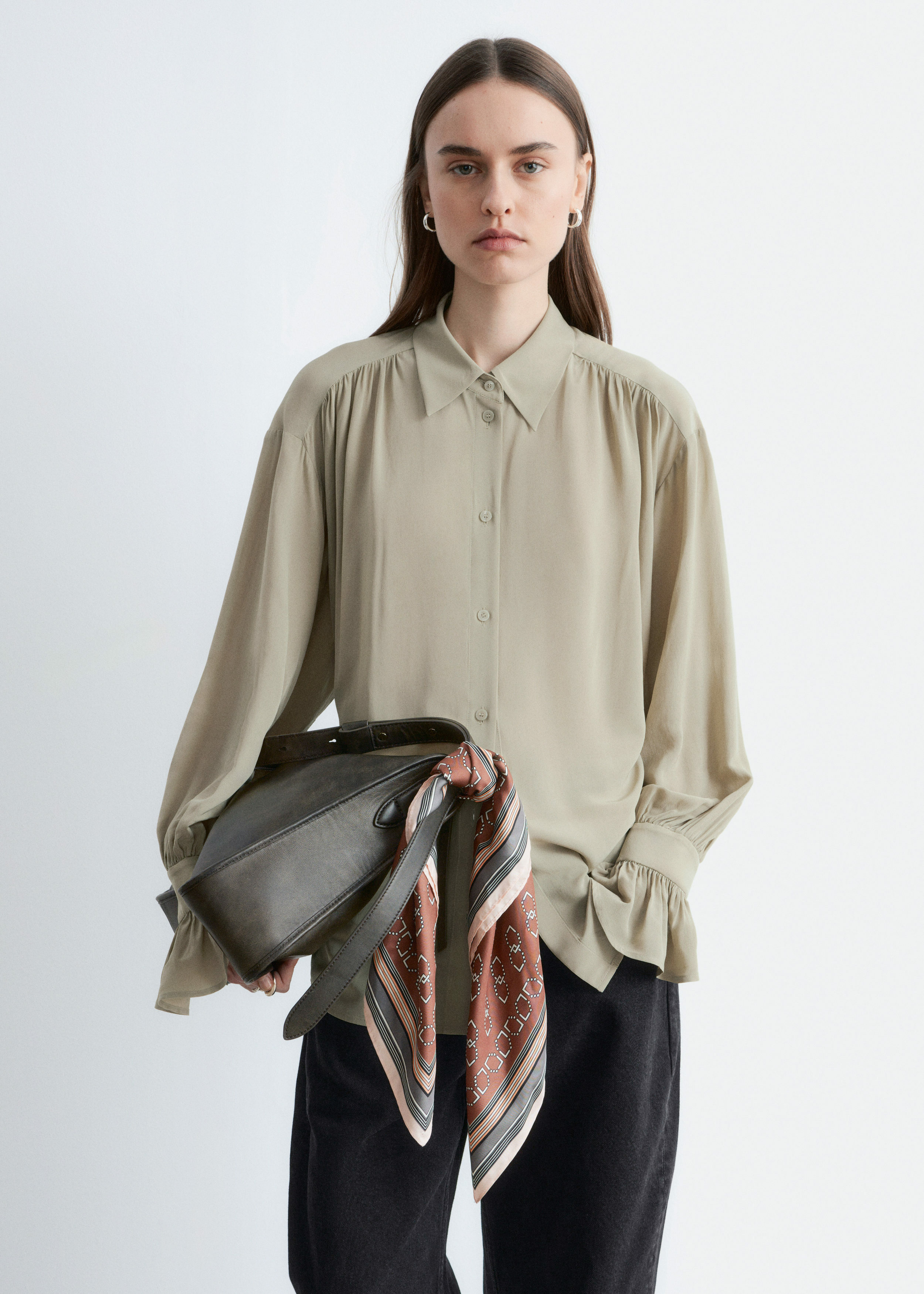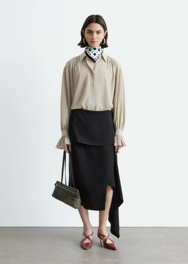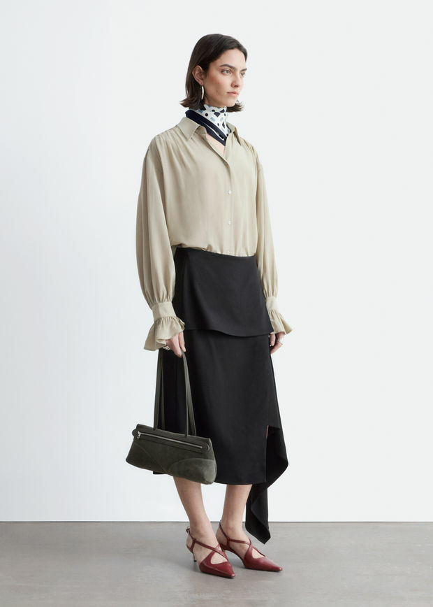 유려하게 흐르는 실루엣의 블라우스예요. 클래식 카라, 부드러운 개더링 주름, 볼륨감 있는 슬리브, 조임형 페플럼 커프스가 매력적이며, 뒷면의 슬림한 타이 클로저로 허리라인을 강조할 수 있답니다. 앞면에는 토널 단추가 자리해 있어요.