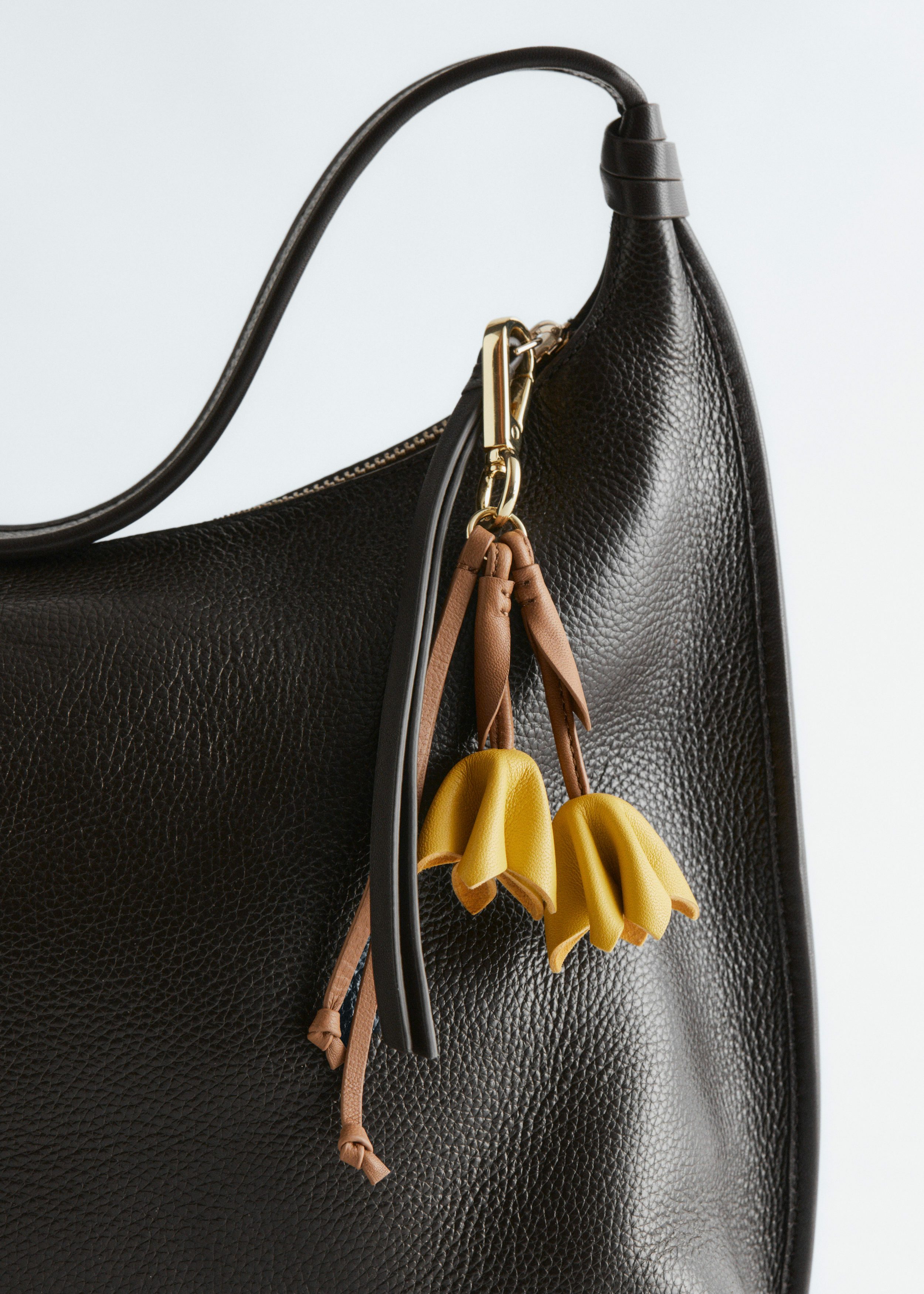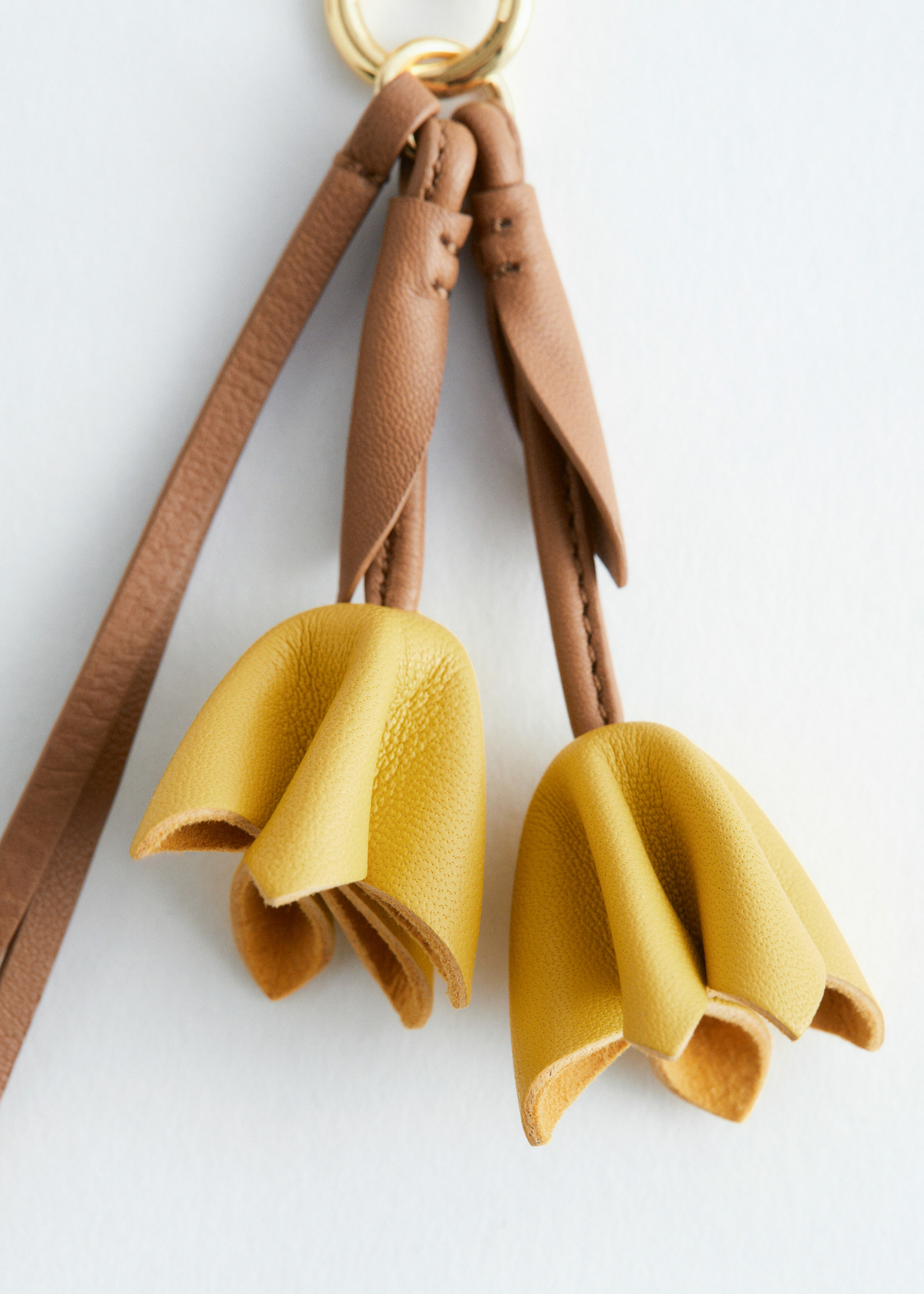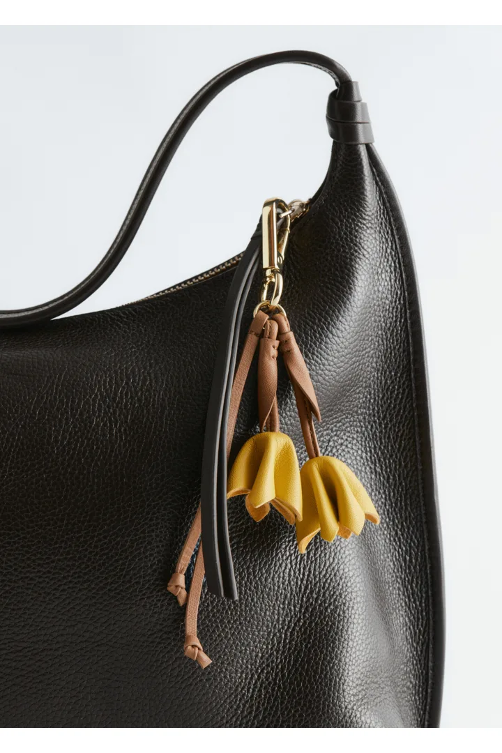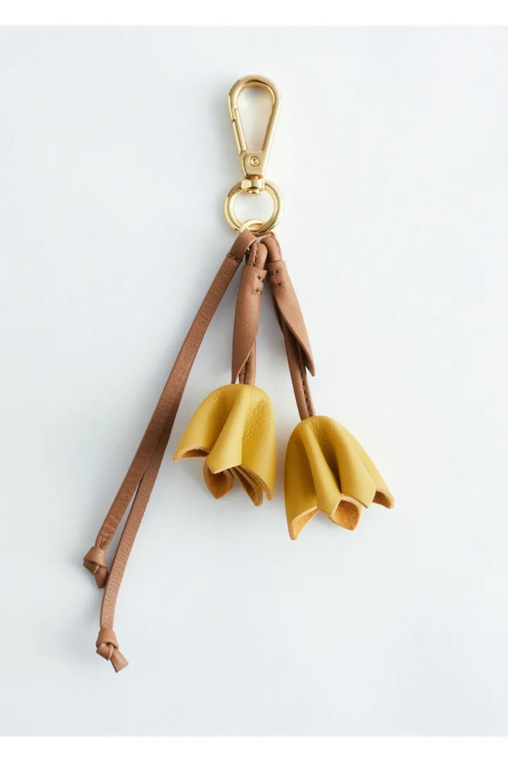 인도에서 크링클 마감의 부드러운 가죽으로 제작된 카라비너 클립 백 참이에요. 2개의 튤립 모양 장식이 시선을 사로잡는답니다. 끝에 매듭 디테일이 자리한 추가 스트랩이 경쾌한 움직임을 더해줘요.