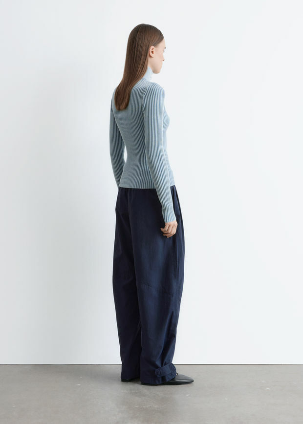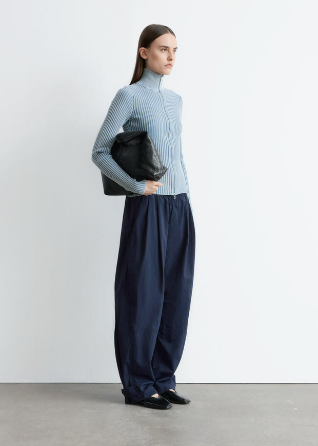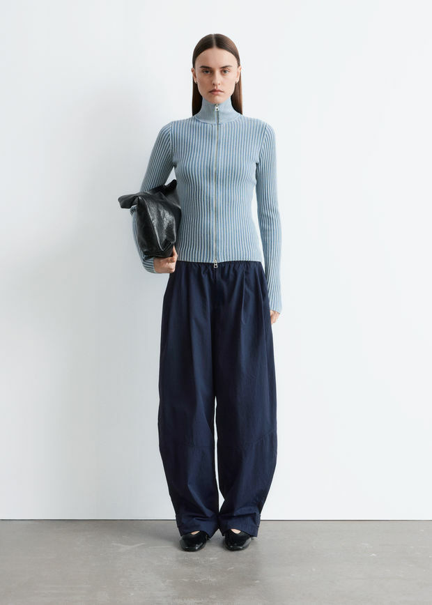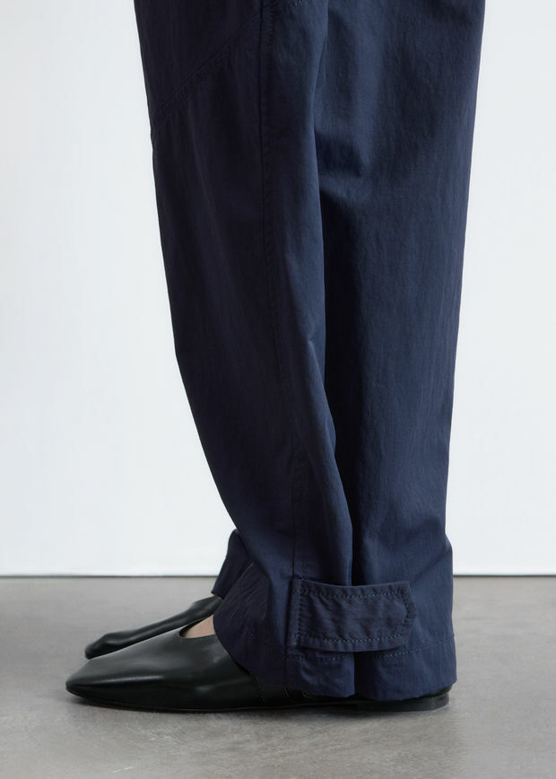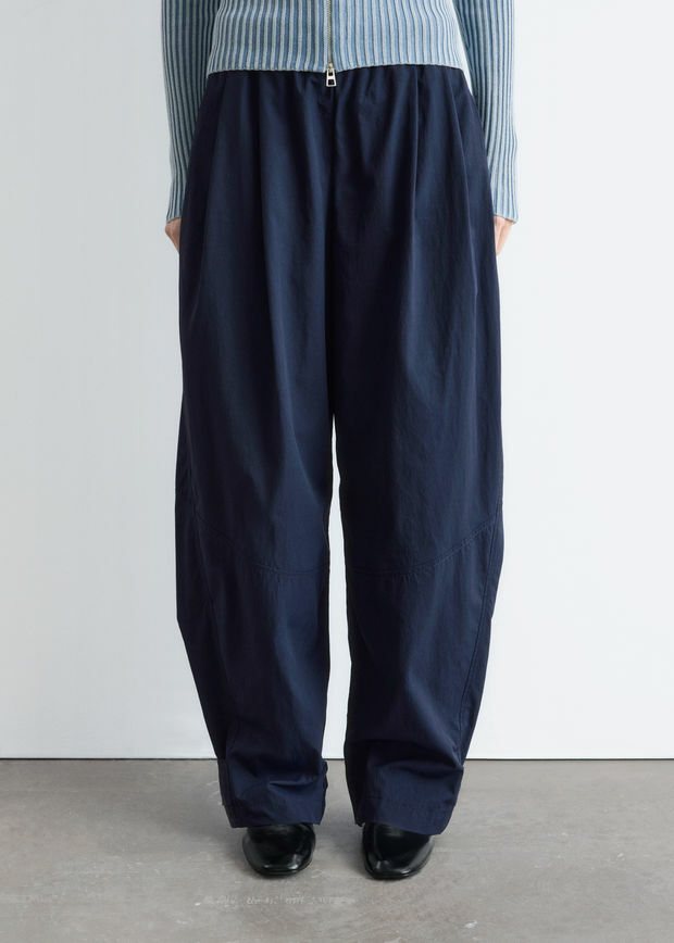 90년대 트랙 팬츠를 모던한 감각으로 풀어낸 트라우저예요. 가볍고 산뜻한 소재로 탄생했으며, 볼륨감 있는 배럴 레그가 특징이에요. 엘라스틱 웨이스트, 앞면의 깔끔한 플리츠, 커트 라인 솔기, 헴라인의 스냅 버튼 탭이 특징이랍니다.
