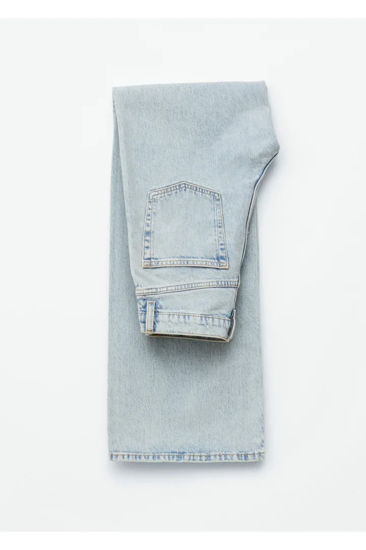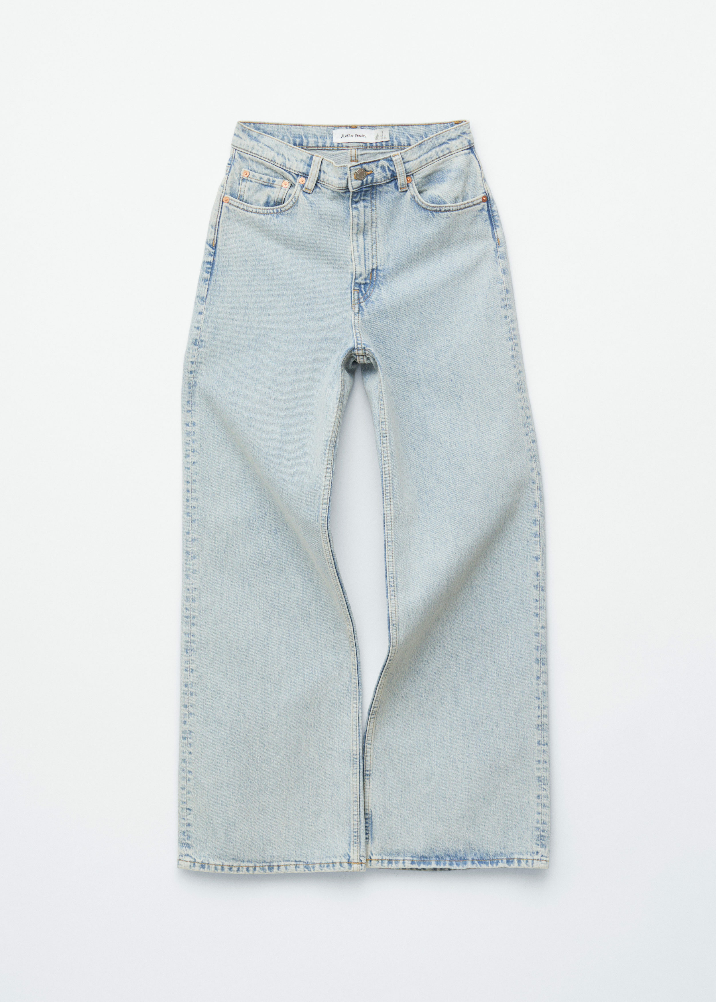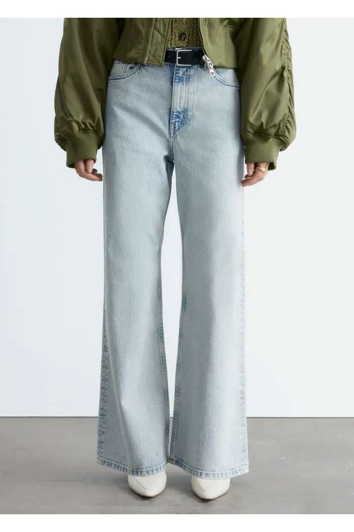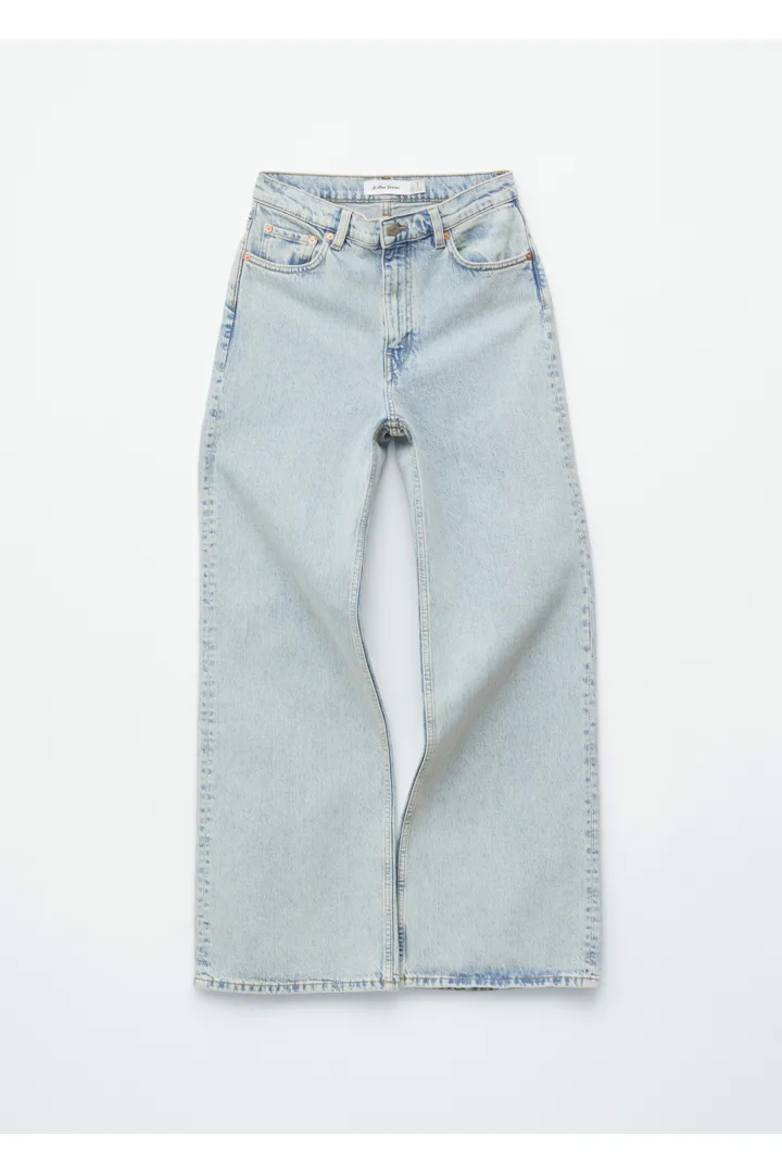 하이 웨이스트의 데님 진이에요. 너비감 있는 롱 레그와 클래식한 5 포켓 디자인이 특징이랍니다.