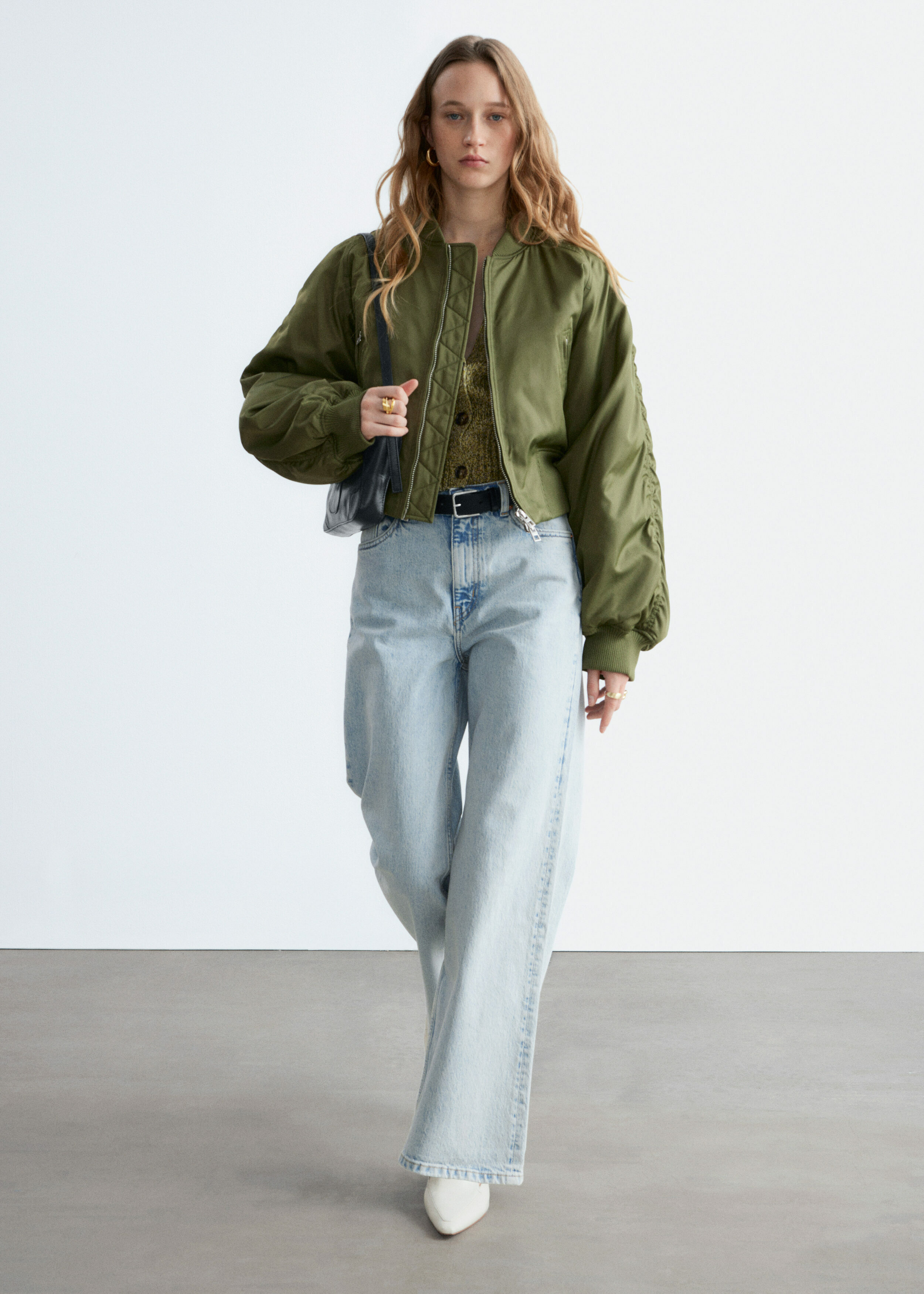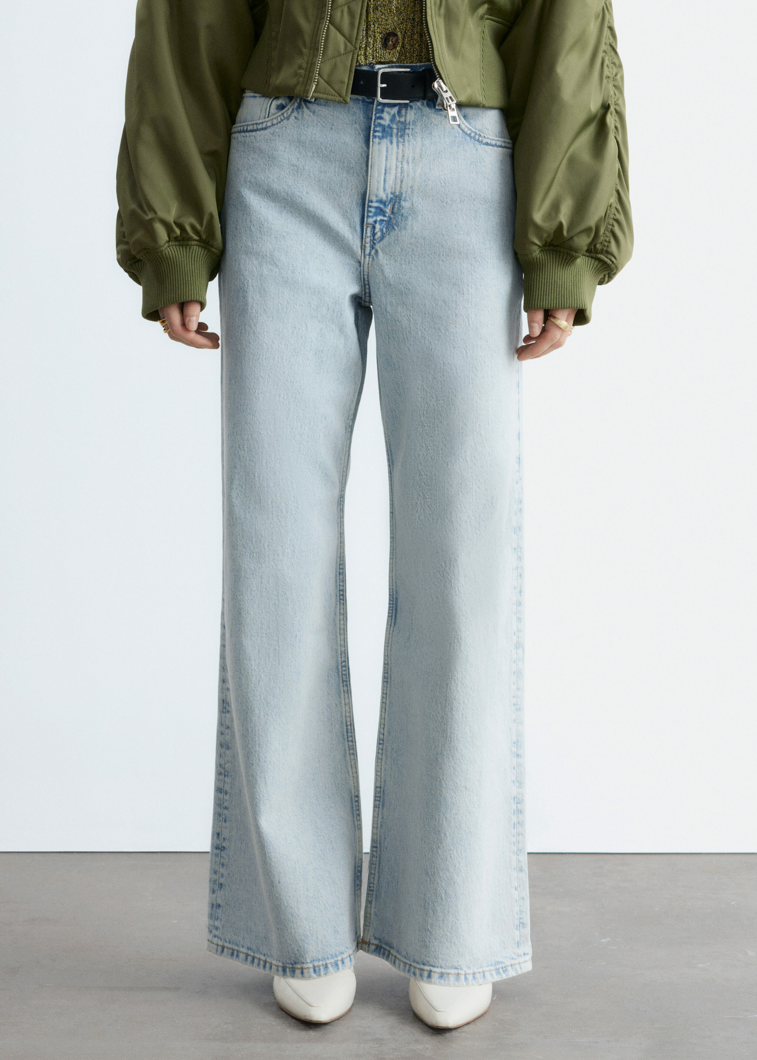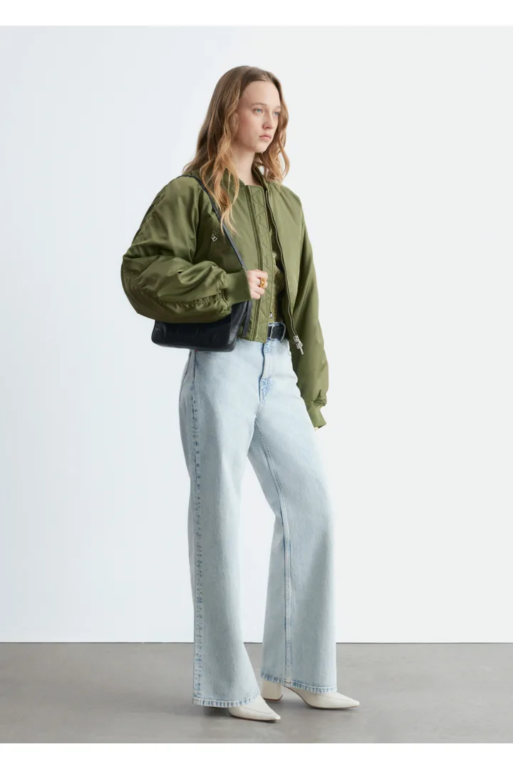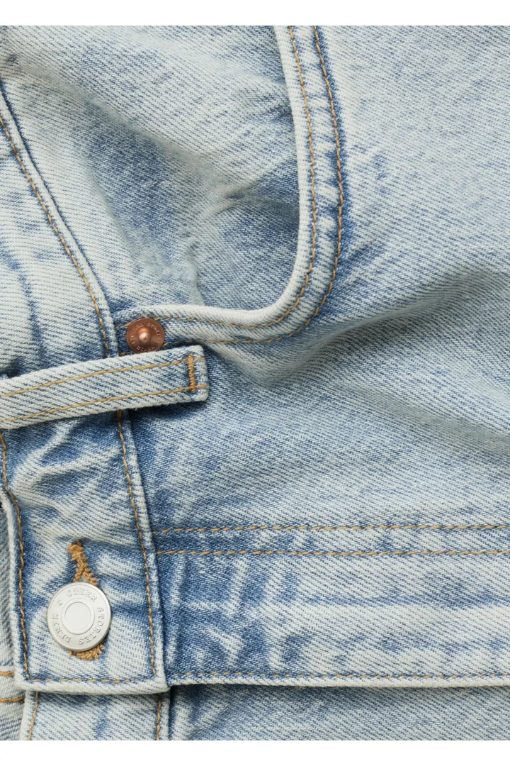 하이 웨이스트의 데님 진이에요. 너비감 있는 롱 레그와 클래식한 5 포켓 디자인이 특징이랍니다.