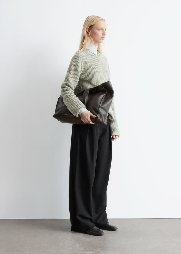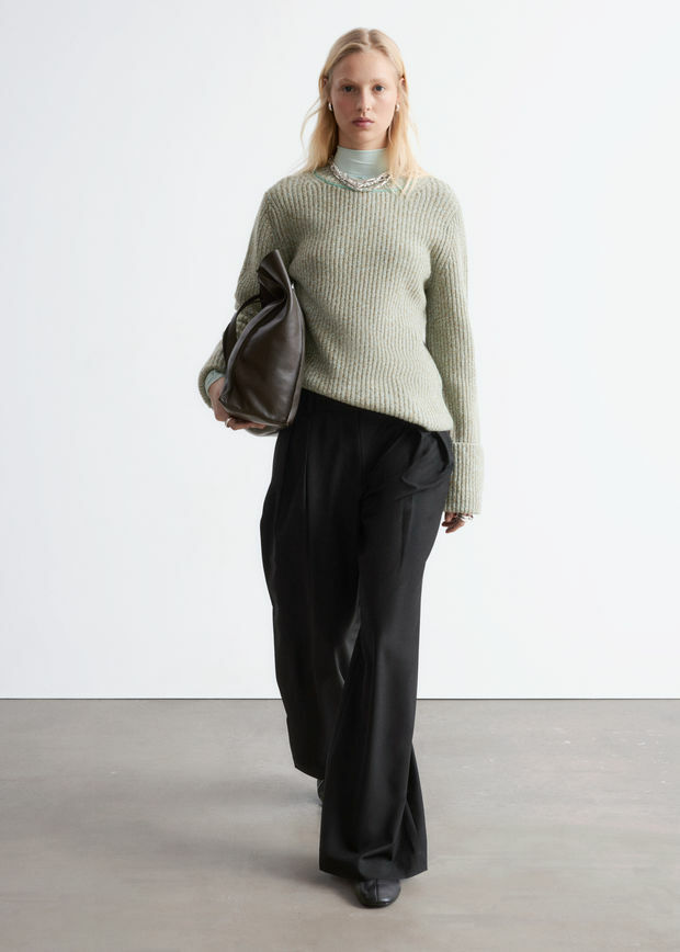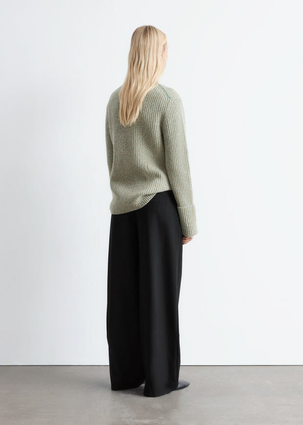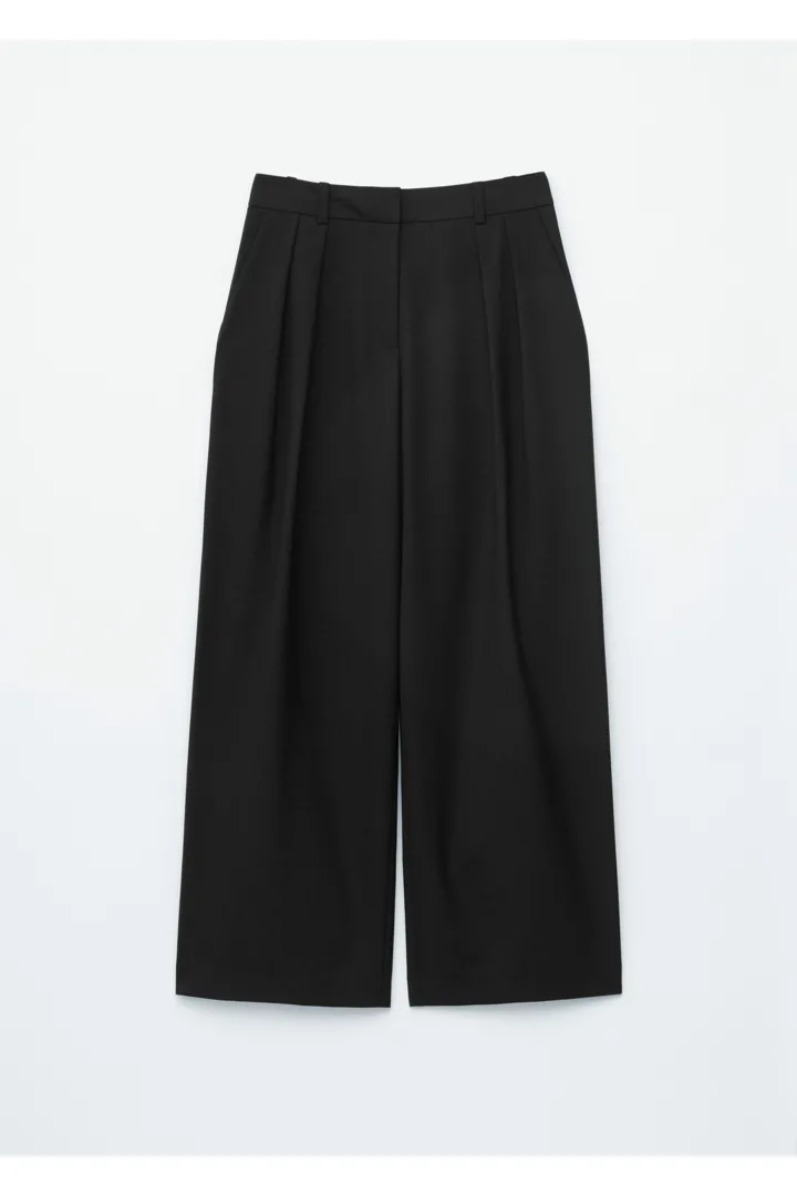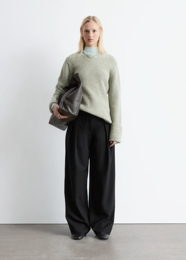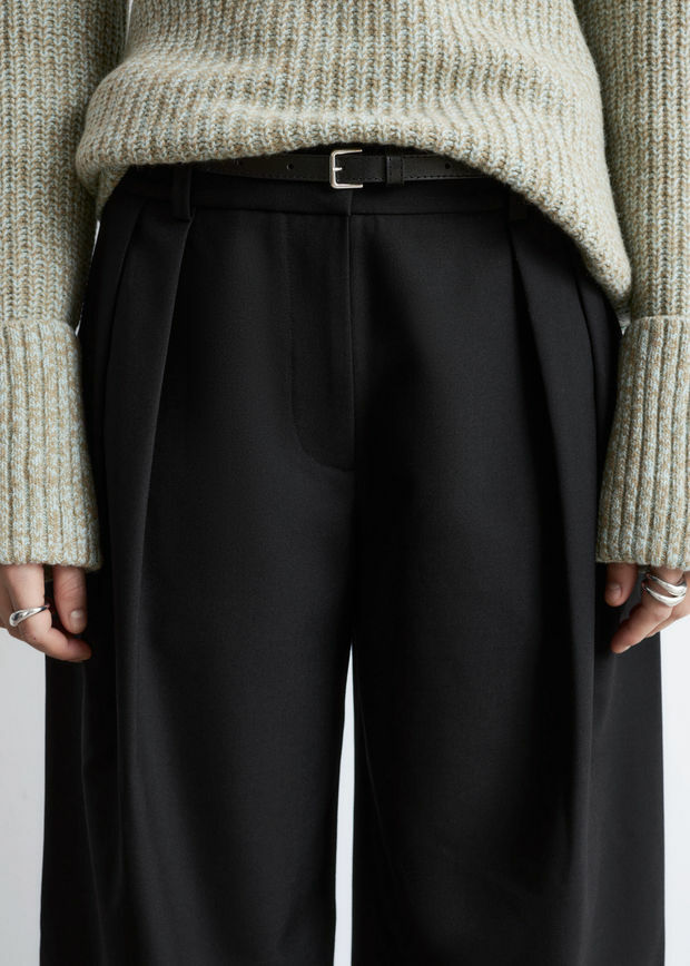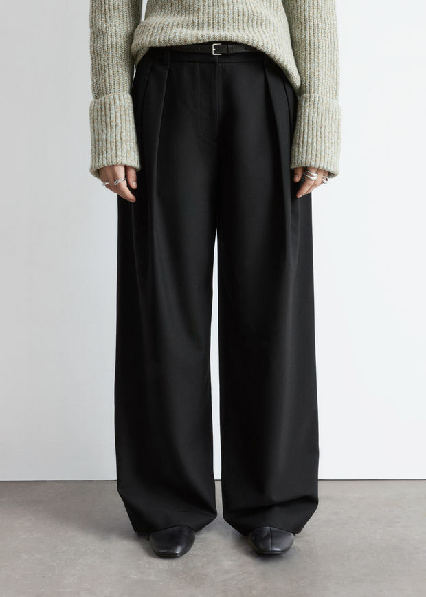 울 혼방 소재로 탄생한 트라우저예요. 레귤러 웨이스트, 그리고 롱 & 와이드 레그의 플리츠가 특징이랍니다. 측면의 사선 포켓, 지퍼 플라이와 후크 앤 바 & 단추, 뒷면의 웰트 포켓이 자리해 있어요.