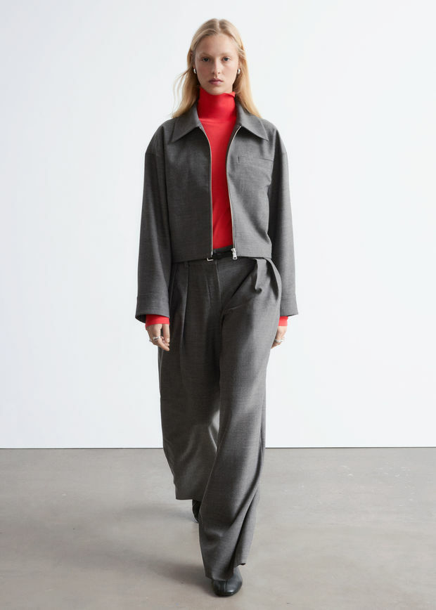 울 혼방 소재로 탄생한 트라우저예요. 레귤러 웨이스트, 그리고 롱 & 와이드 레그의 플리츠가 특징이랍니다. 측면의 사선 포켓, 지퍼 플라이와 후크 앤 바 & 단추, 뒷면의 웰트 포켓이 자리해 있어요.
