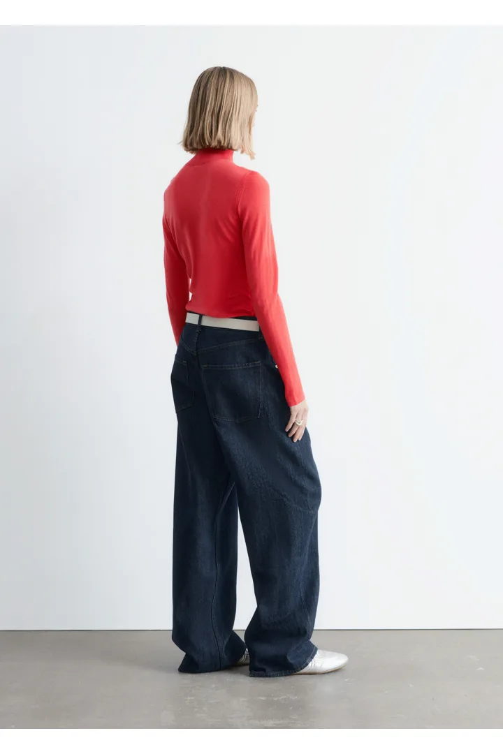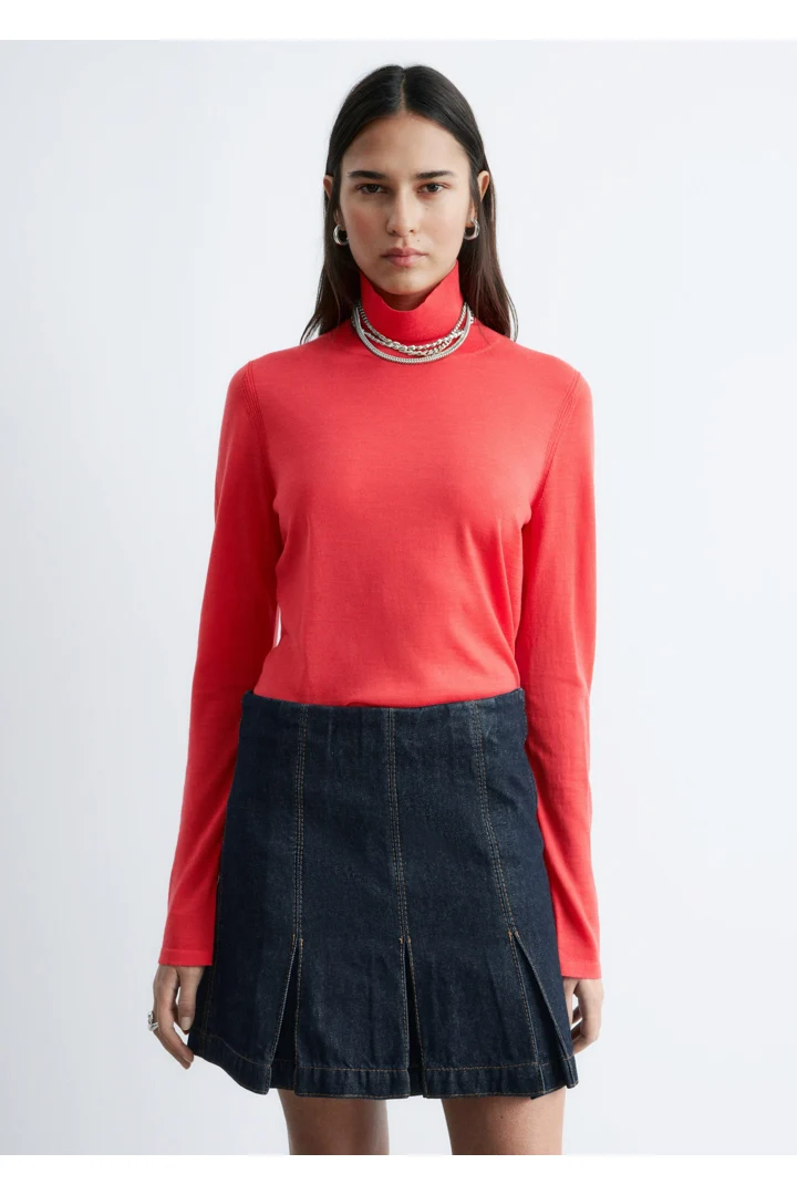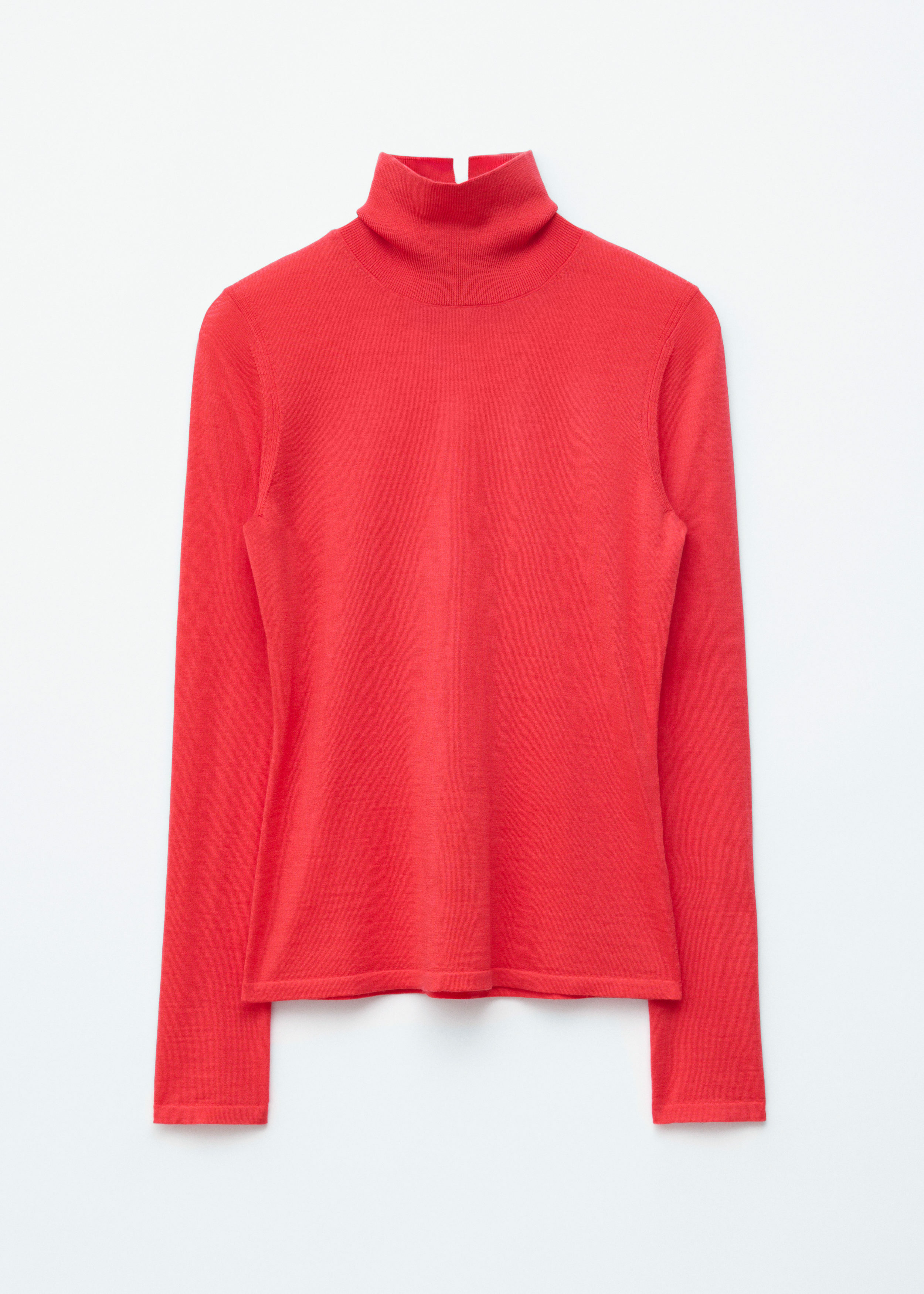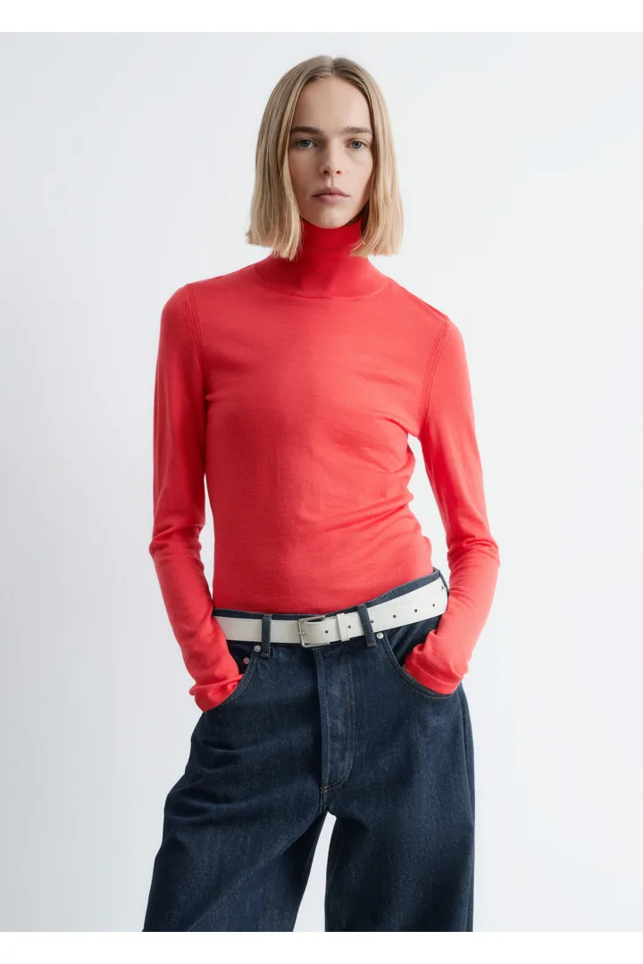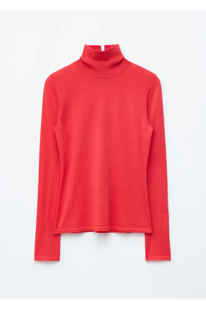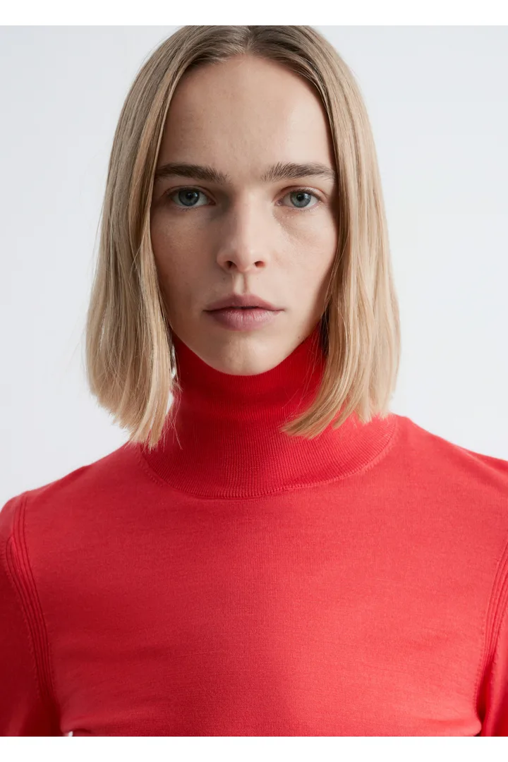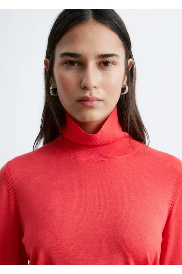 부드러운 메리노 울 소재로 섬세하게 니팅된 탑이에요. 핏 되는 실루엣, 립 폴로 넥, 롱 슬리브, 뒷면의 은은한 트임이 특징이에요.