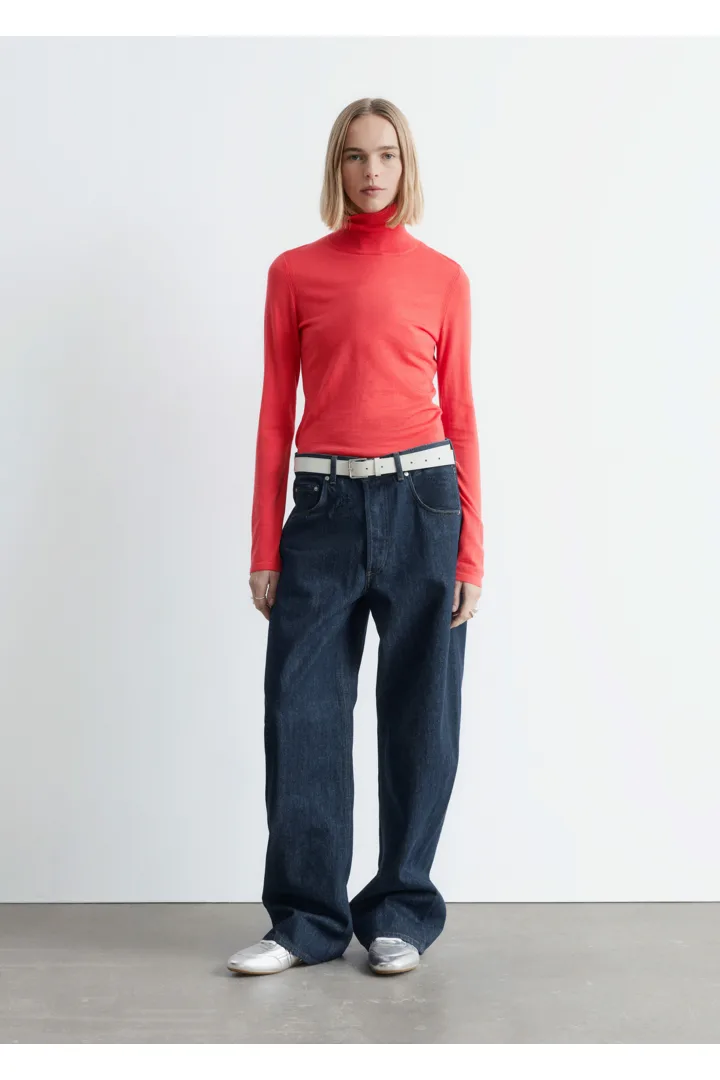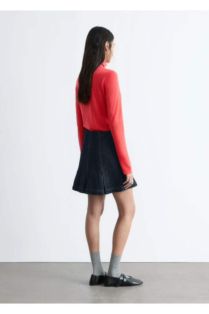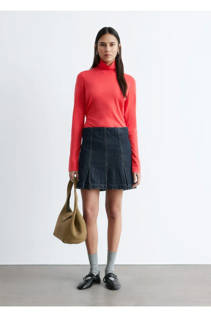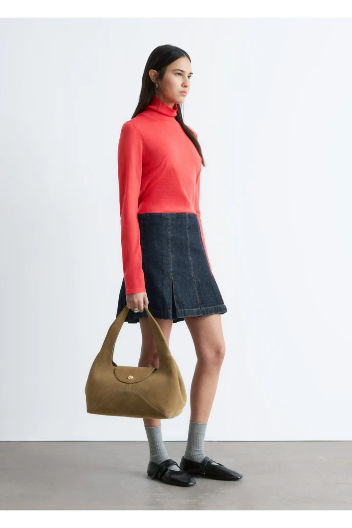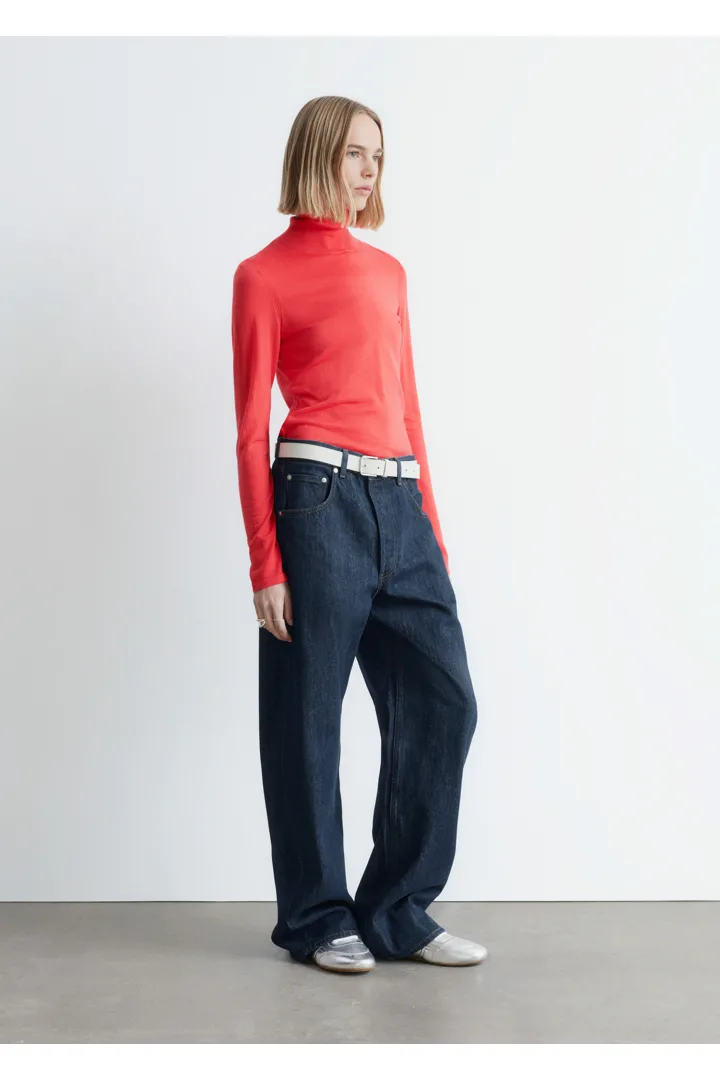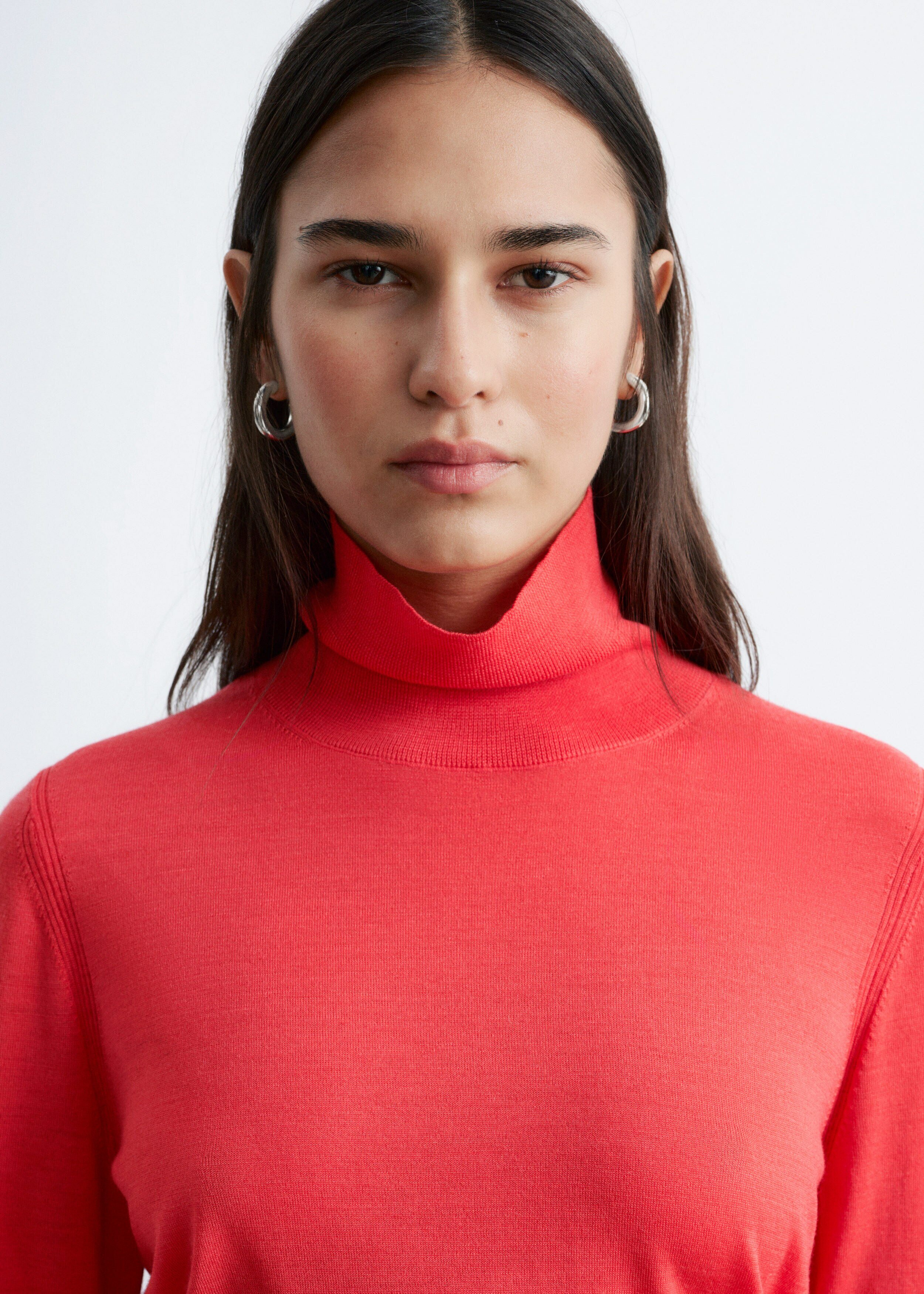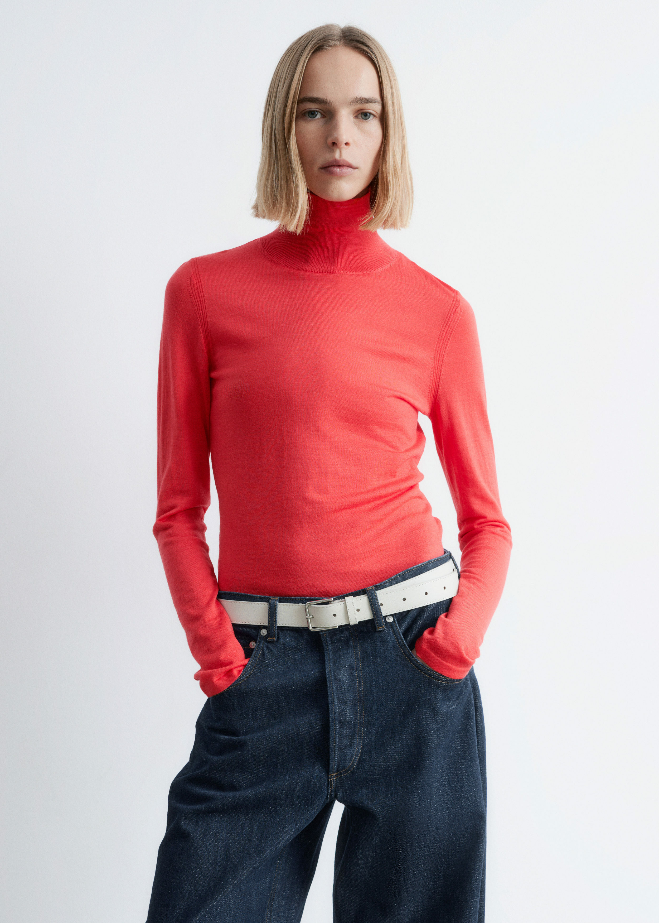 부드러운 메리노 울 소재로 섬세하게 니팅된 탑이에요. 핏 되는 실루엣, 립 폴로 넥, 롱 슬리브, 뒷면의 은은한 트임이 특징이에요.