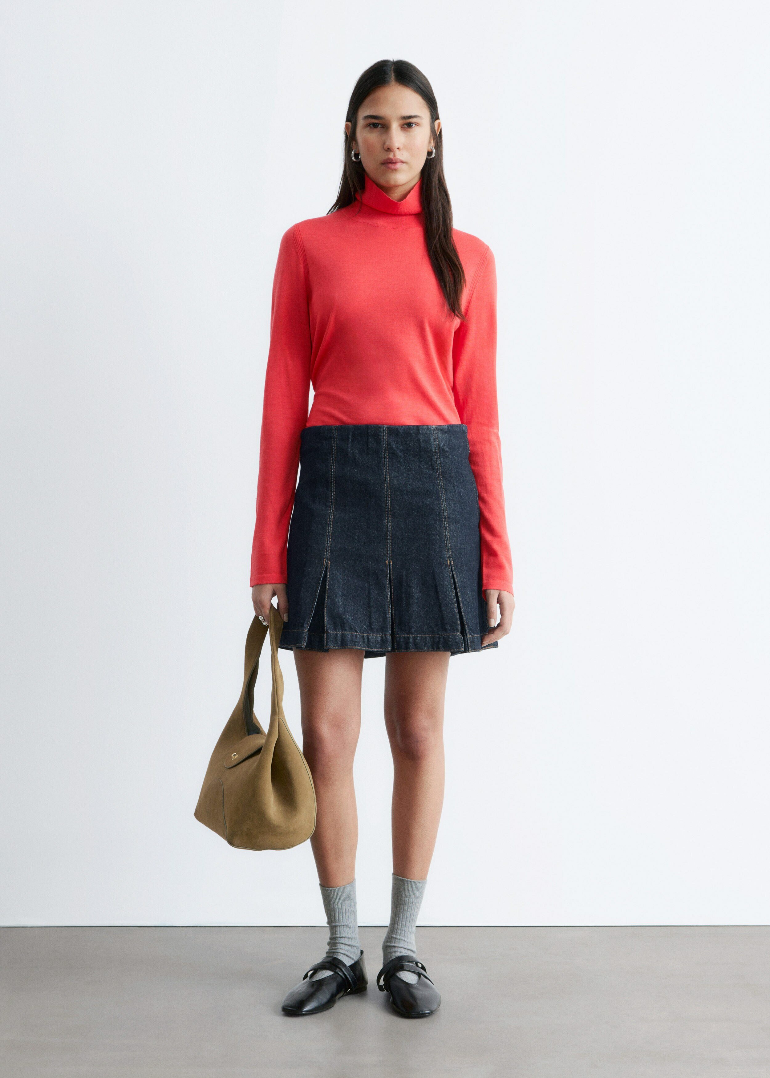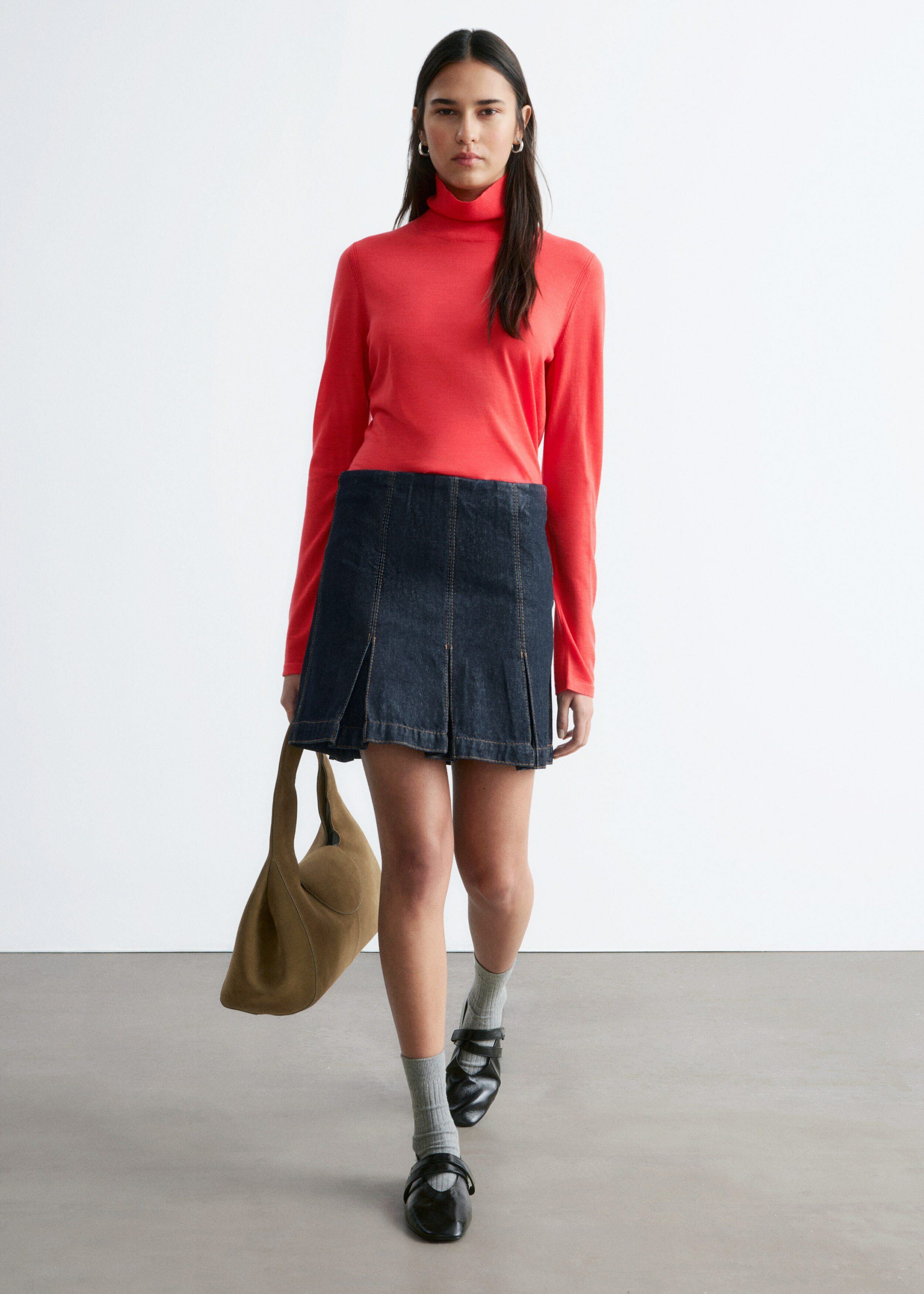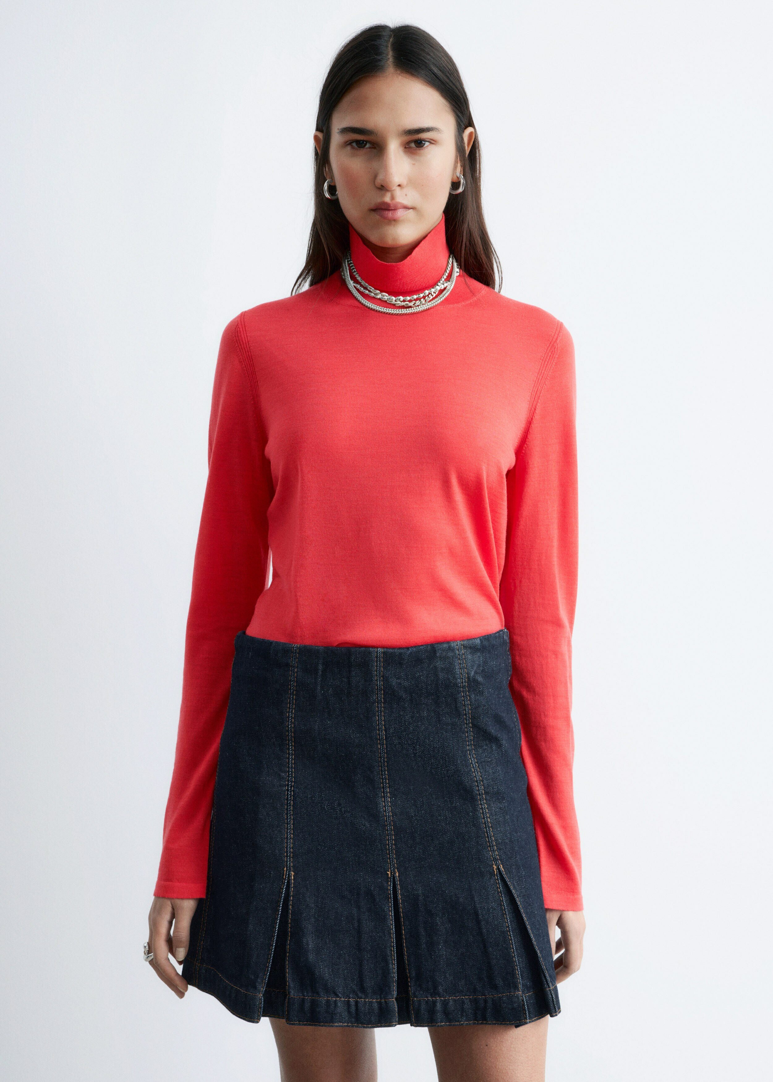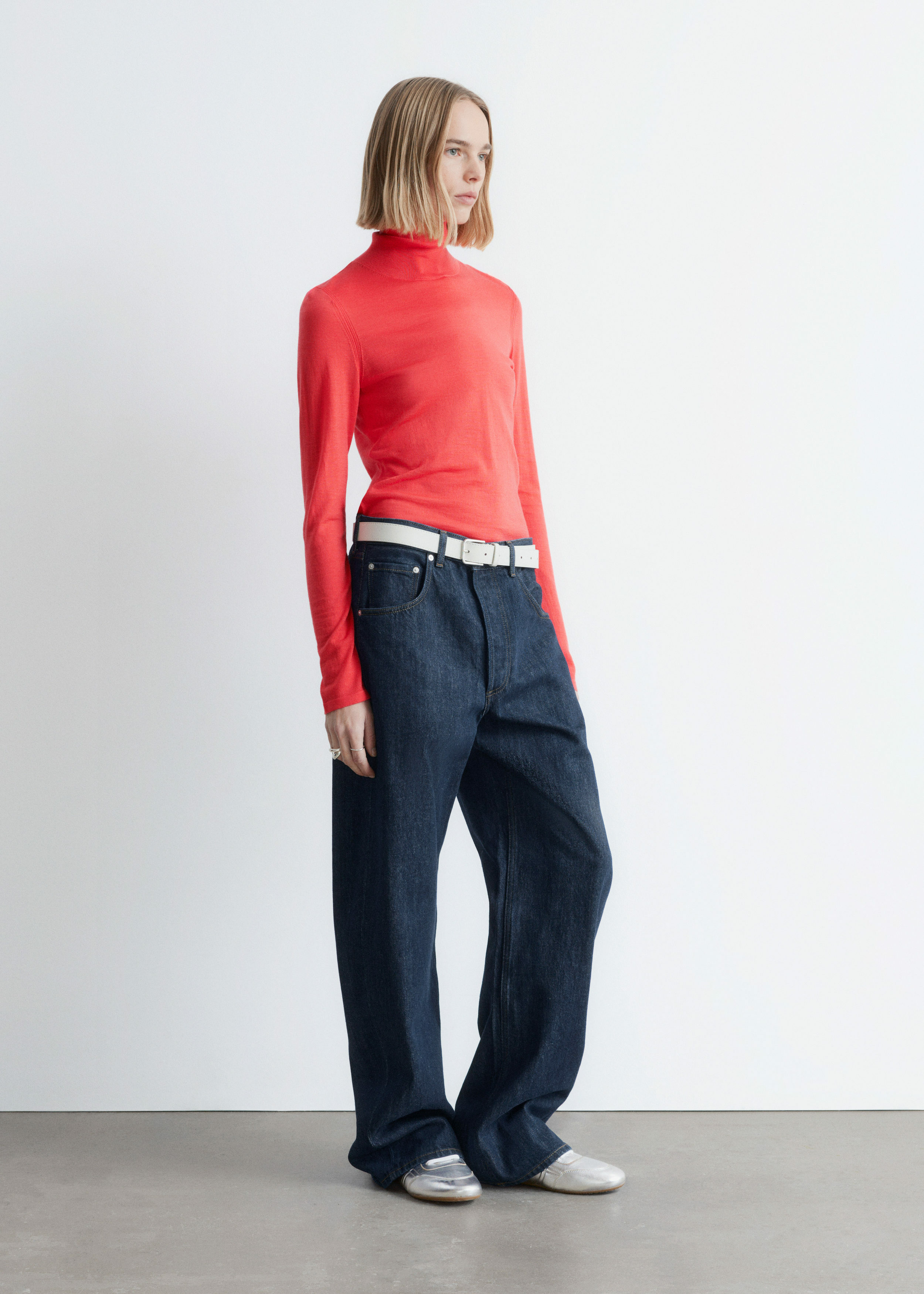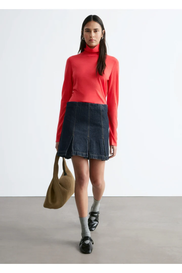 부드러운 메리노 울 소재로 섬세하게 니팅된 탑이에요. 핏 되는 실루엣, 립 폴로 넥, 롱 슬리브, 뒷면의 은은한 트임이 특징이에요.