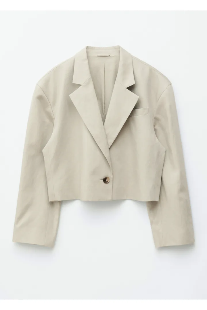 리넨 혼방 소재로 탄생한 크롭 블레이저예요. 오버사이즈 실루엣, 드롭 숄더, 앞면의 싱글 단추가 특징이랍니다. 간결한 무드가 돋보이는 제품으로, 가슴 포켓과 버튼 커프스가 자리해 있어요.