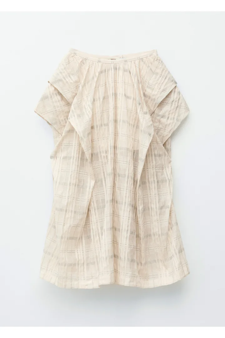 코튼 소재의 미디 스커트예요. 볼륨감 있는 실루엣, 허리의 개더링 주름, 그리고 양쪽 측면부의 넓은 스티치 주름이 구조감과 움직임을 더해주어요. 옆면 트임, 후크 앤 바 여밈, 뒷면 중앙의 히든 지퍼, 그리고 비침을 방지하는 짧은 이너 스커트가 자리해 있어요.