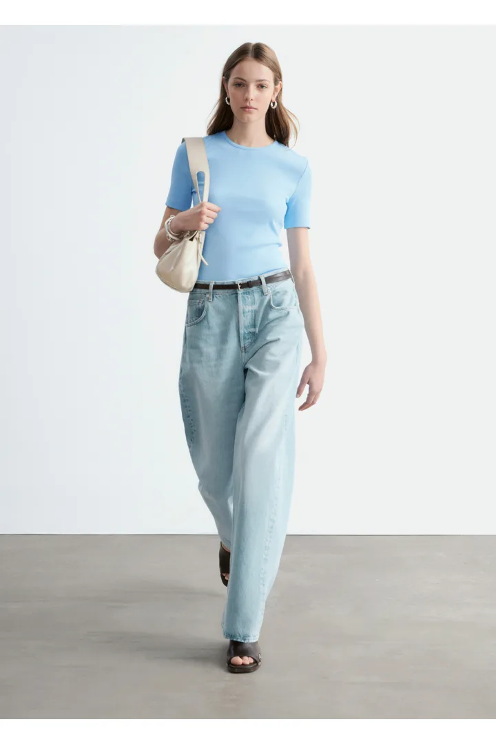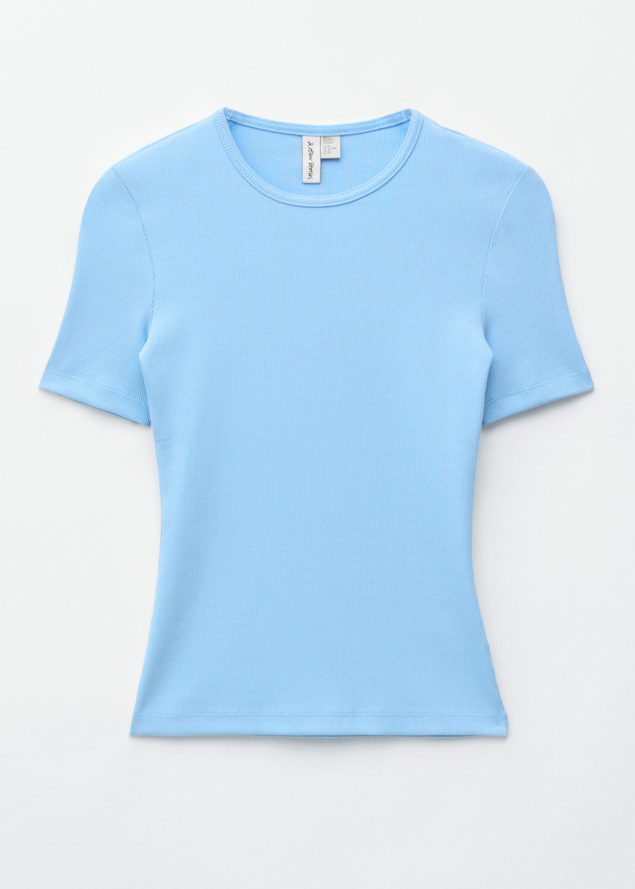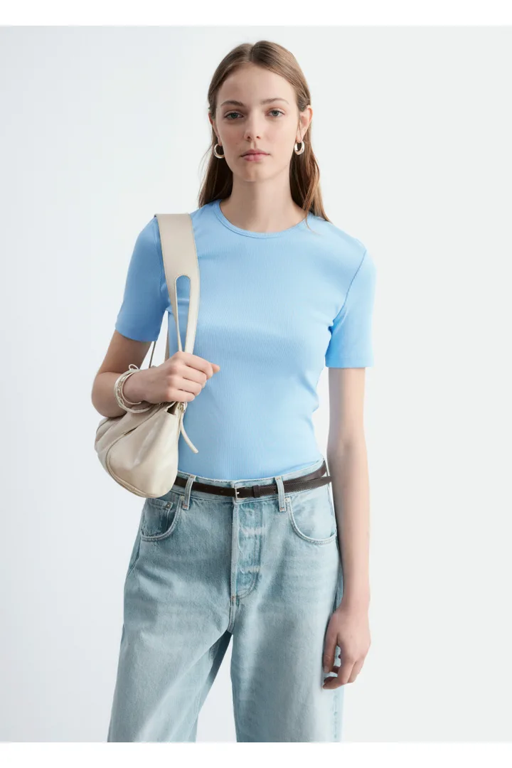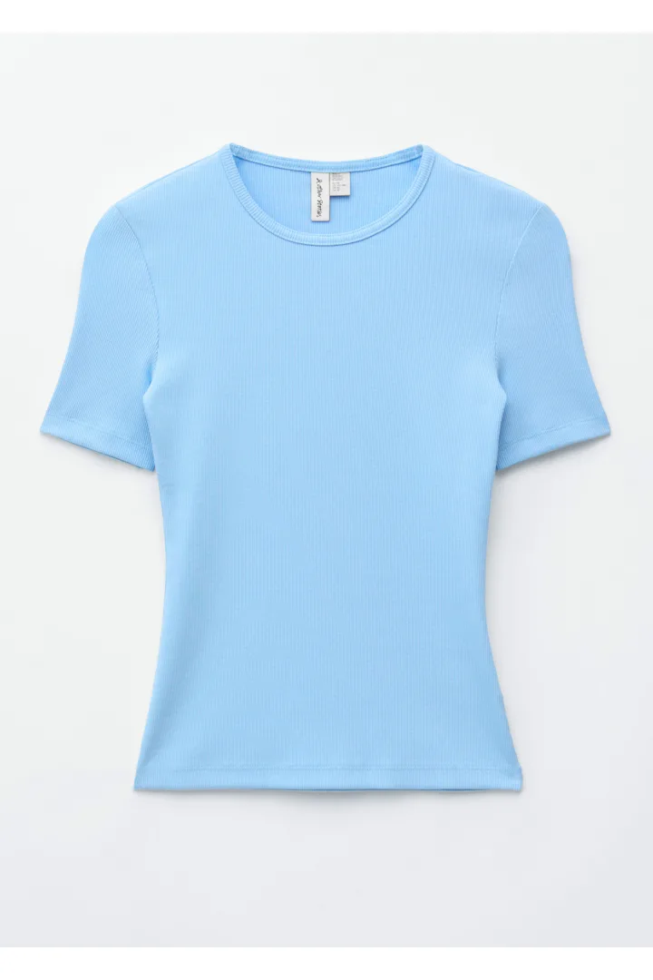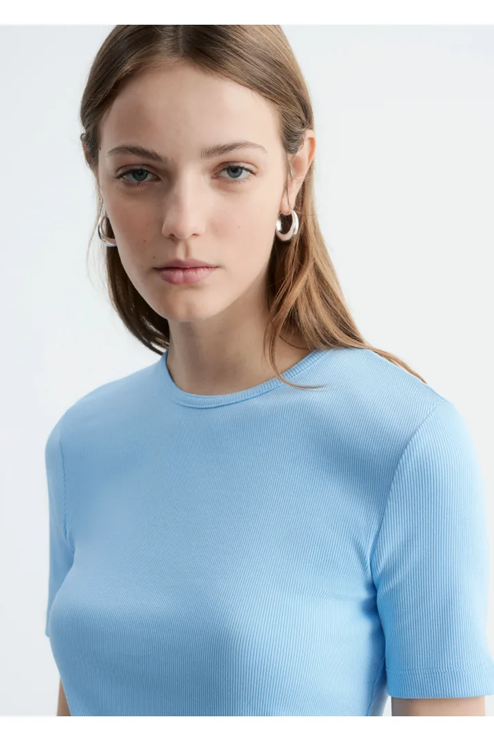 부드럽고 신축성 좋은 코튼 혼방 소재의 립 티셔츠예요. 슬림한 실루엣, 라운드 넥, 쇼트 슬리브가 특징이에요. 데님 진 또는 미니 스커트와 매치해 보세요.
