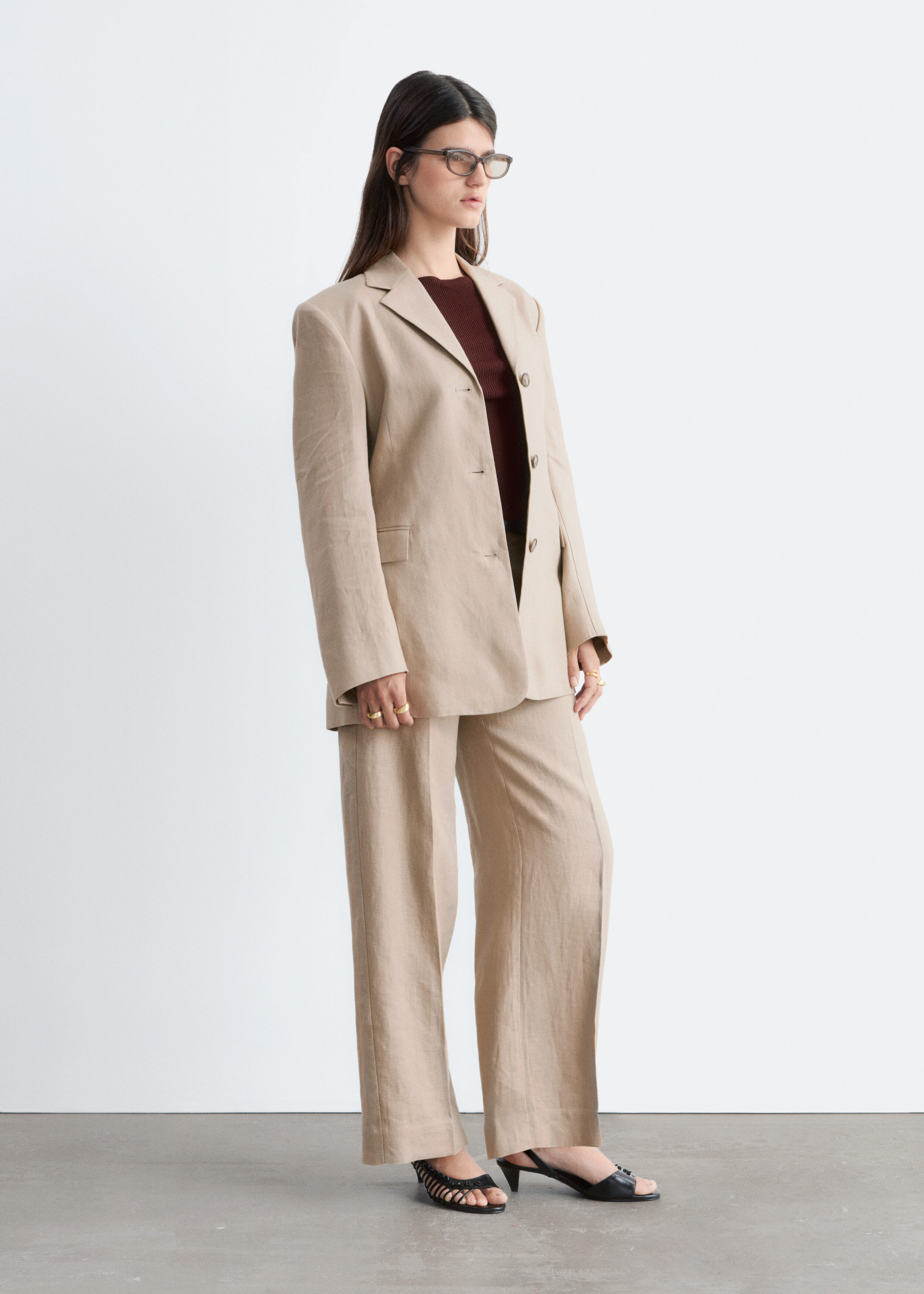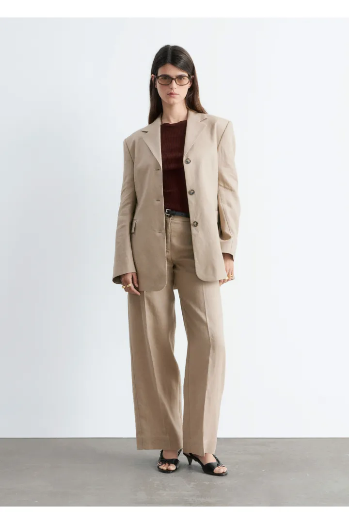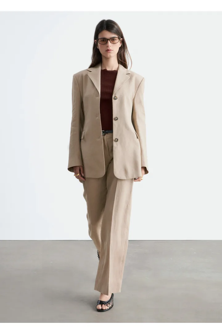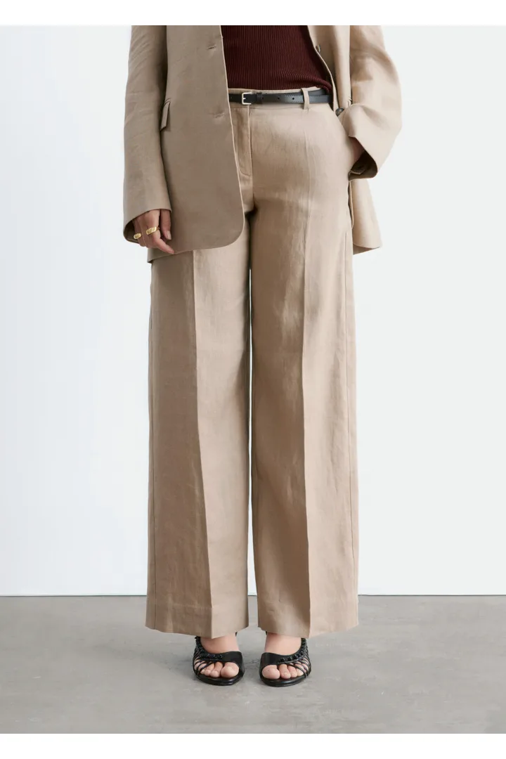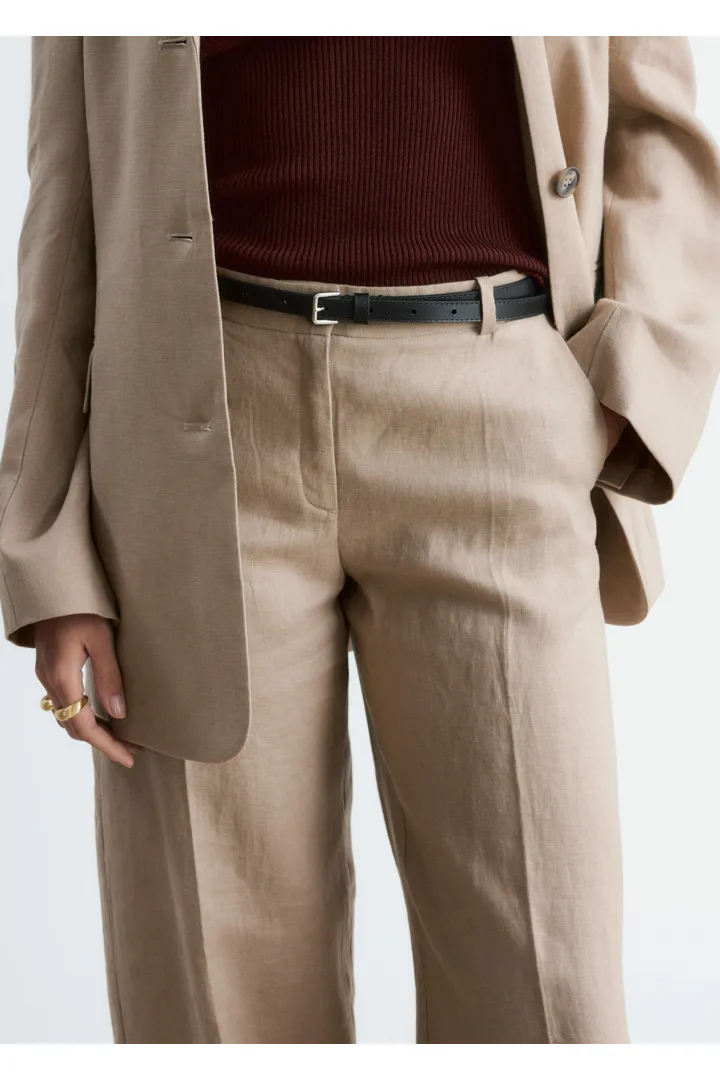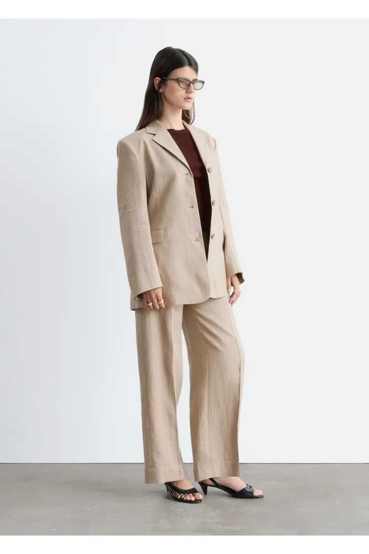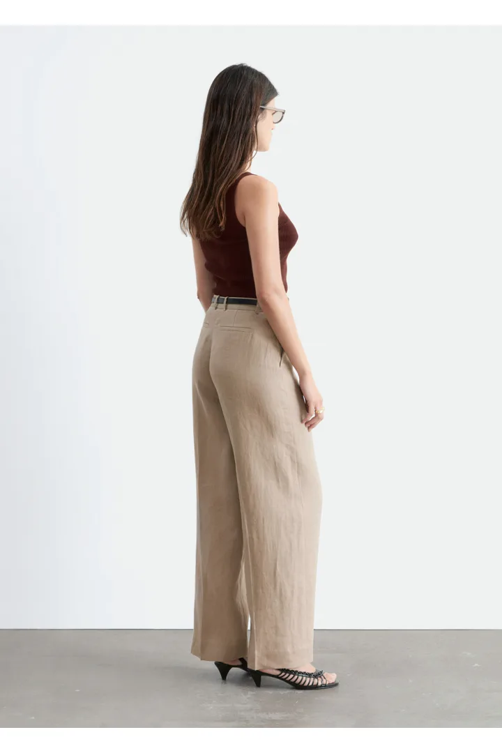클래식을 새롭게 재해석한 트라우저예요. 리넨 소재로 탄생했으며 루즈한 로우 웨이스트 실루엣이 특징이랍니다. 앞면과 뒷면의 프레스 주름이 입체감을 더해주며, 여유로운 쉐입과 구조적인 테일러드 스타일이 조화를 이루고 있어요