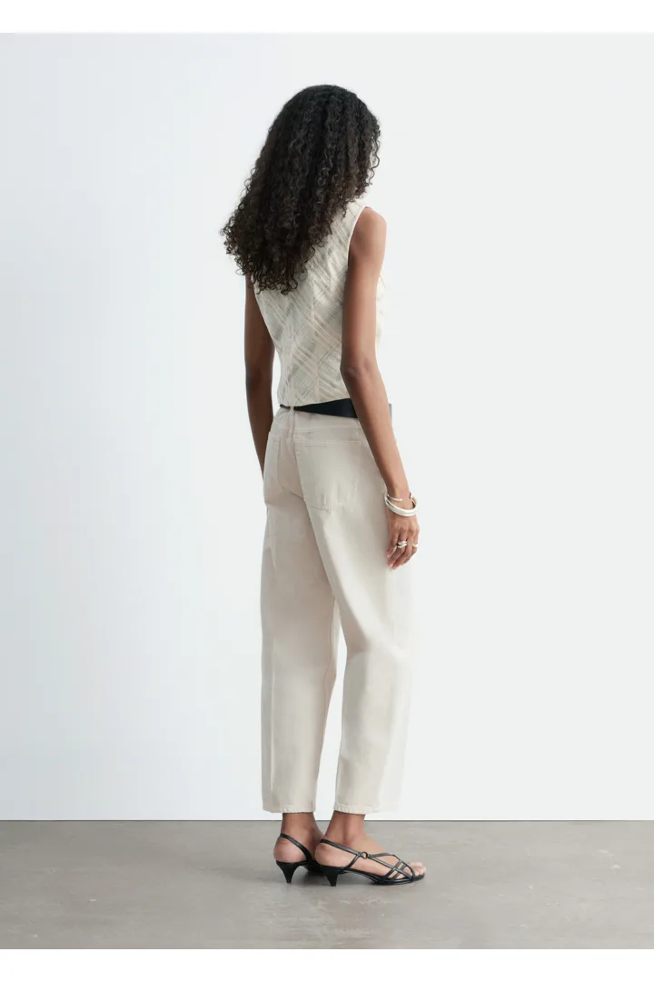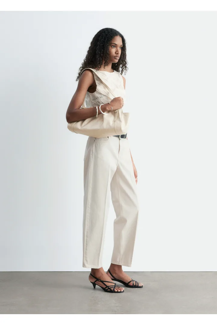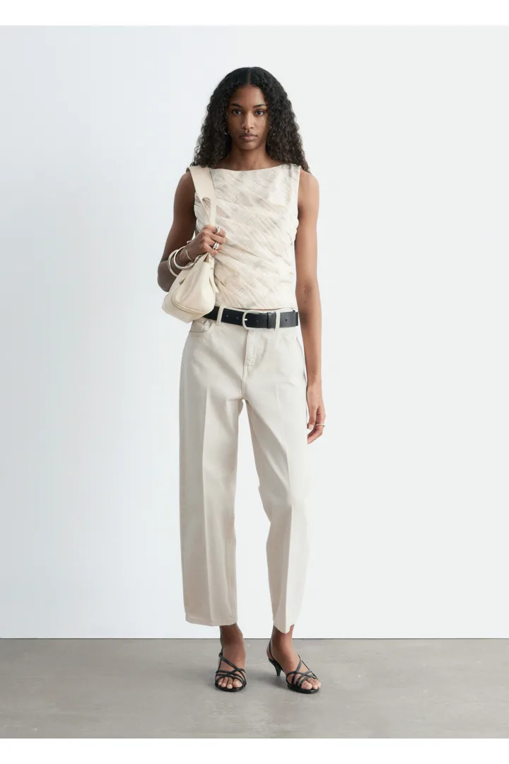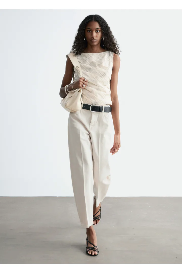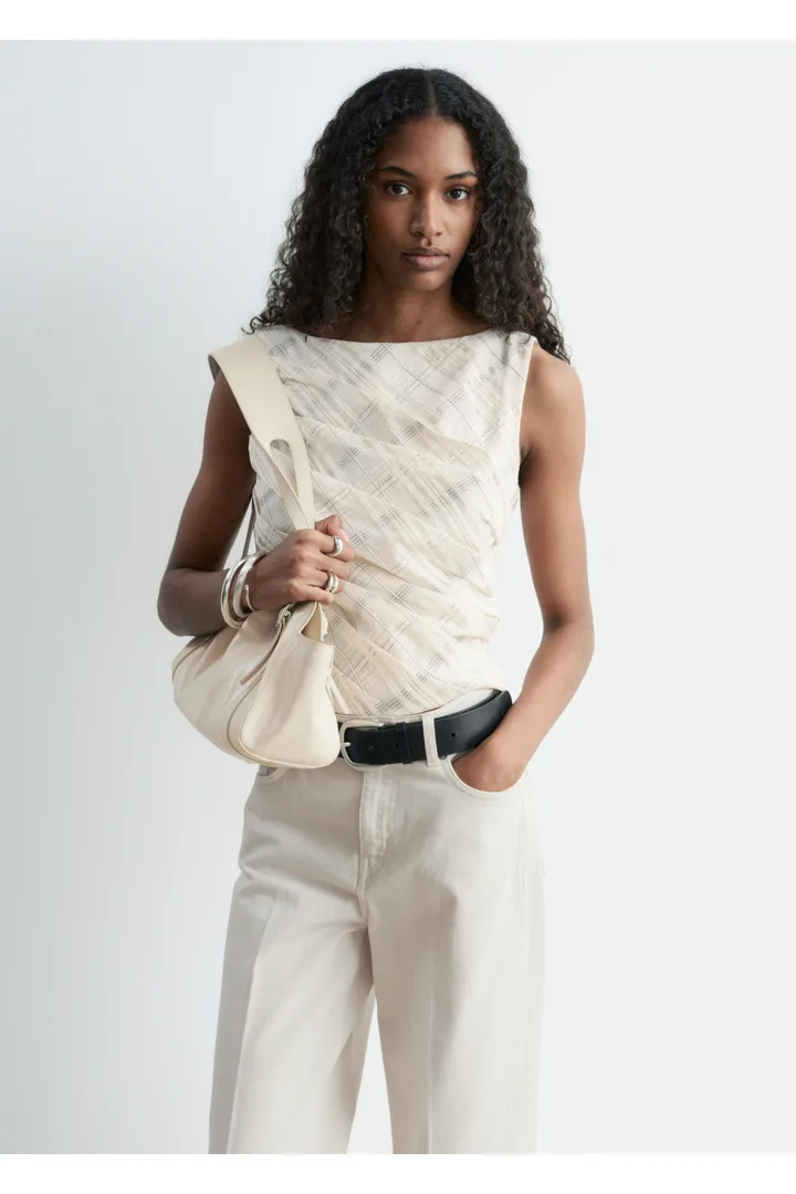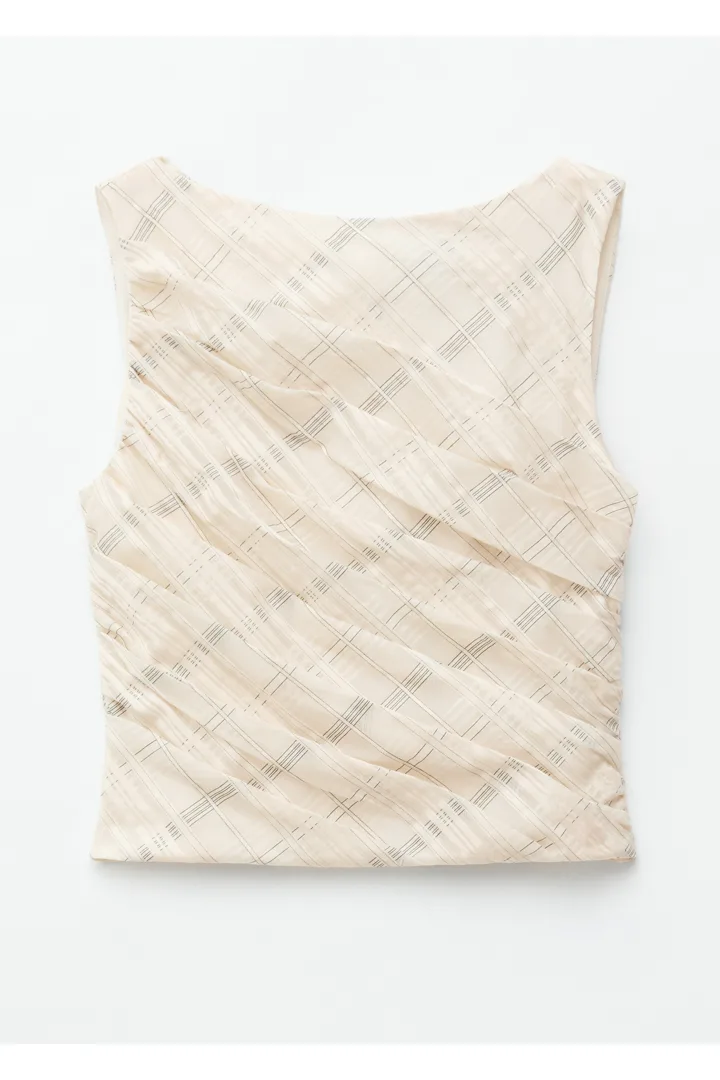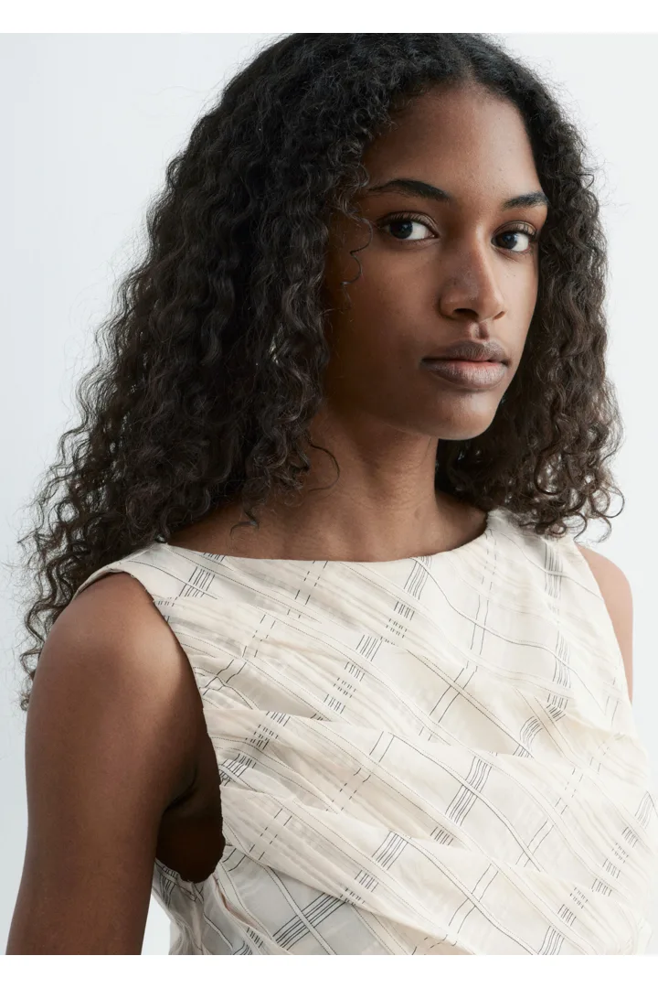 은은한 텍스처와 깔끔한 라인이 돋보이는 슬리브리스 탑이에요. 가벼운 코튼 소재로 탄생했으며, 정교한 주름 디테일이 구조감과 깊이를 더한답니다. 우아한 보트넥과 짧은 기장감으로 모던하고 활용도 높은 실루엣을 연출하며, 스커트나 트라우저와 자연스럽게 매치할 수 있어요.