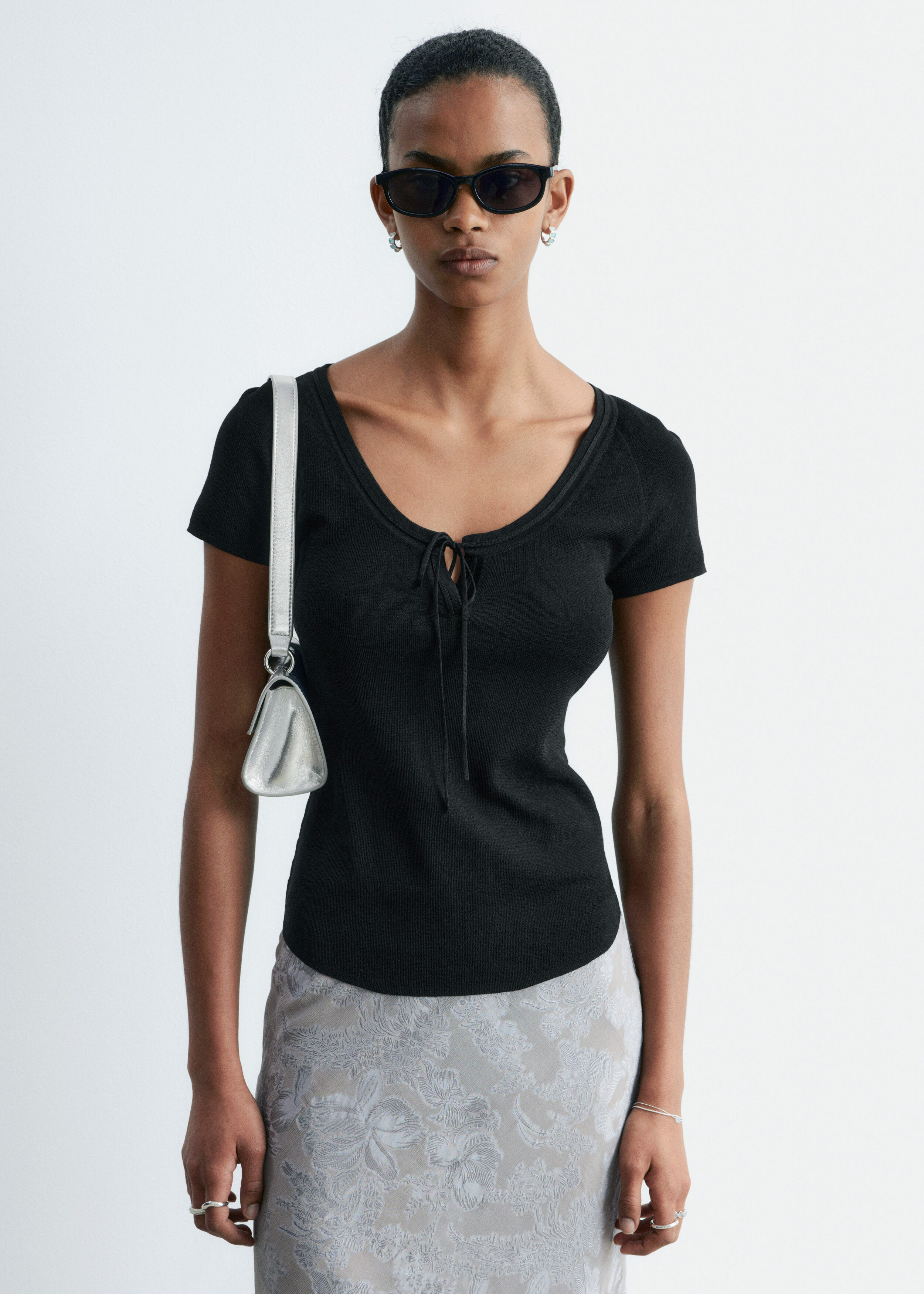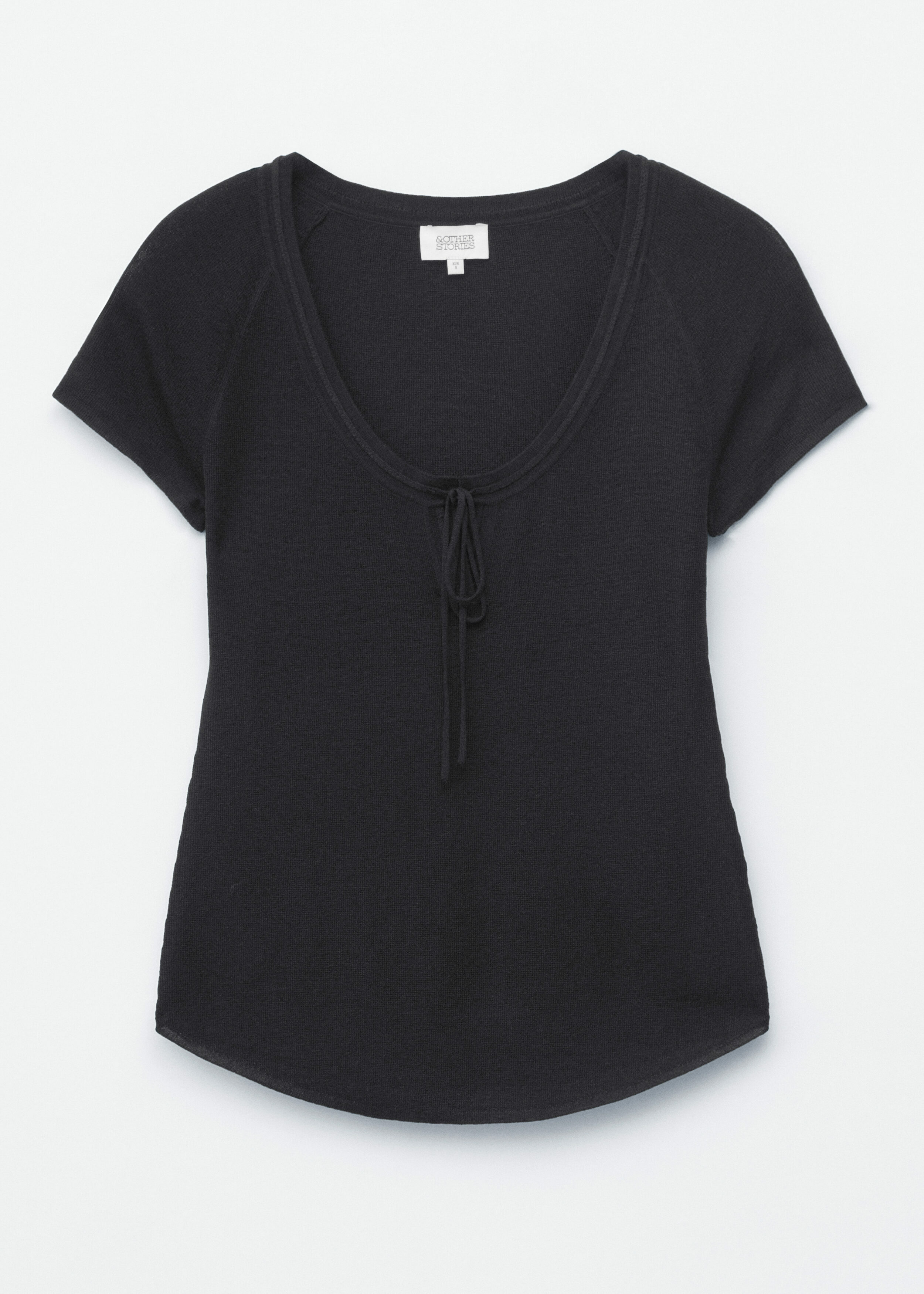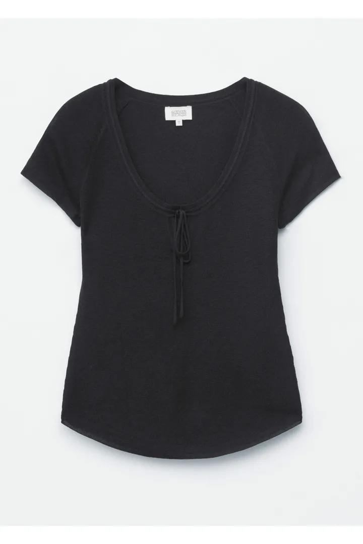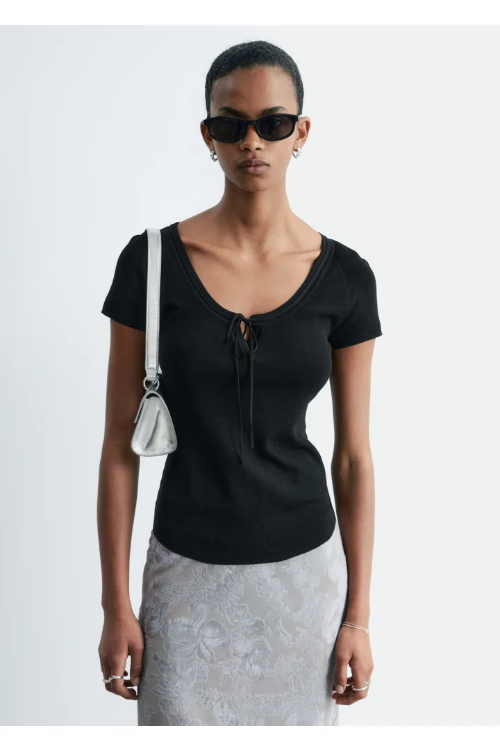 부드럽고 유연한 감각의 비스코스 혼방 니트로 탄생한 탑이에요. 앞면 중앙의 키홀 디테일과 타이가 특징이에요. 레글란 쇼트 슬리브, 립 트리밍, 곡선형 밑단이 자리해 있답니다.