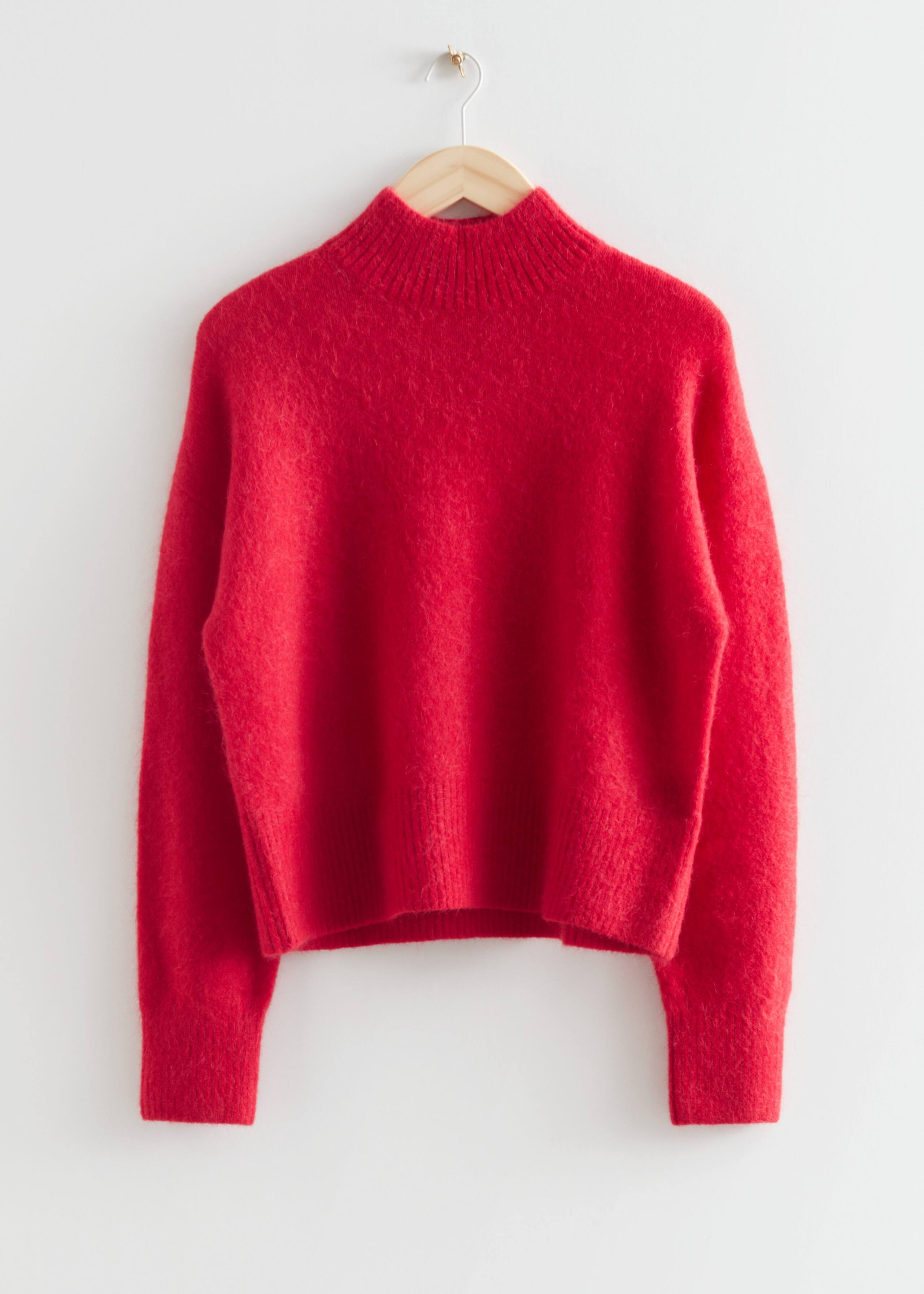 Krótki dzianinowy sweter z półgolfem o pudełkowym fasonie.