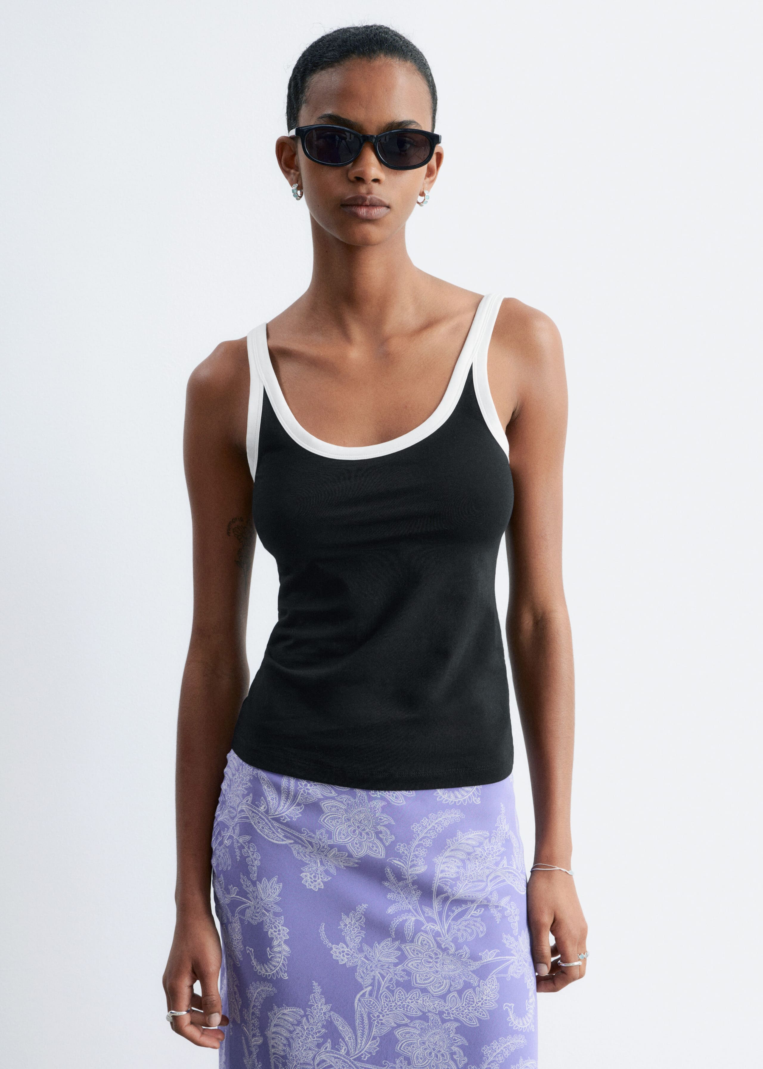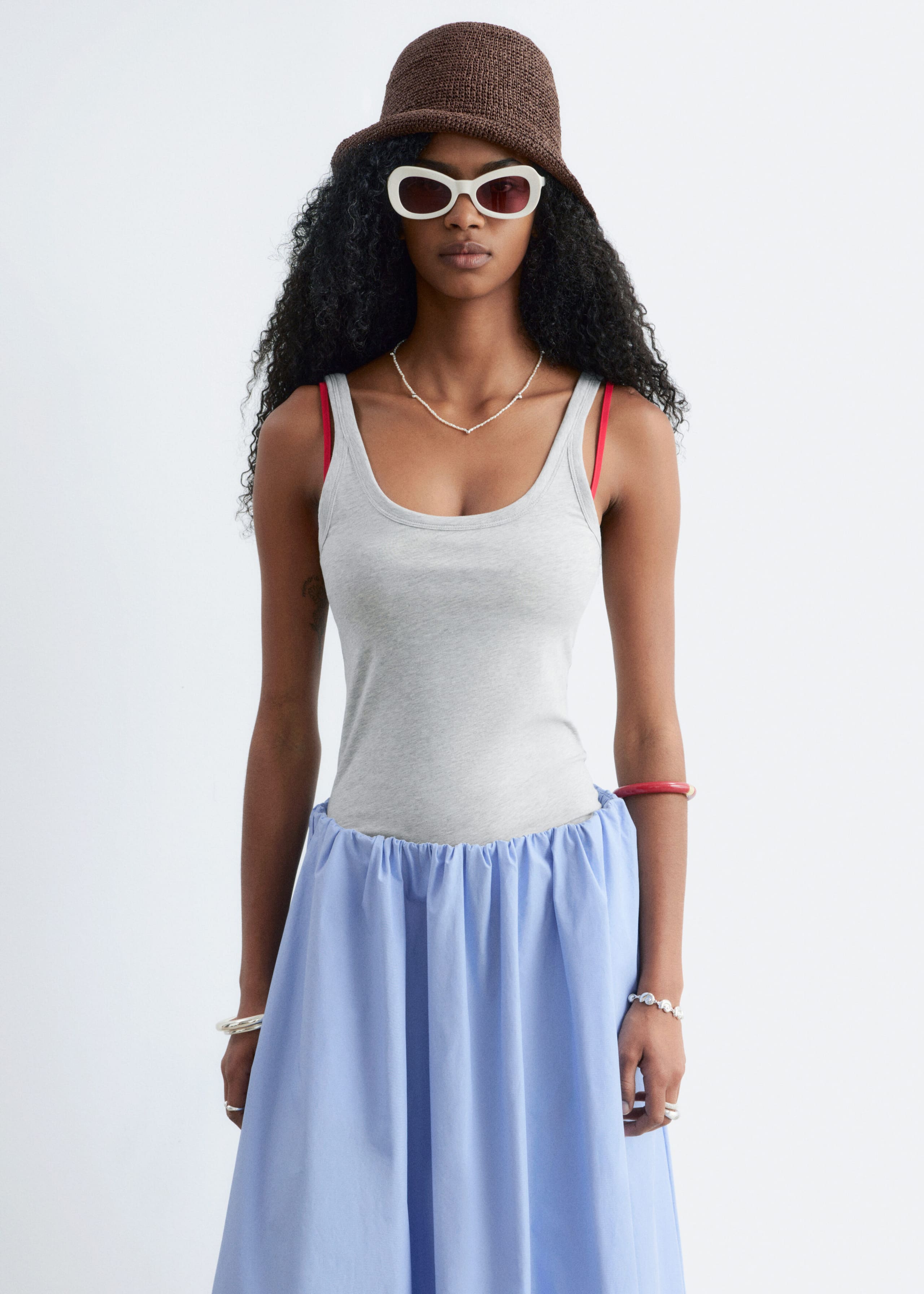 Wykonany z czystego jedwabiu top bez rękawów w romantycznym stylu. Marszczenia przy dekolcie i falbanka w talii. Ukryty zamek błyskawiczny pośrodku pleców.