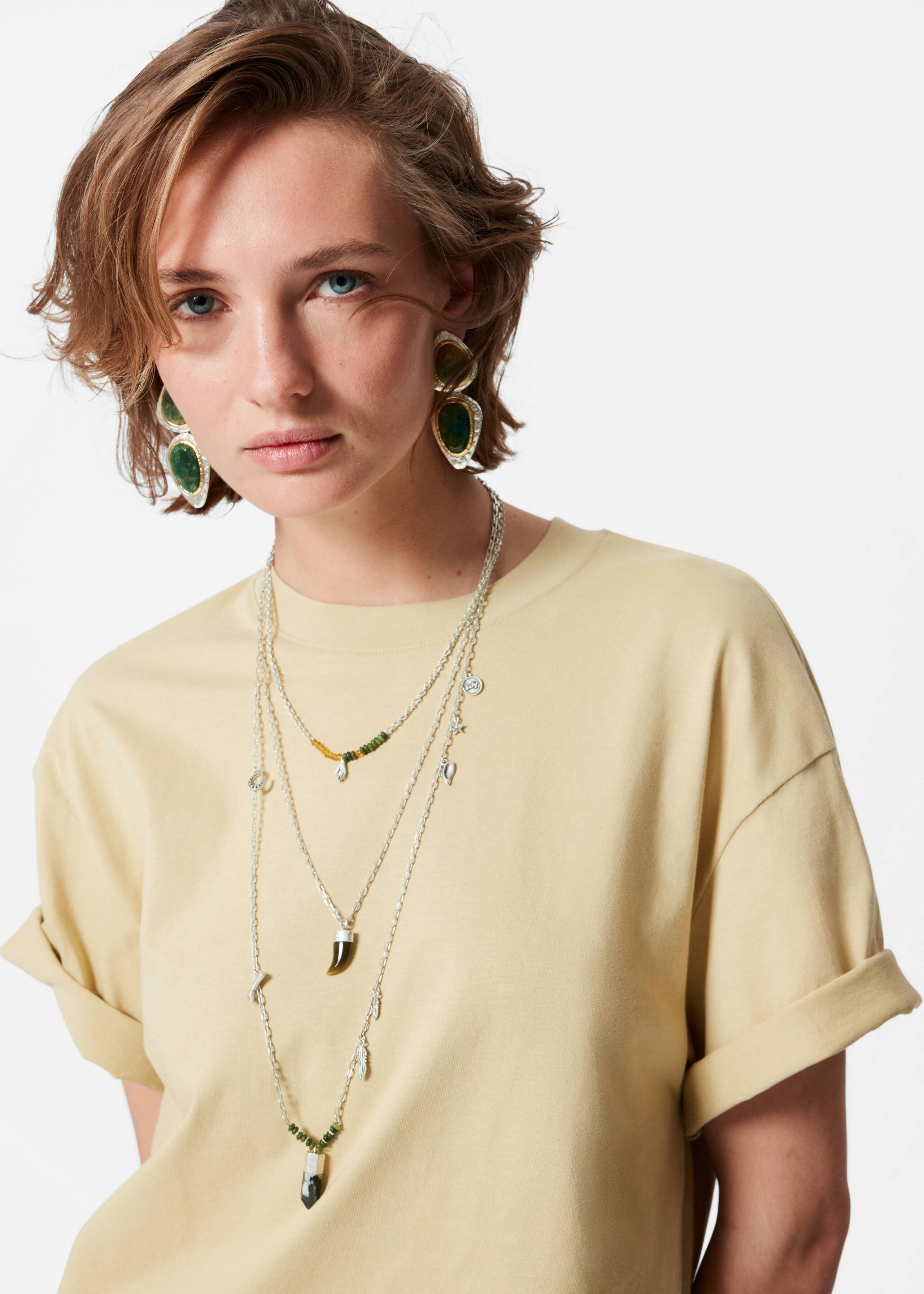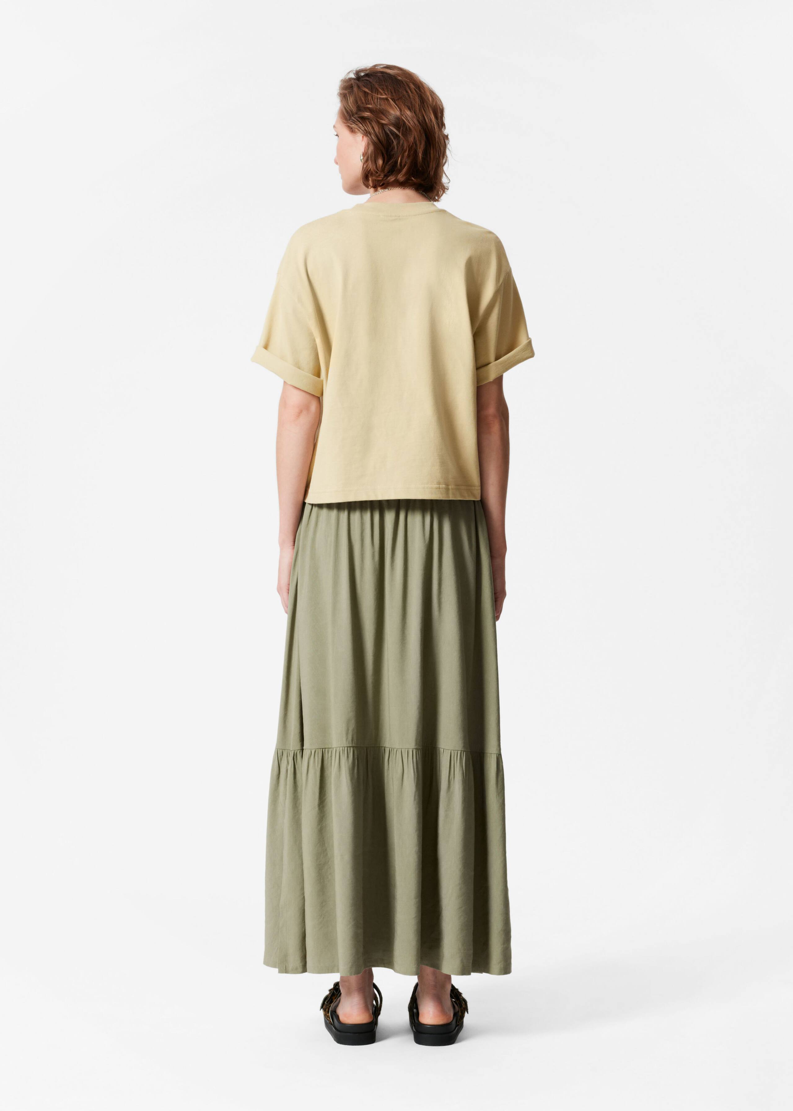En boxig t-shirt i mjuk bomullstrikå med lös passform. Klassisk rund hals och korta, vida ärmar. Ett perfekt basplagg i din vardagsgarderob.