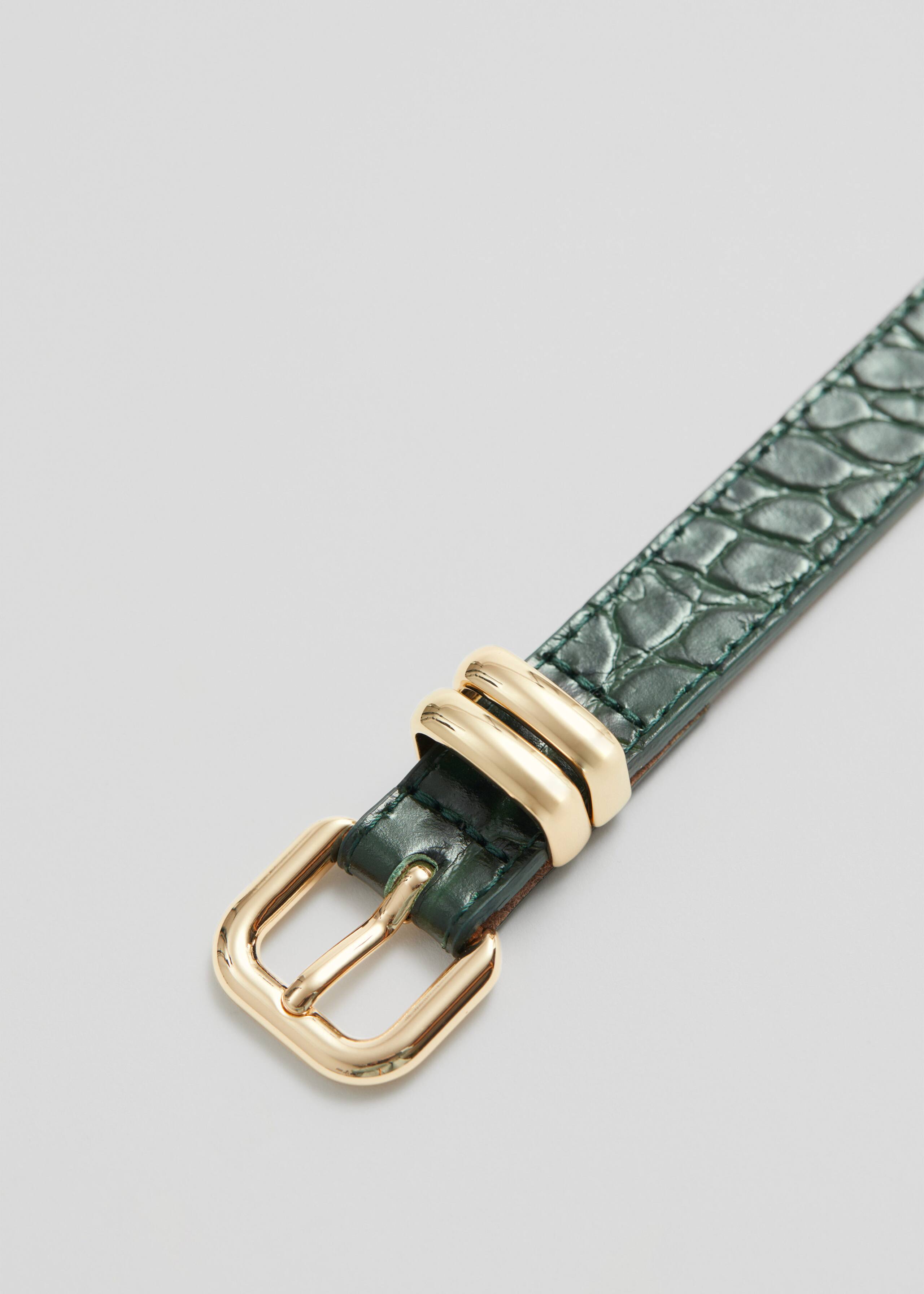 Läderskärp med ett fyrkantigt spänne i guldfärgad metall.