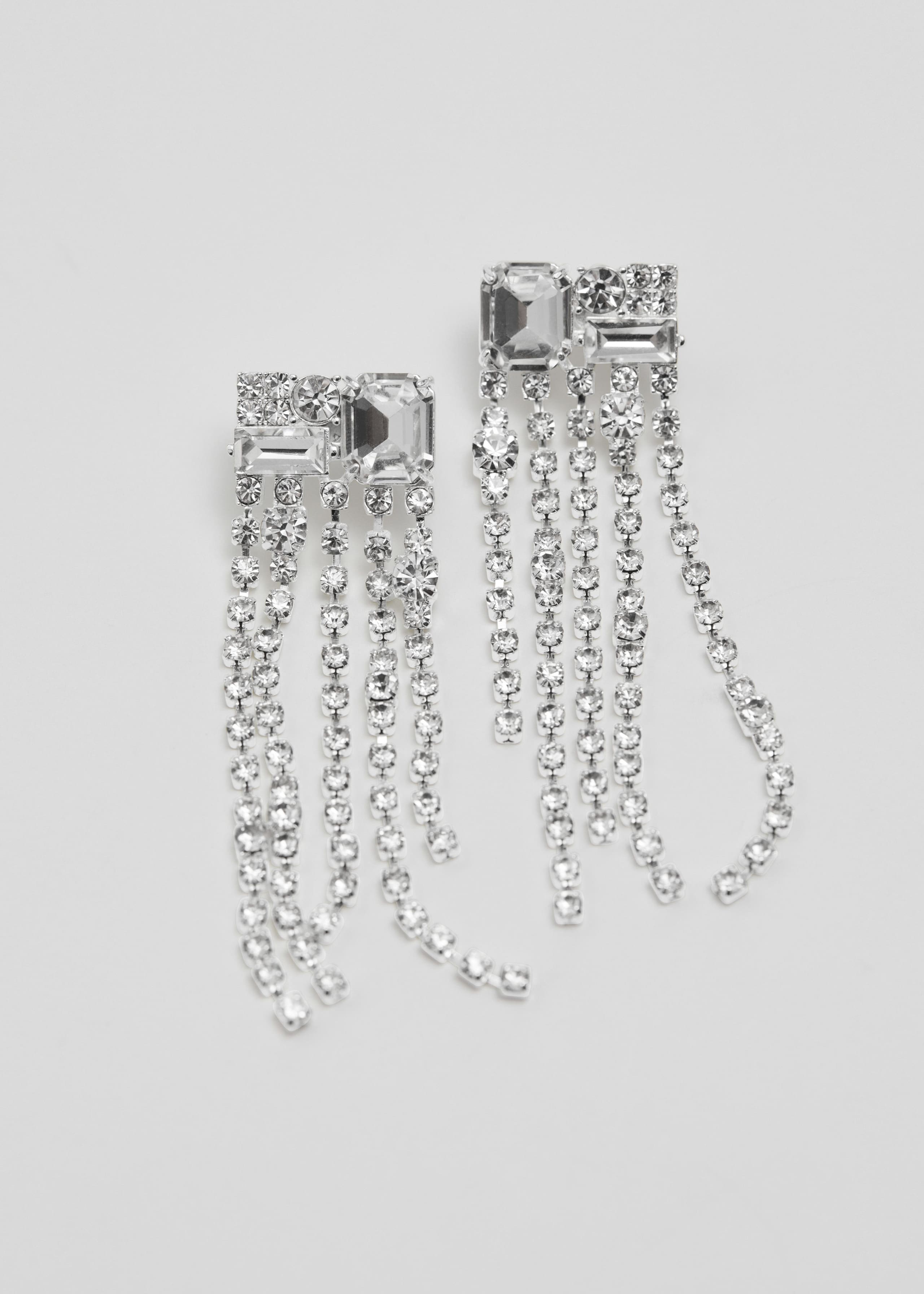 Gnistrande silverfärgade örhängen med asymmetriska fransar av små strasstenar för en dramatisk effekt.