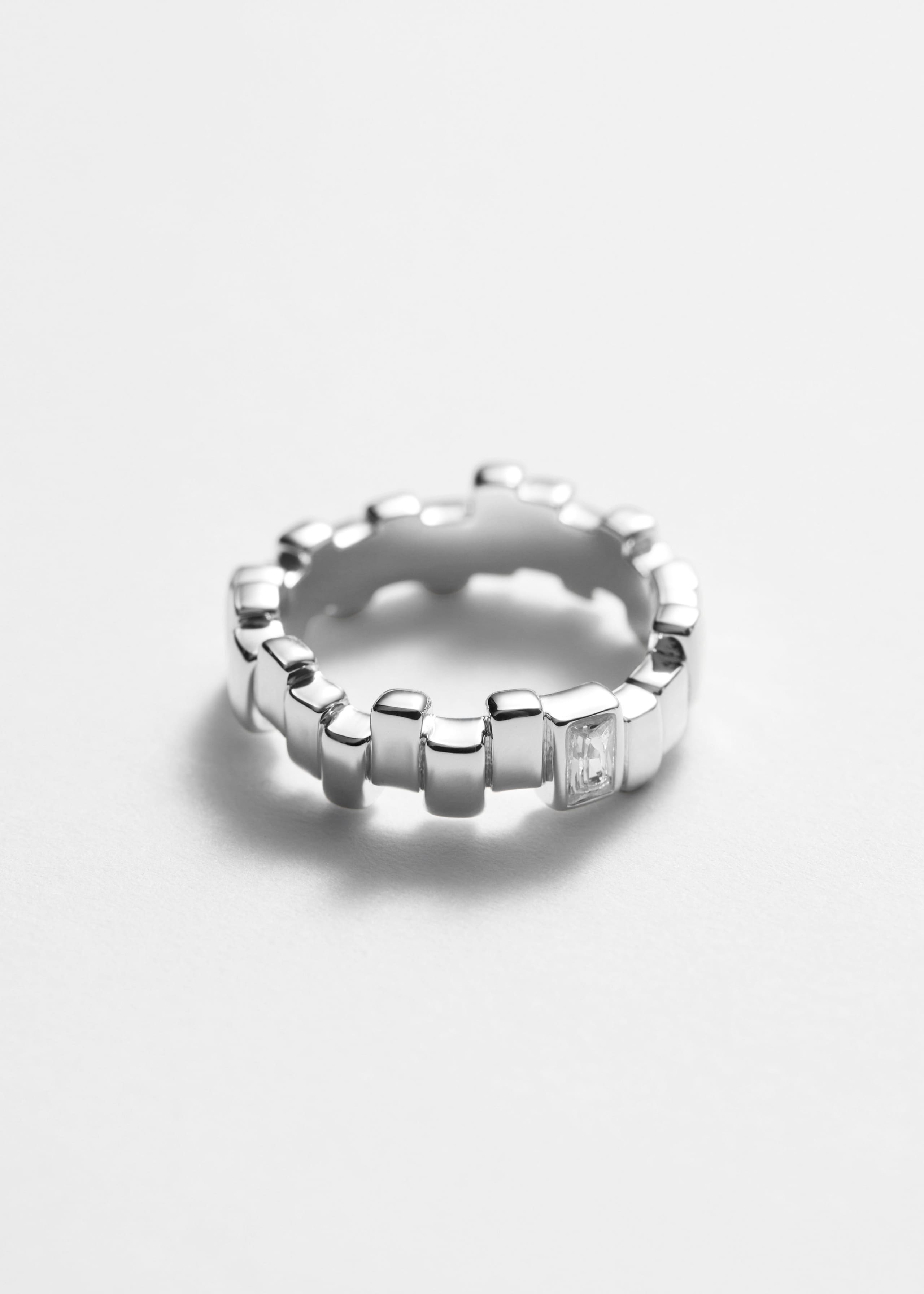 Ring med en geometrisk design i polerad mässing med en gnistrande sten.