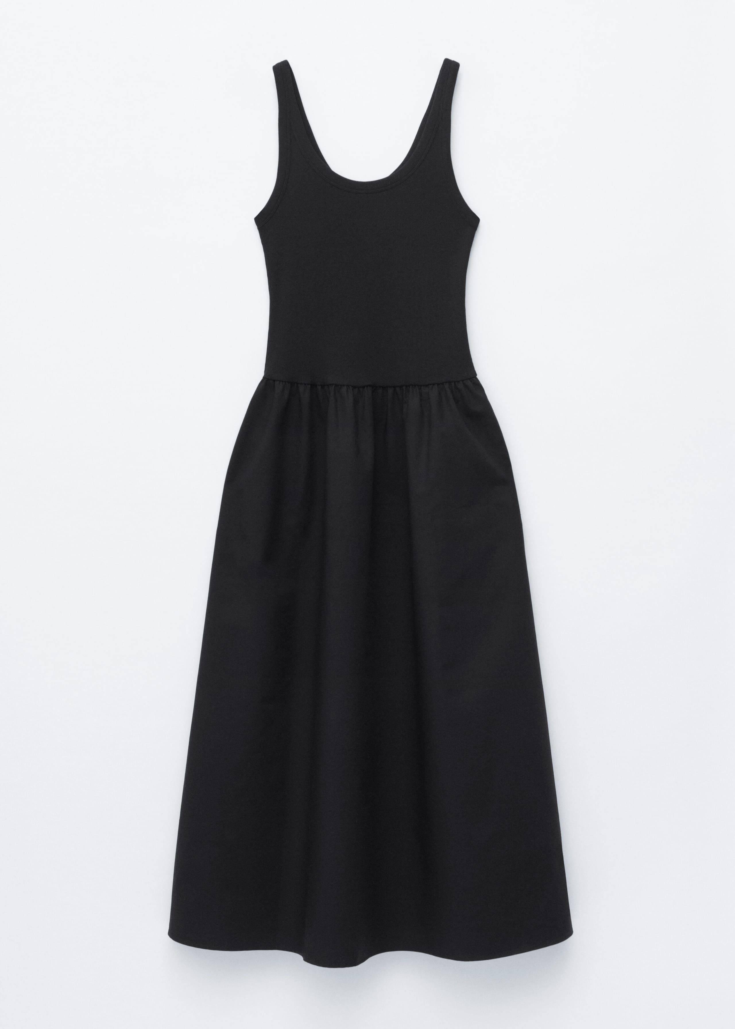Ärmlös midiklänning med båtringning, figurnära silhuett och draperade detaljer.