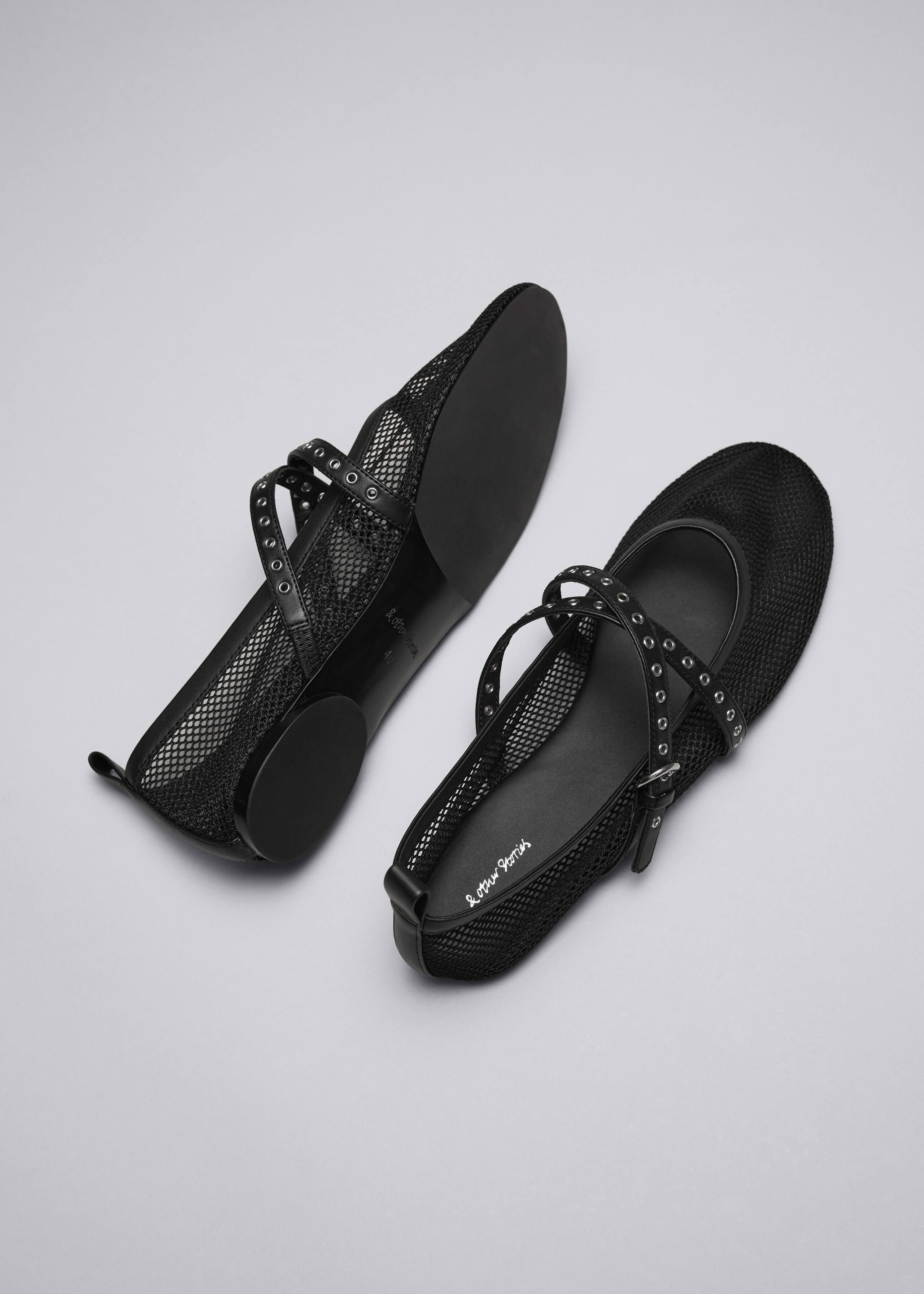 Ballerinaskor i mesh med läderdetaljer och justerbara korsade remmar. Silverfärgade öljetter och spännen.