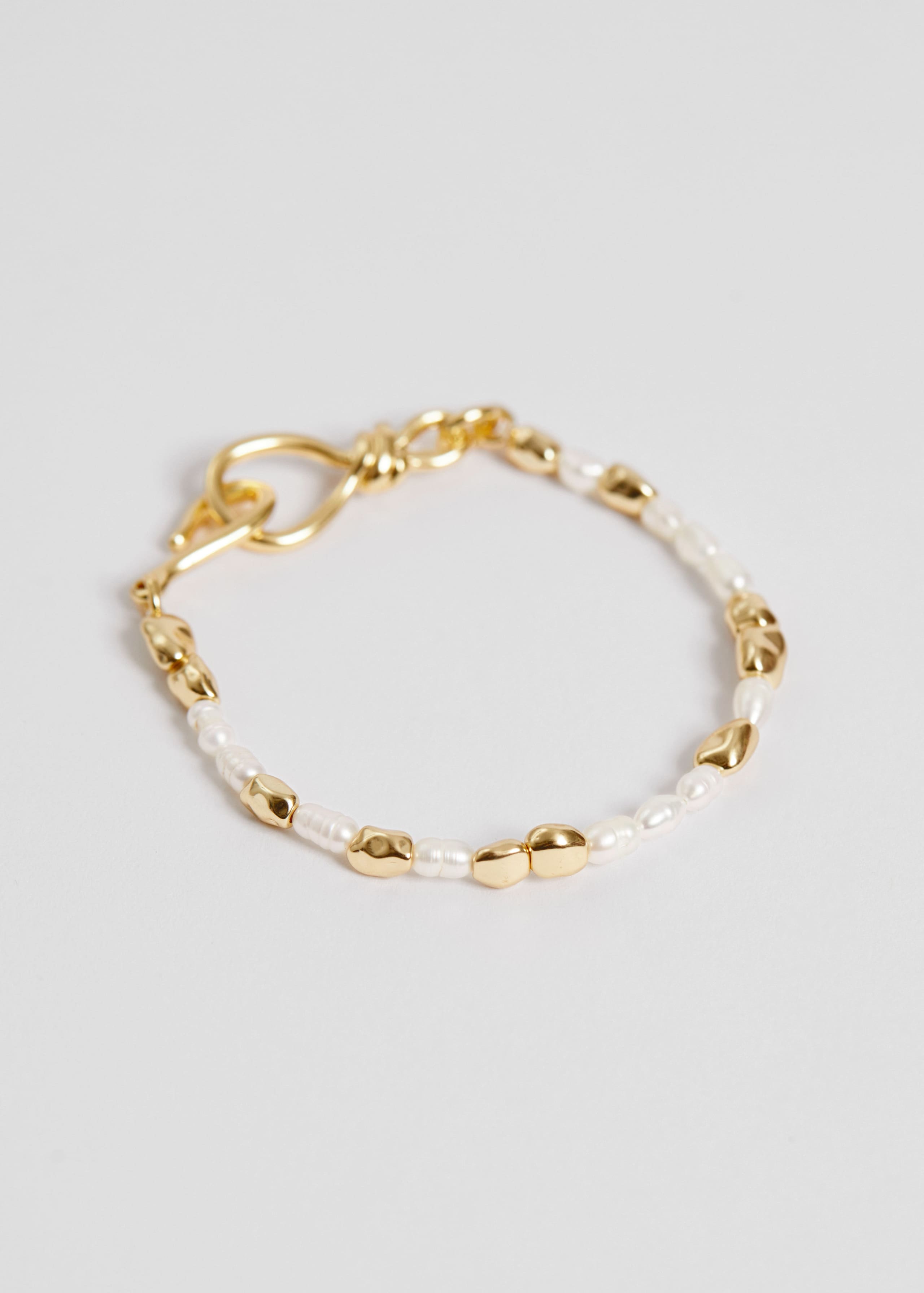 Regnbågsskimrande armband med sötvattenspärlor och guldfärgade pärlor. Stängs med en guldfärgad hake.
