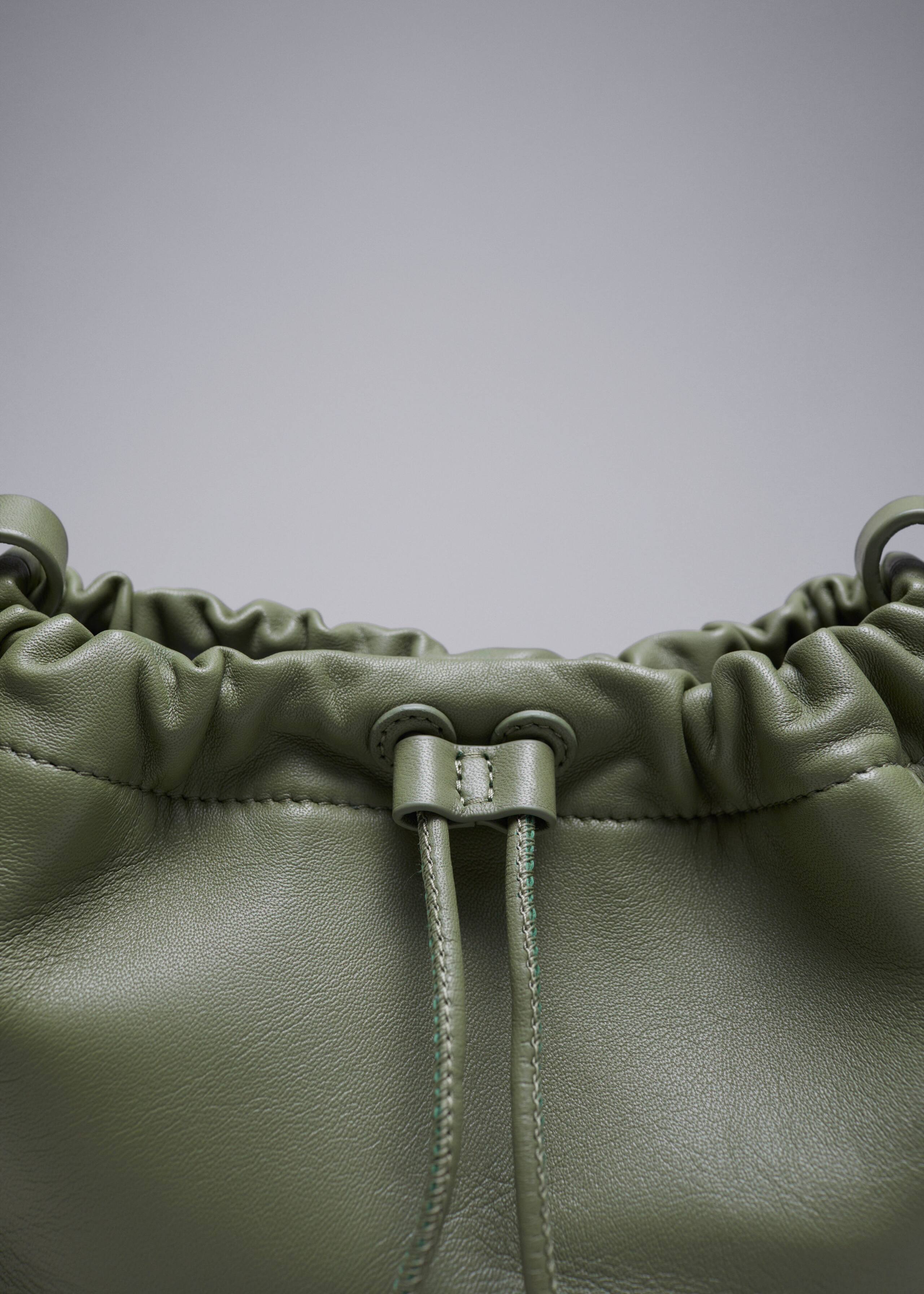 Axelremsväska i mjukt läder med en dragsko som skapar mjuka veck. Fodrad med bomullstyg. Innerficka med dragkedja, justerbar axelrem och magnetisk stängning.