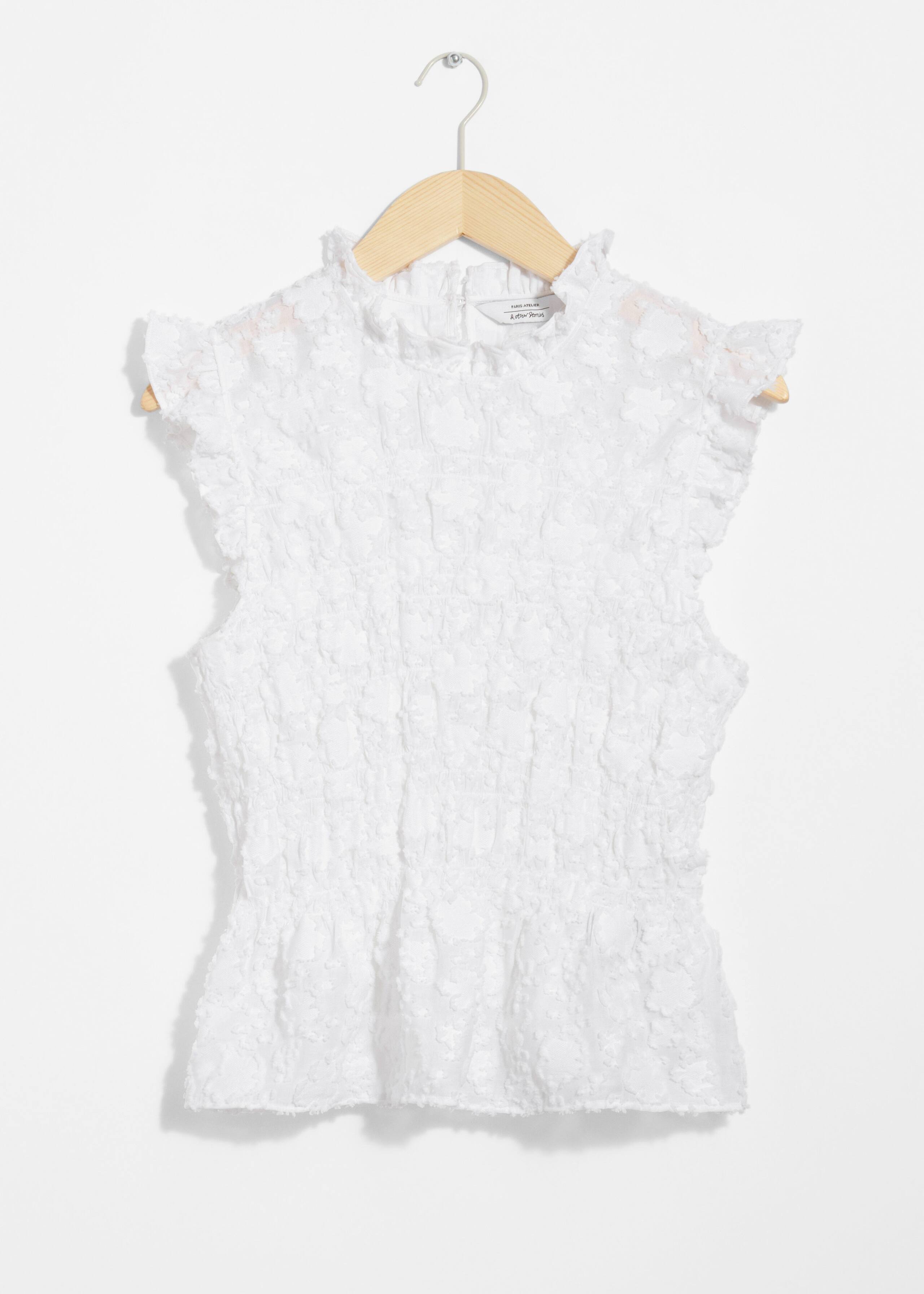Ärmlös och smockad topp med peplumdesign. Volangdetaljer vid halsringningen och runt ärmhålen.