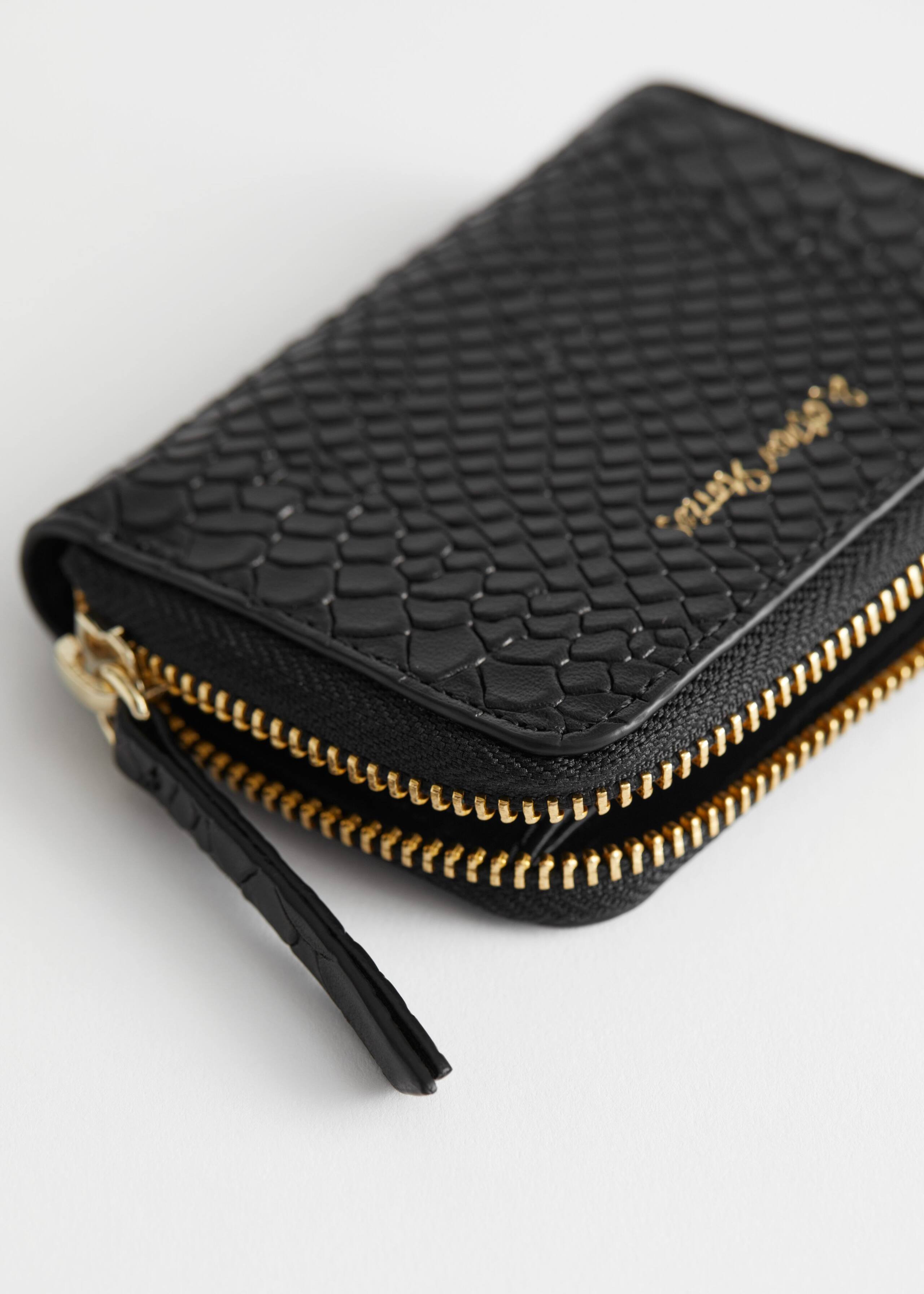 Läderplånbok med präglat ormmönster och två fack för kort och mynt. Guldfärgad dragkedja och en "& Other Stories"-logotyp.