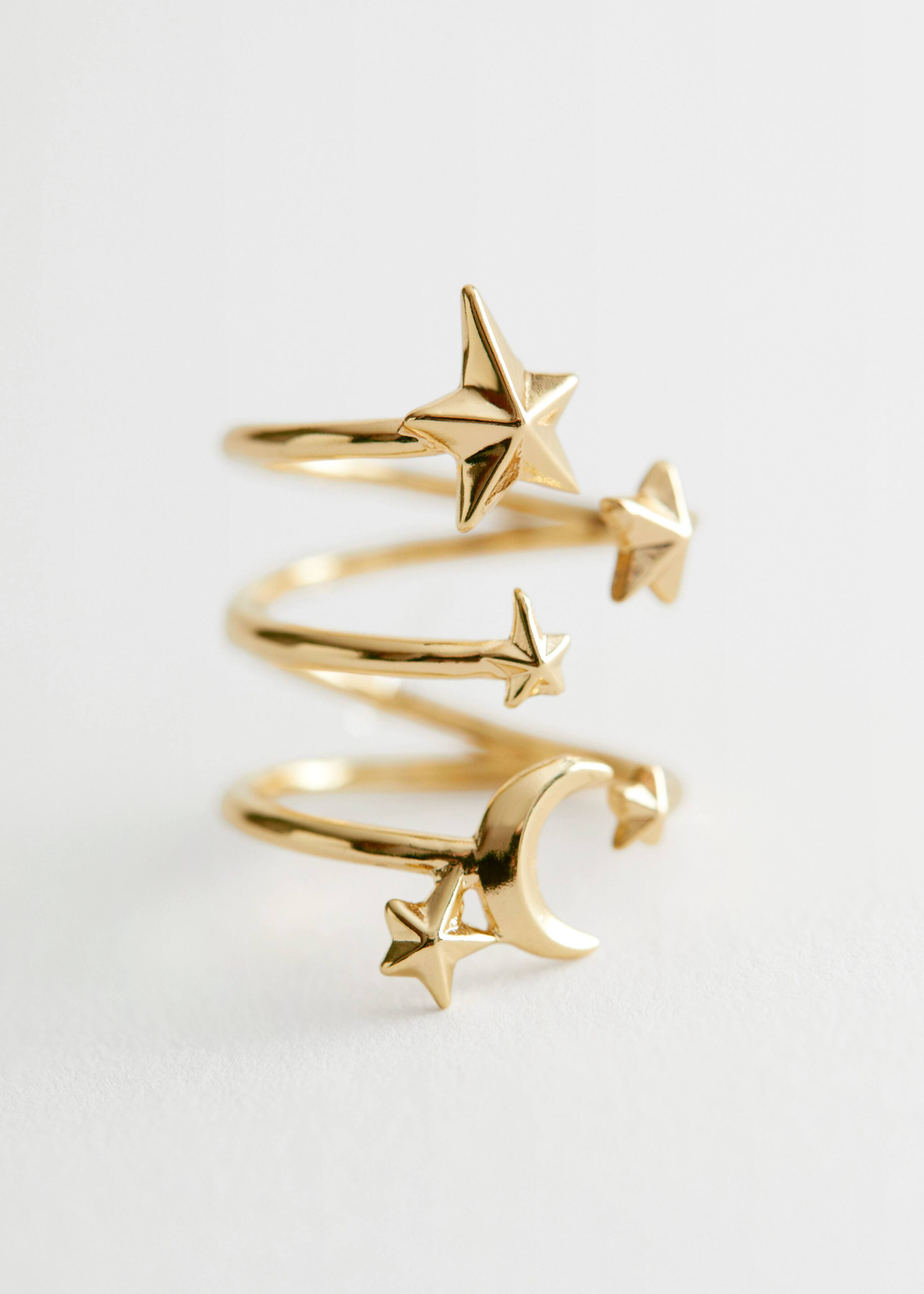 Guldfärgad ring i tre rader med en måne och fem stjärnor.