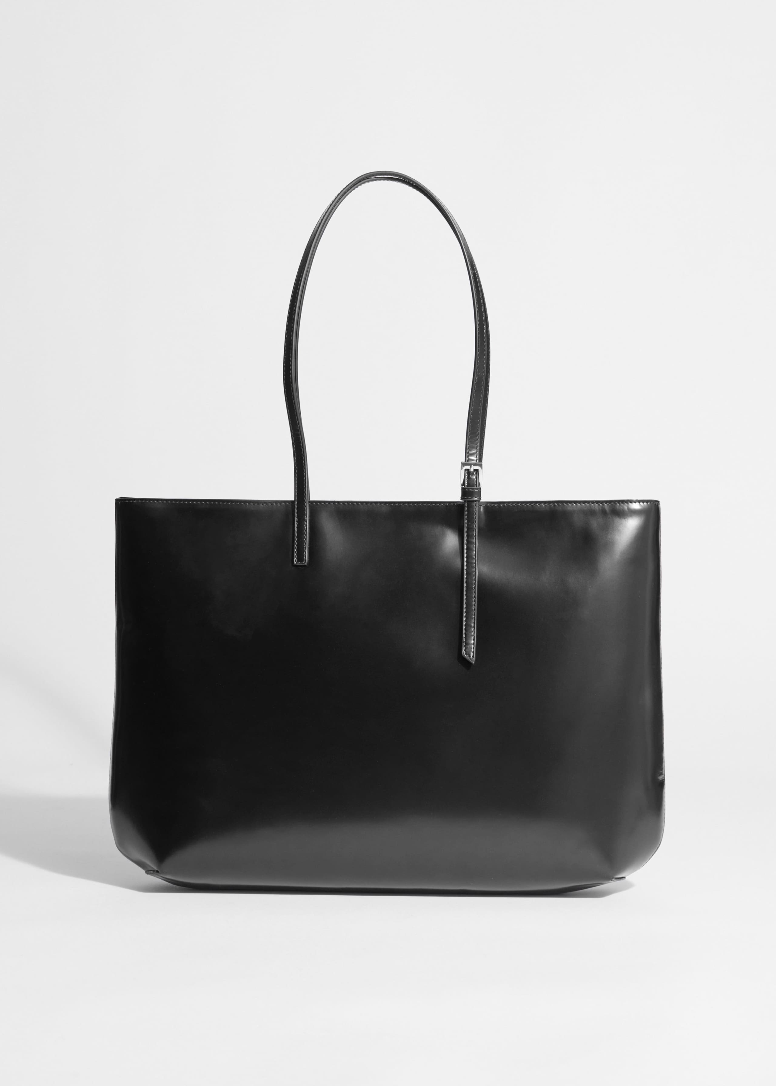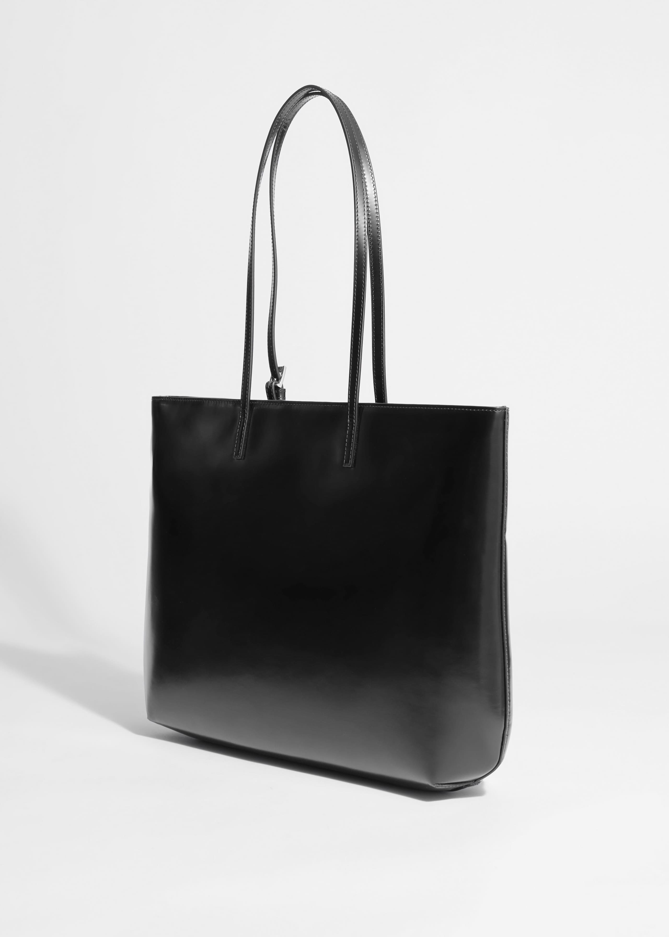 Väska i blankt läder med en minimalistisk silhuett och silverfärgade detaljer. Den bomullsfodrade insidan har plats för en bärbar dator, pocketbok och vattenflaska. Använd innerfickorna för din telefon och korthållare. Stängs med dragkedja.