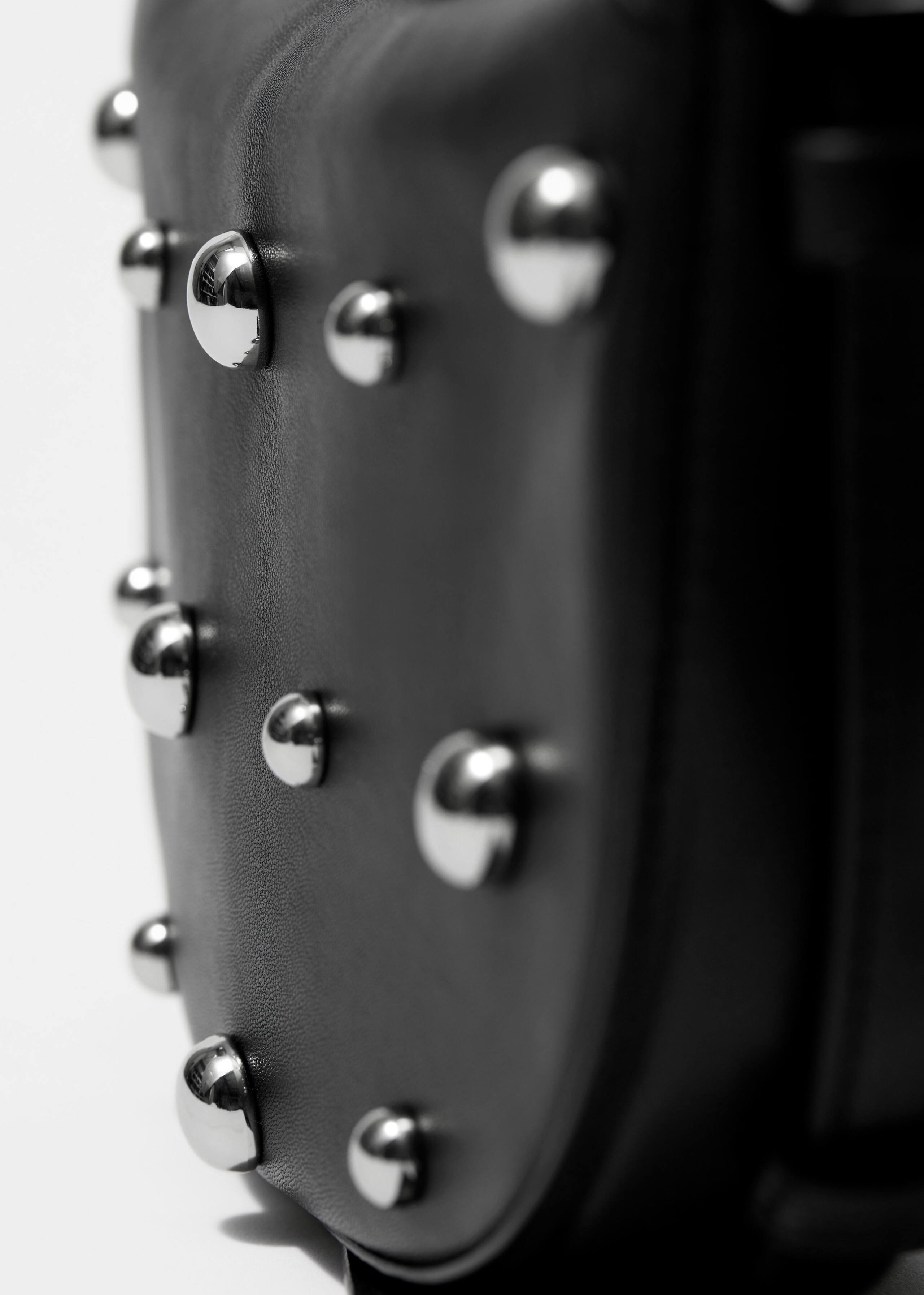 En liten axelremsväska i läder med nitar, reglerbar rem och silverfärgade detaljer.