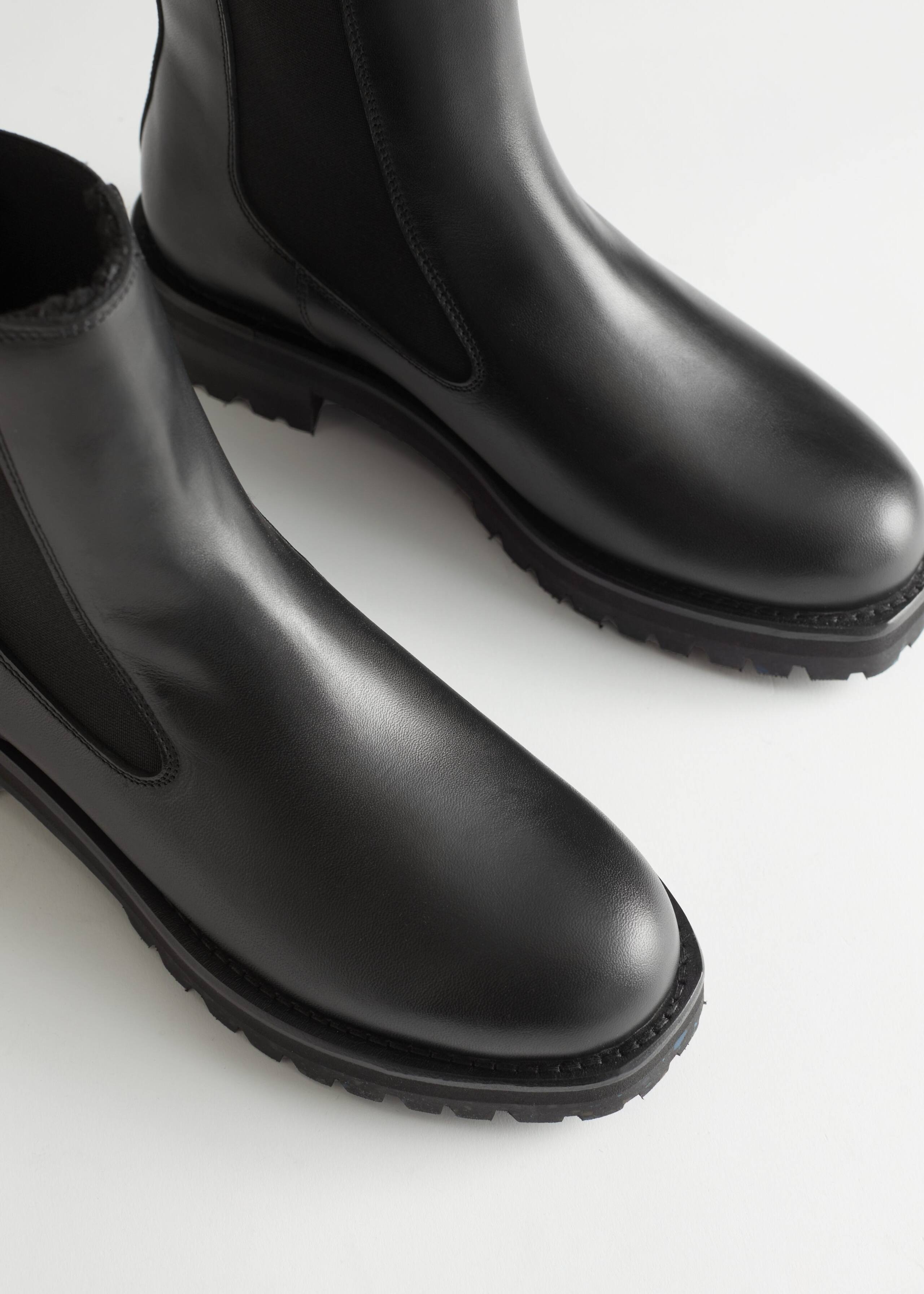 Chelsea boots av läder med rundad tå och grova sulor. Elastiska sidopaneler och fodrade med en teddy av fuskpäls.