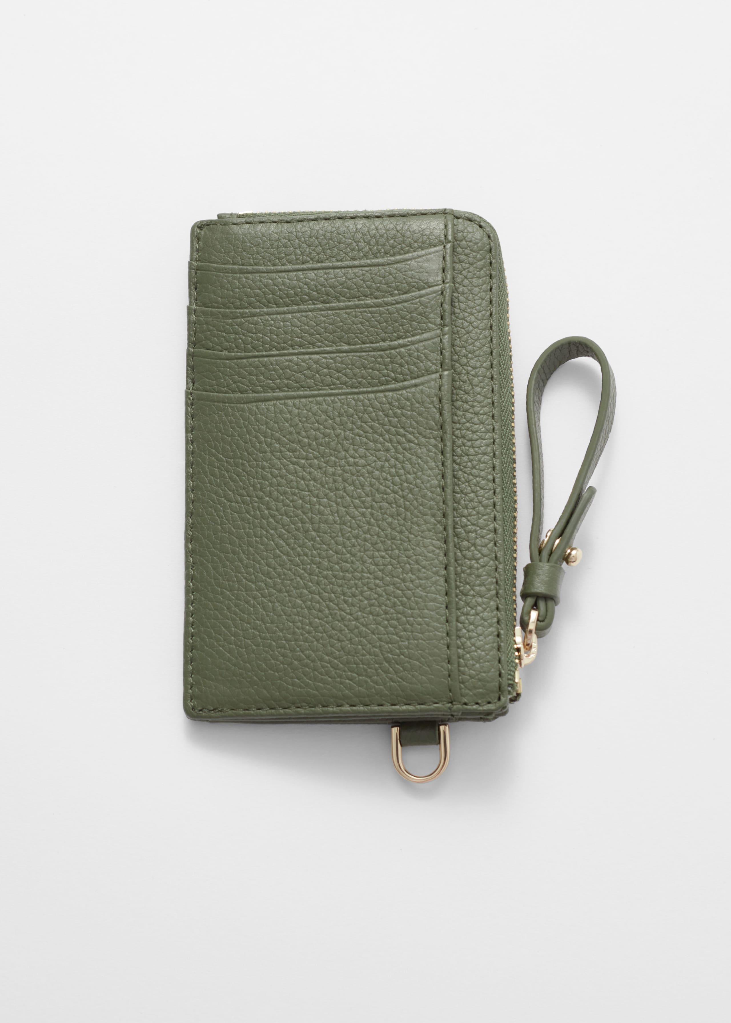 Läderplånbok med ett fack med dragkedja och dragflik, kortfack och guldfärgade detaljer.
