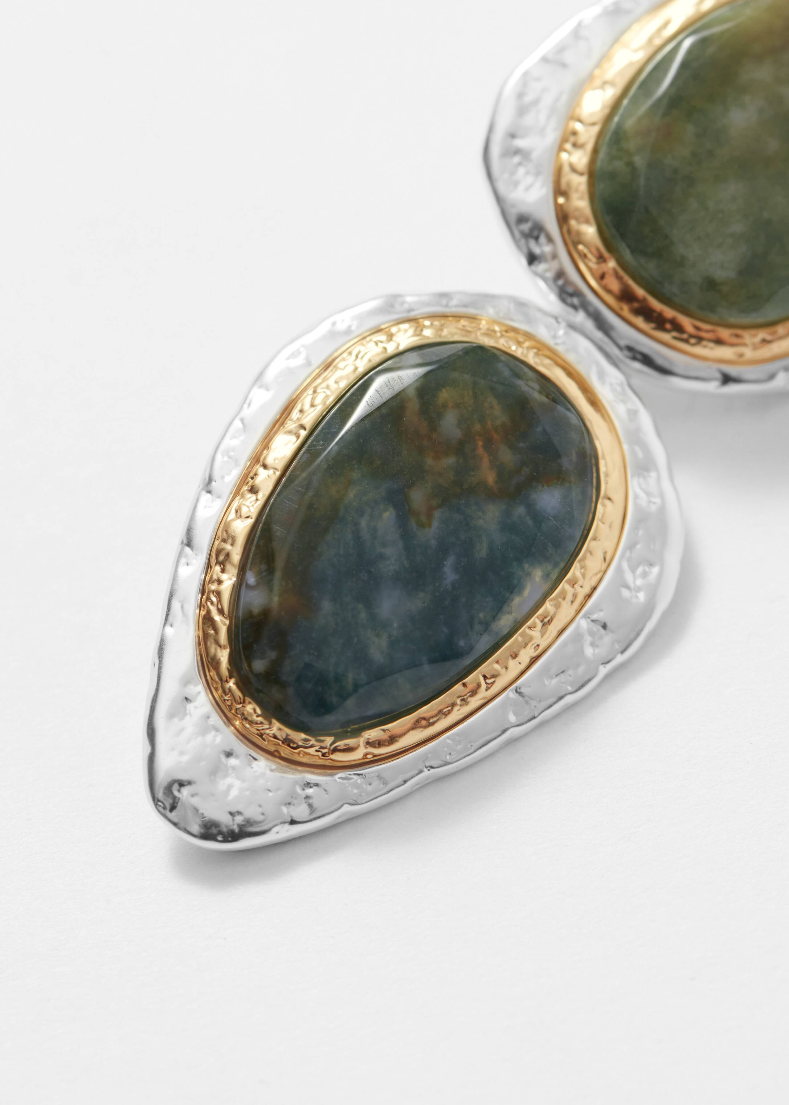 Örhängen i form av två sammanlänkade silverfärgade delar med oregelbunden form. Varje del har en fasettslipad sten med guldfärgade kanter.