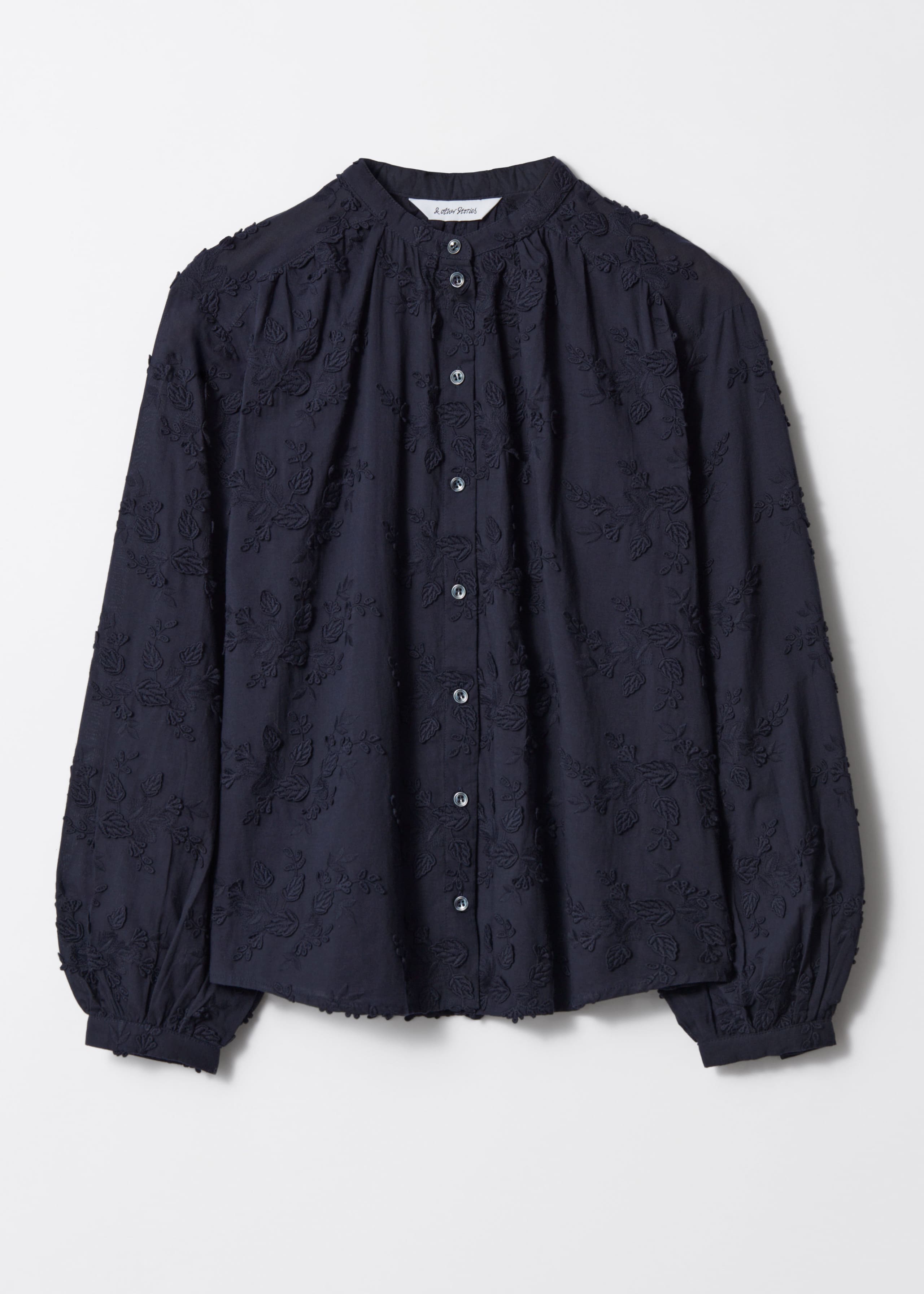 Voluminös blus med ståkrage, blomapplikationer och långa ärmar med rynk vid ärmsluten.